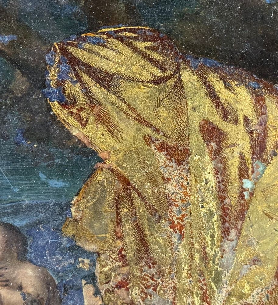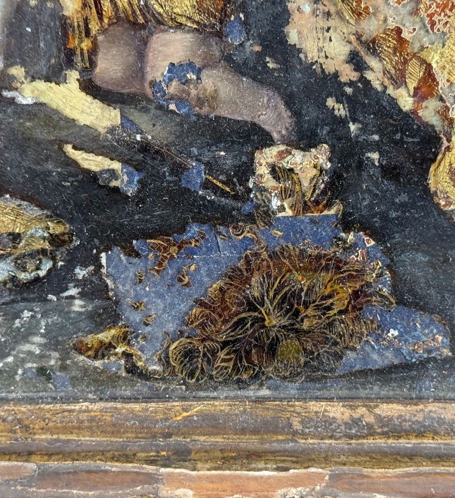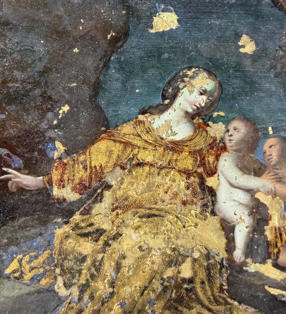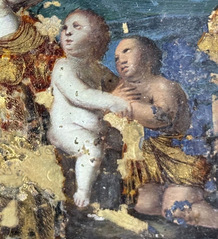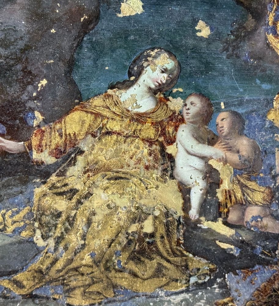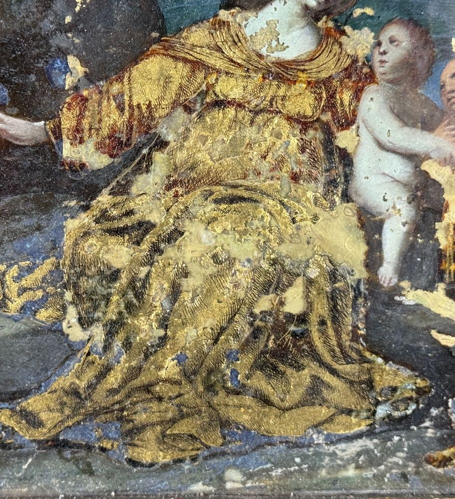 Reverse glass painting, 17th century, Italian school, depicting the Virgin Mary, Jesus, and Saint John the Baptist (San Giovannino). Dimensions including frame: 36x30 cm. Inner frame dimensions: 29x23.5 cm. Anonymous artist. The artwork is in fair condition, as shown in the attached photos.