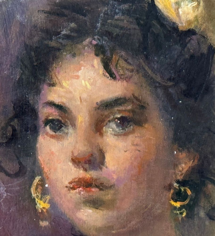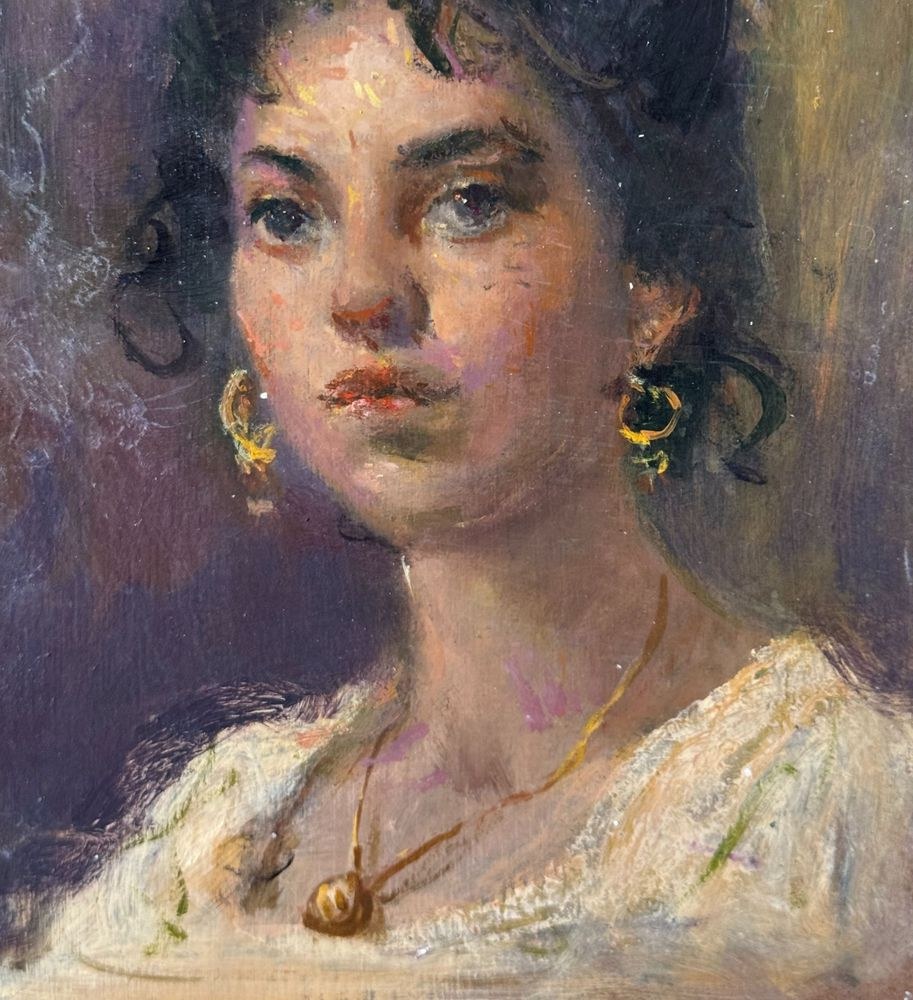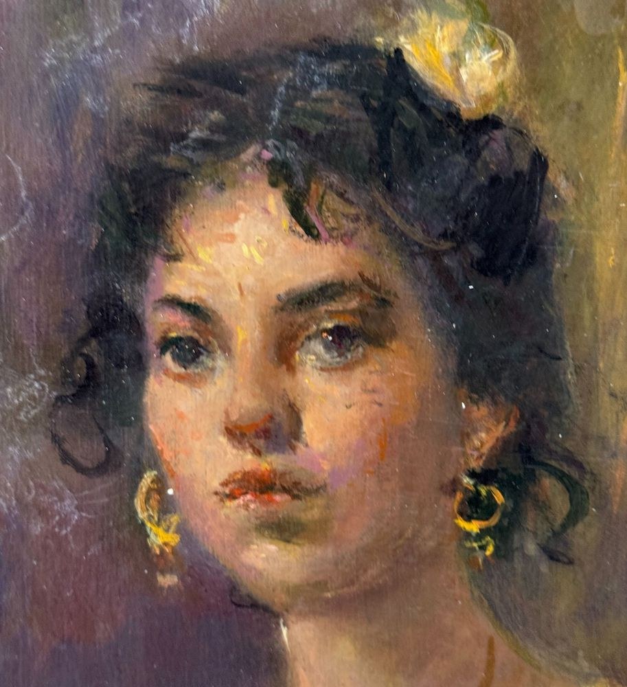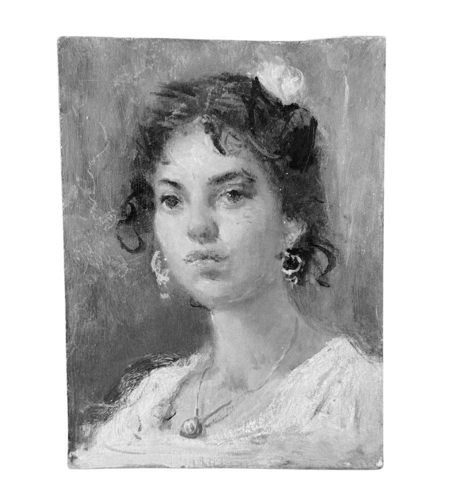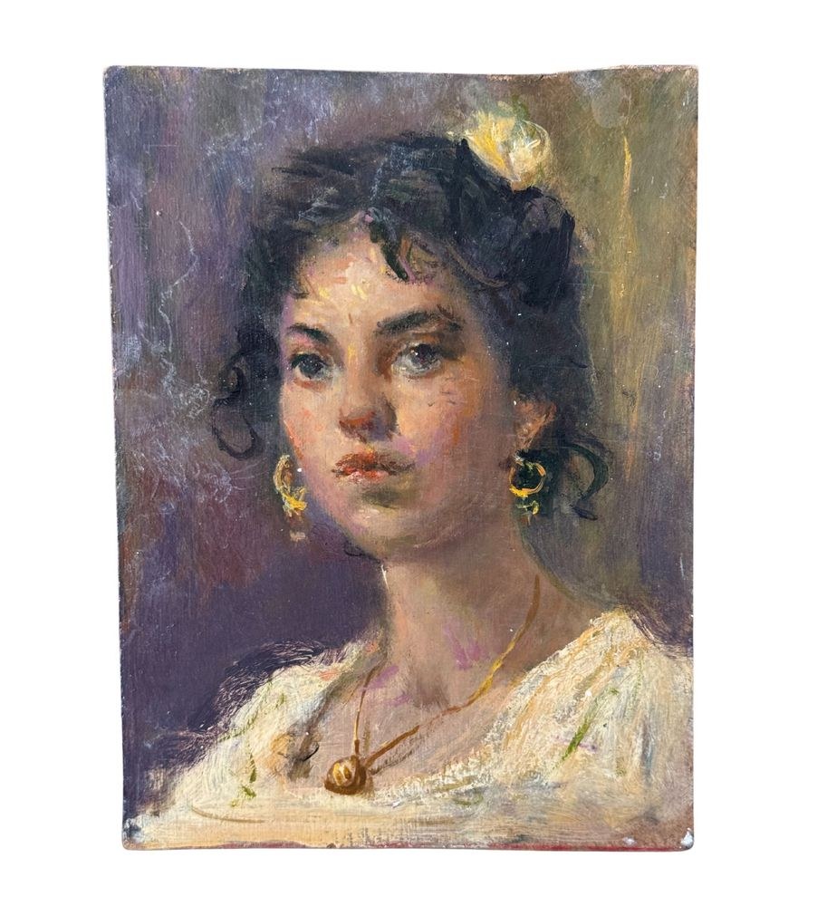 Oil painting on panel, 20th-century Italian school, depicting a Woman's Face. Dimensions: 16.5x22 cm. By an anonymous artist. The artwork is in good condition.