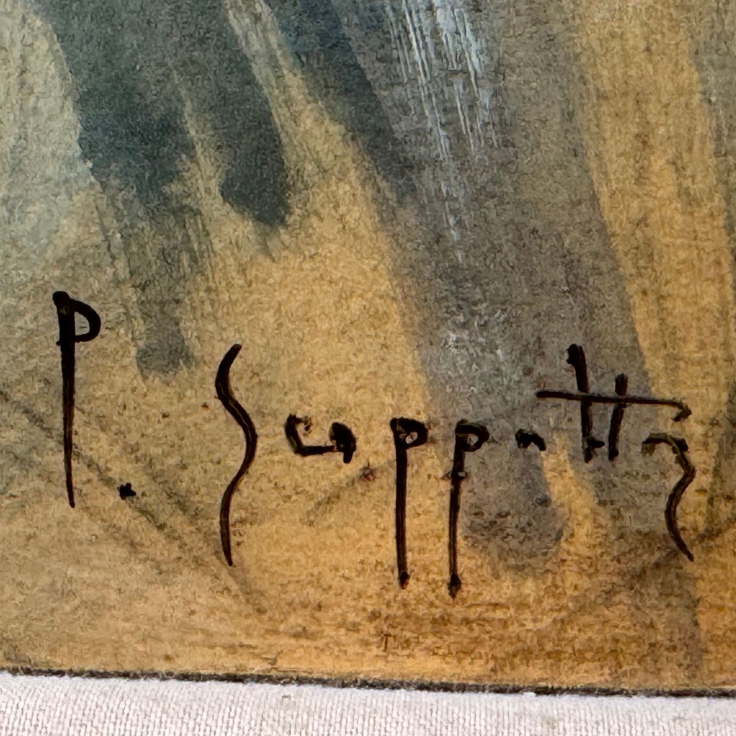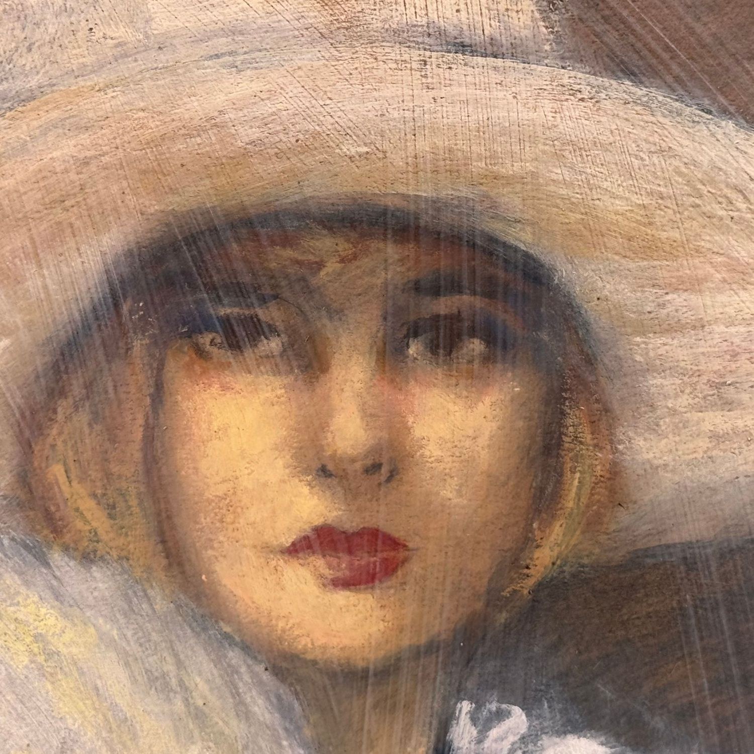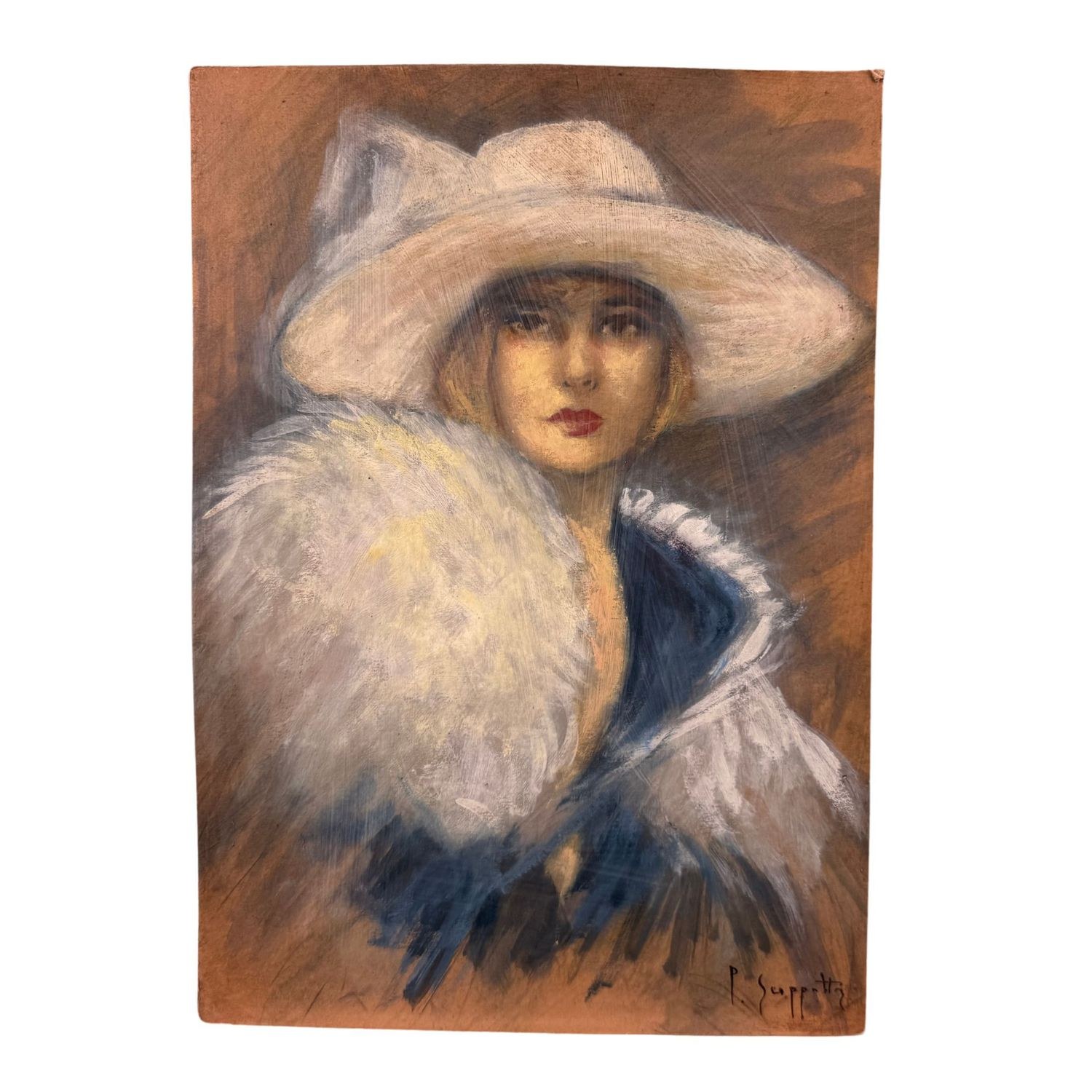 Oil painting on cardboard, 20th century, Italian school, depicting a woman with a hat.