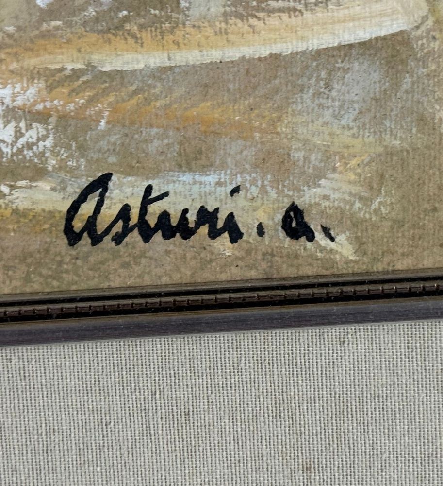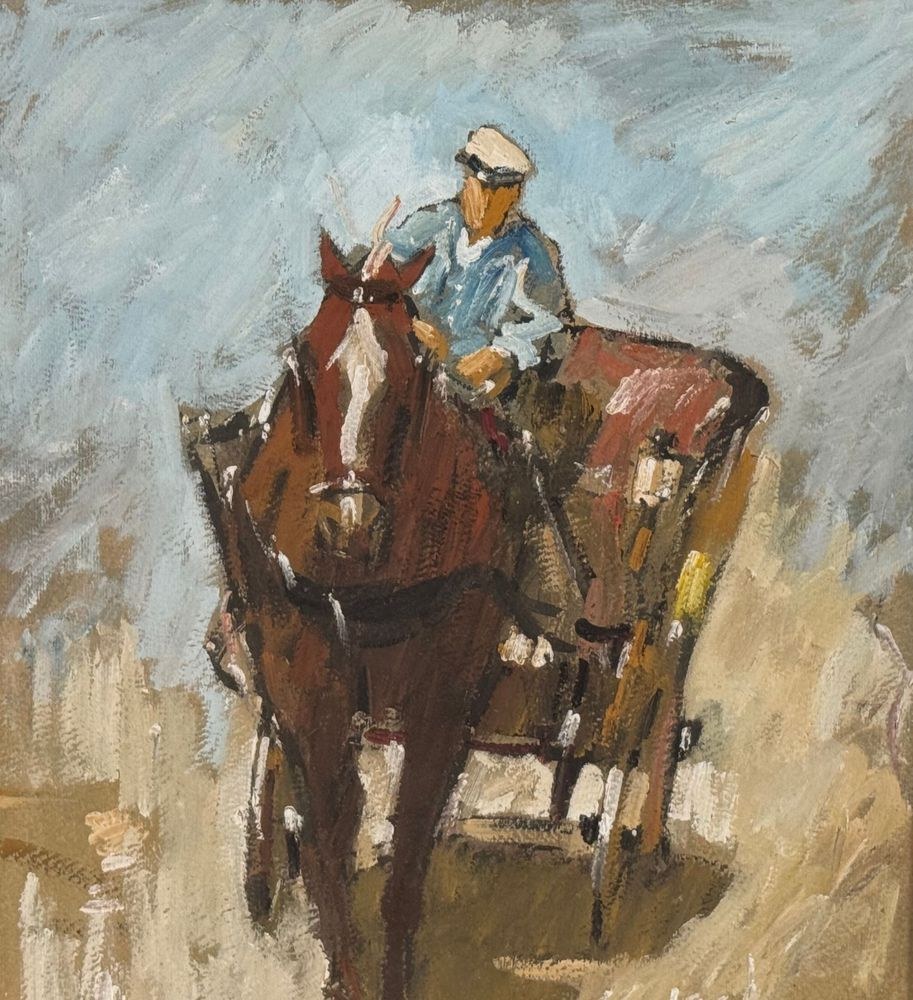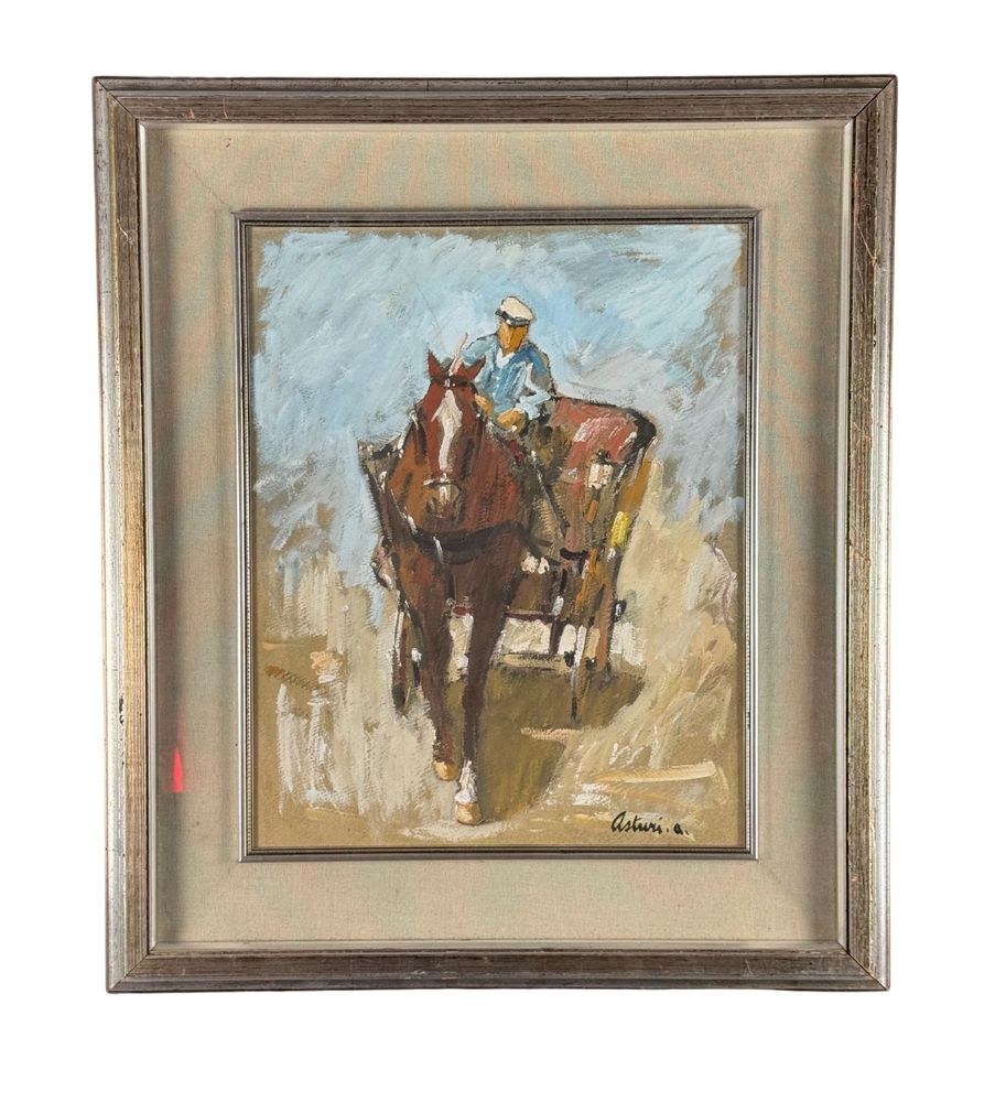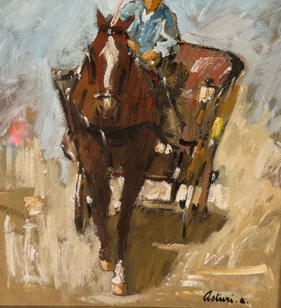 Oil painting on cardboard, 20th century, Italian school, depicting a Figure in a Carriage. Dimensions including frame: 63x72 cm. Inner frame dimensions: 40x50 cm. Signed lower right: Antonio Asturi. The artwork is in excellent condition.