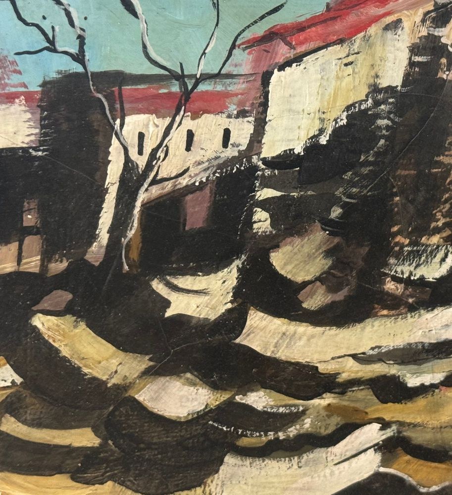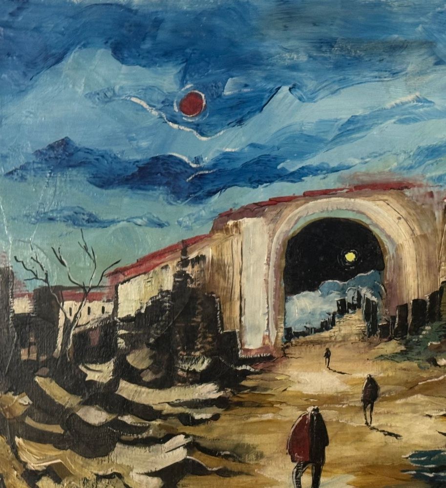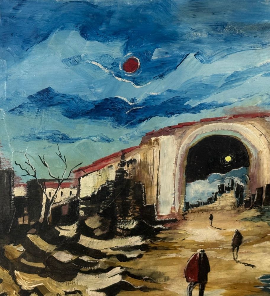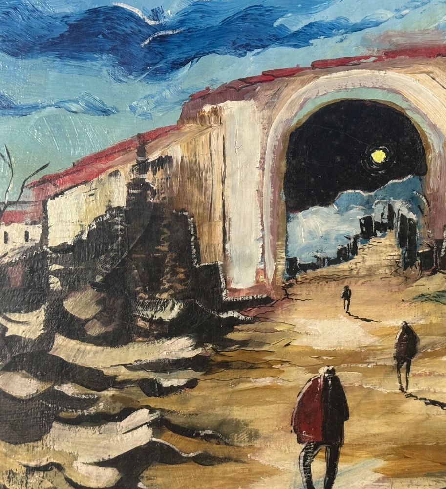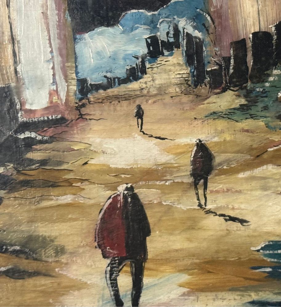 Oil painting on canvas applied to panel, 20th century Italian school, depicting a street with figures. Dimensions including frame: 66x76 cm. Inner frame dimensions: 48x58 cm. Signed upper right by Antonio Bertè. Work in good condition.