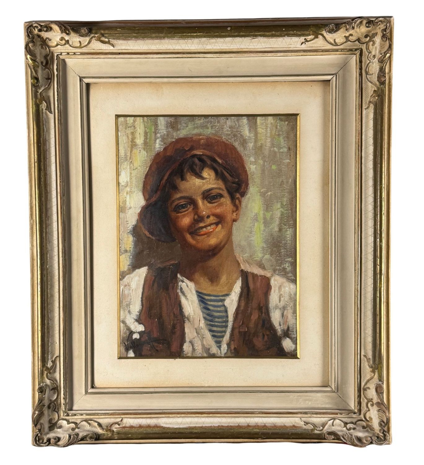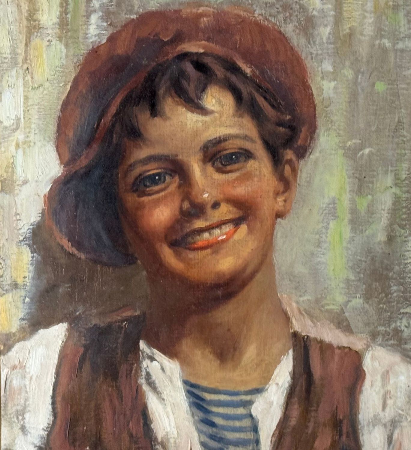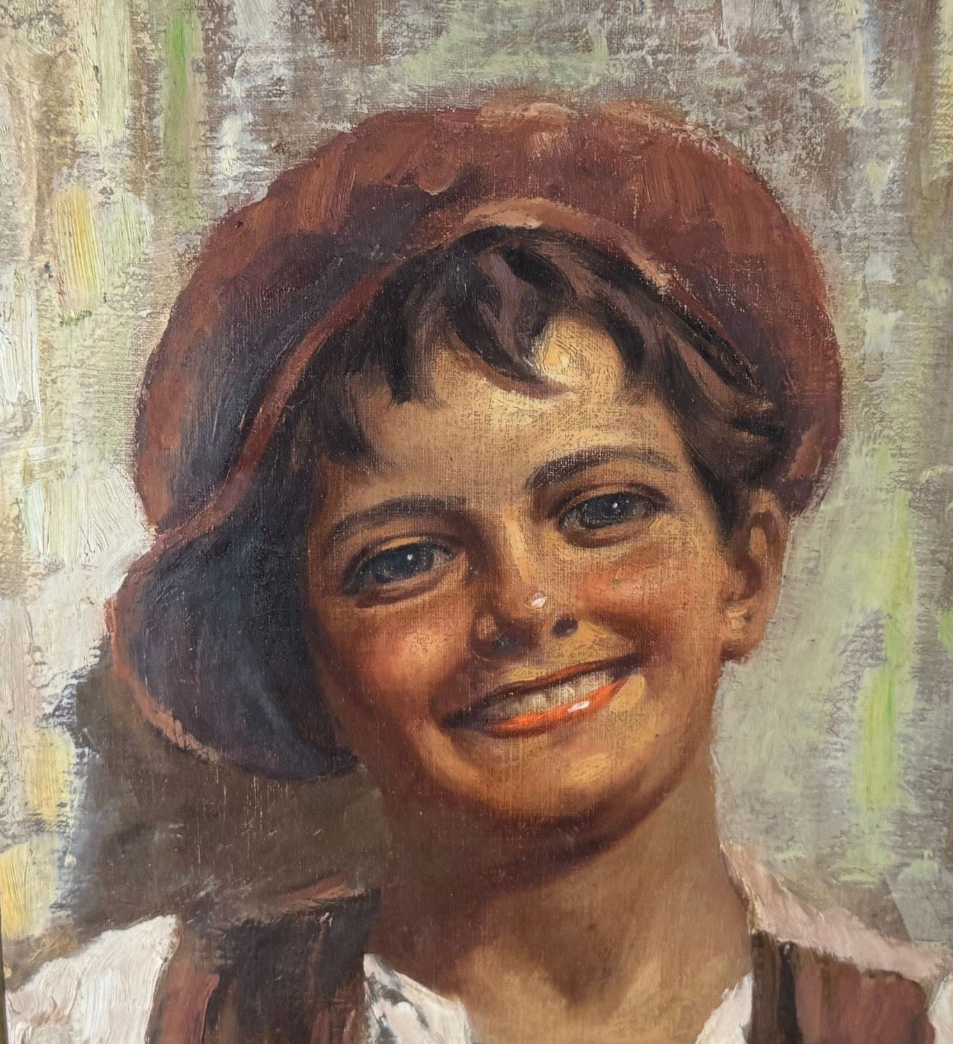 Oil painting on panel, 20th-century period, Italian school, depicting a portrait of a young person. Dimensions including frame: 59x69 cm. Dimensions inside the frame: 30x40 cm. Signed at the bottom left Antonio Vallone. Work in good condition.