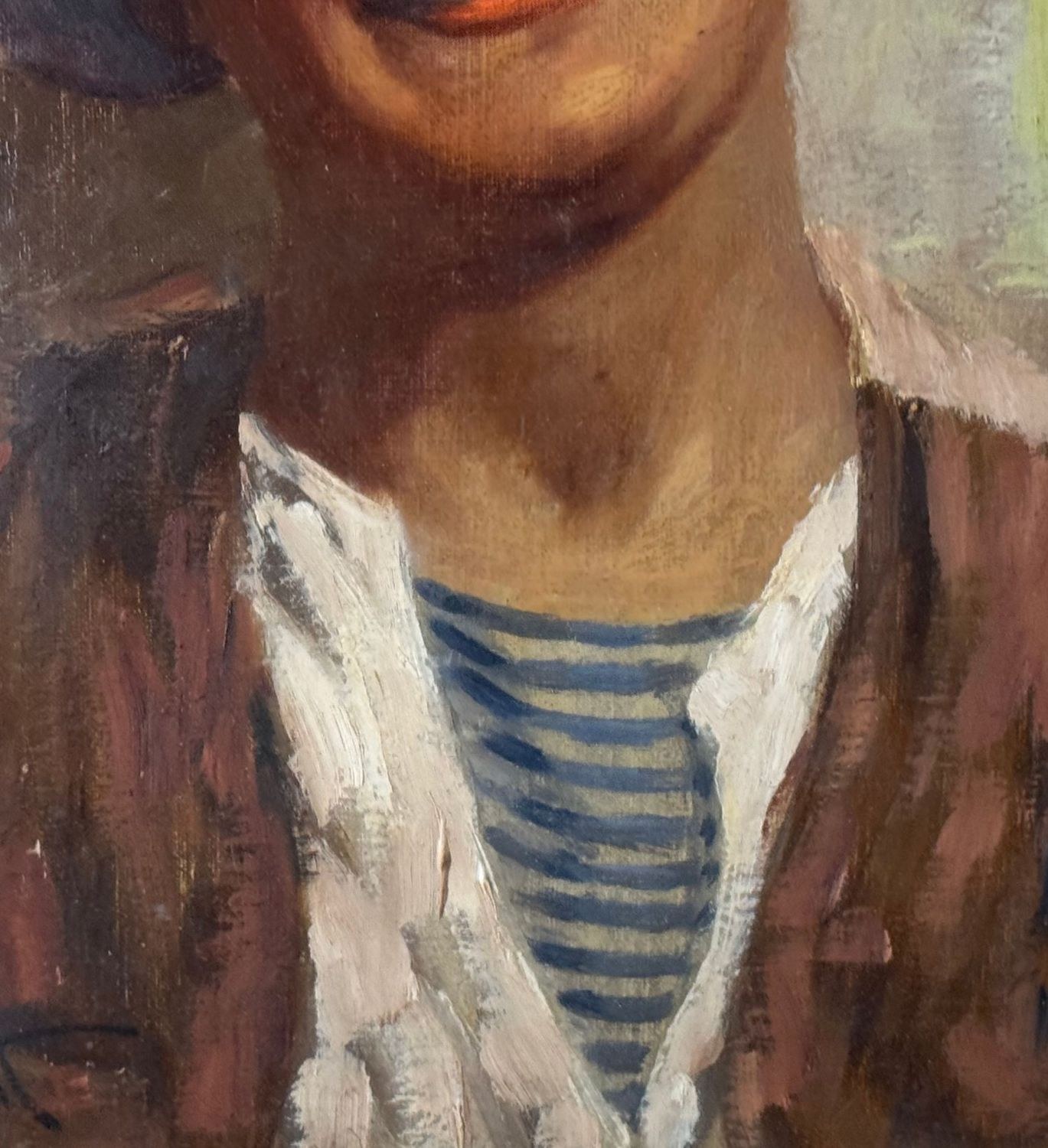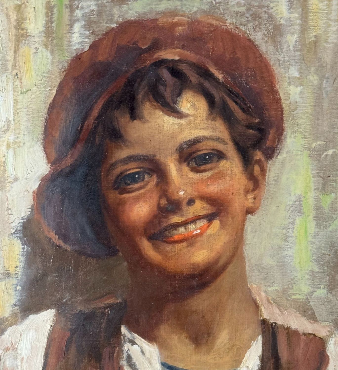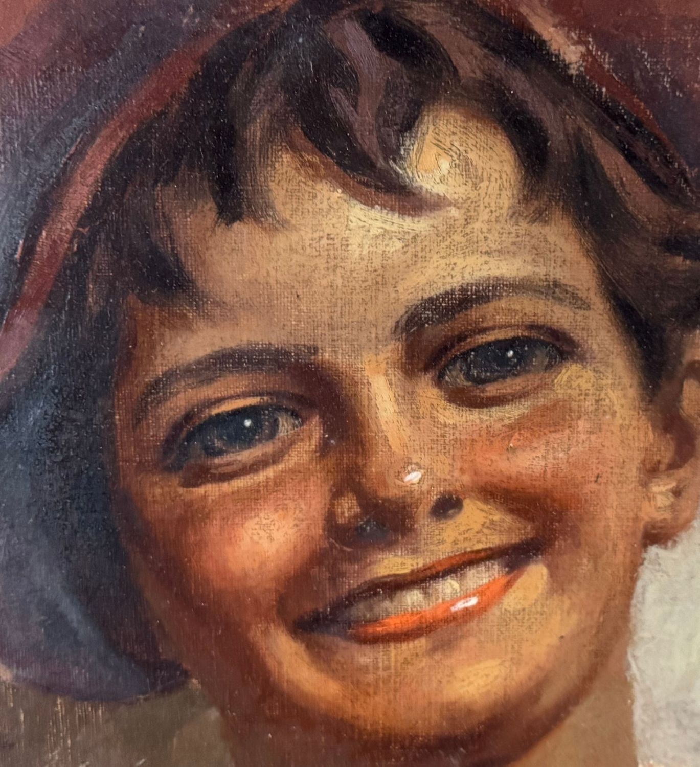 Oil painting on panel, 20th-century period, Italian school, depicting a portrait of a young person. Dimensions including frame: 59x69 cm. Dimensions inside the frame: 30x40 cm. Signed at the bottom left Antonio Vallone. Work in good condition.