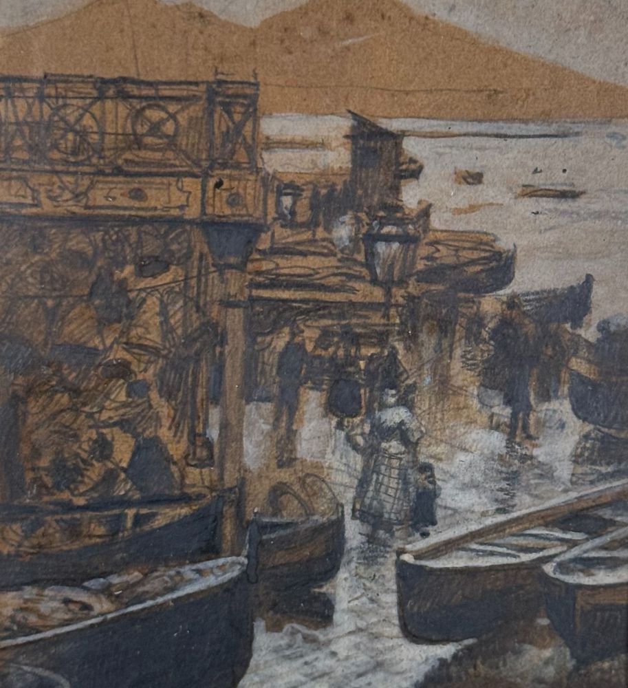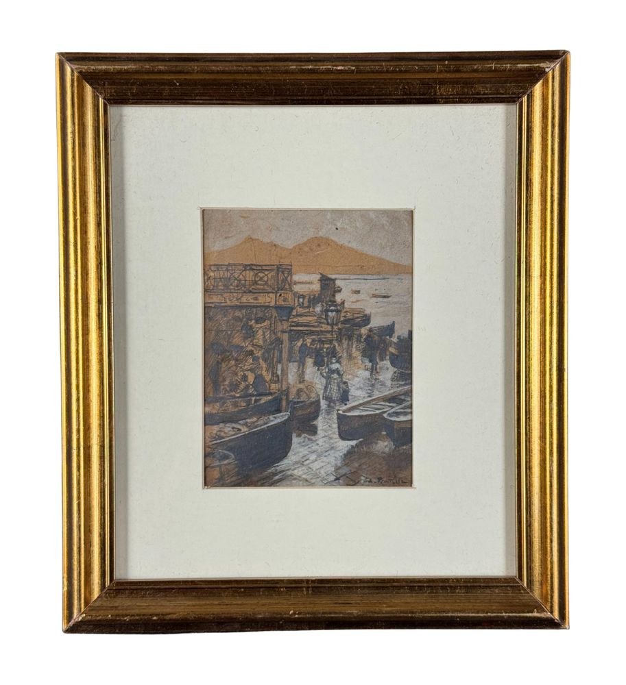 Mixed media on cardboard painting, 20th century period, Italian school, depicting a View of the Neapolitan Seaside with Figures. Dimensions including frame: 22x25 cm. Dimensions inside the frame: 9x12 cm. Signed lower right Attilio Pratella. Work in good condition.