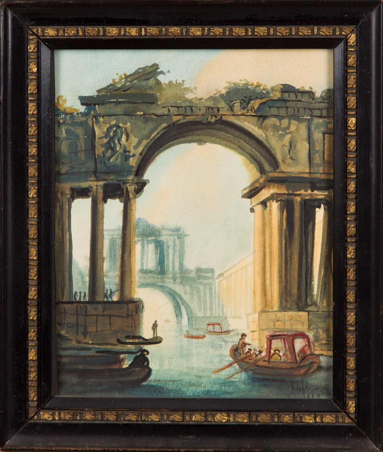 akwarela, tusz, pastel, papier, 21 x 17 cm (w świetle oprawy); sygn. i dat. p. d. (nieczytelnie); praca oprawiona