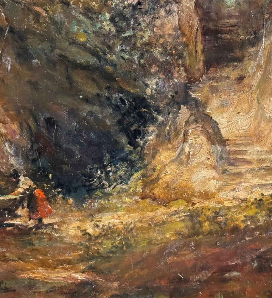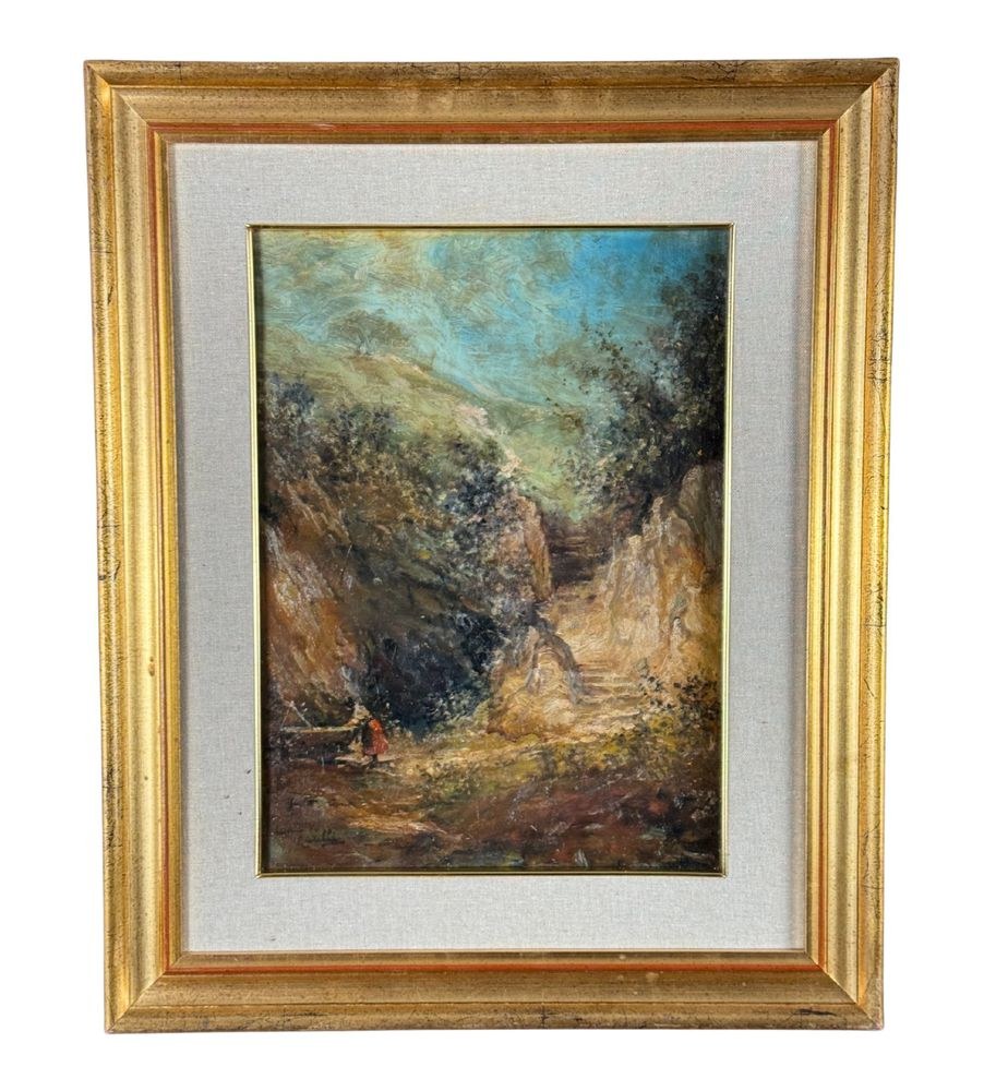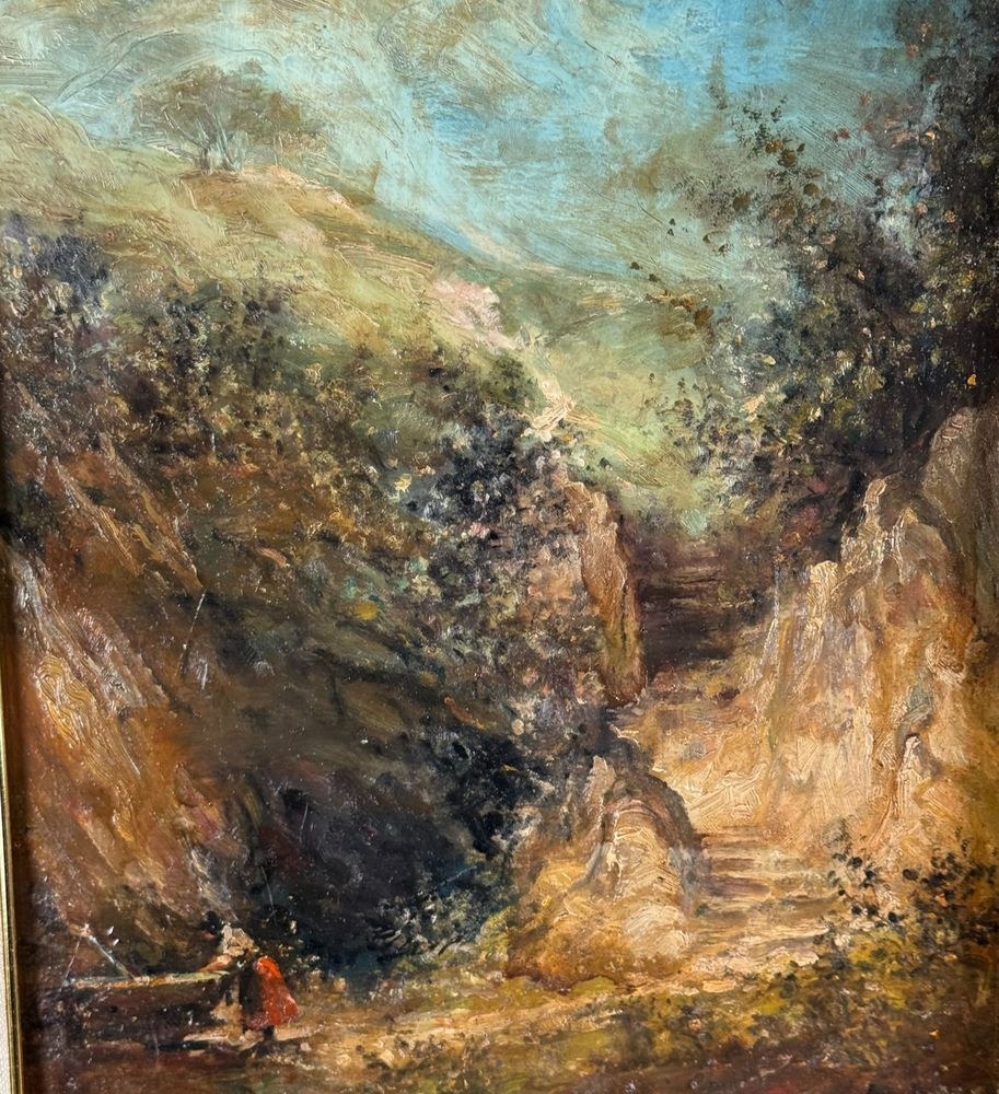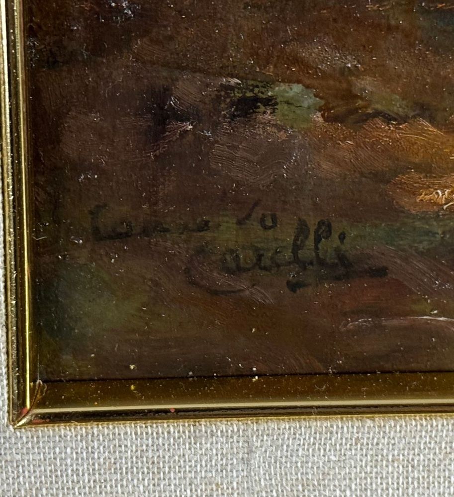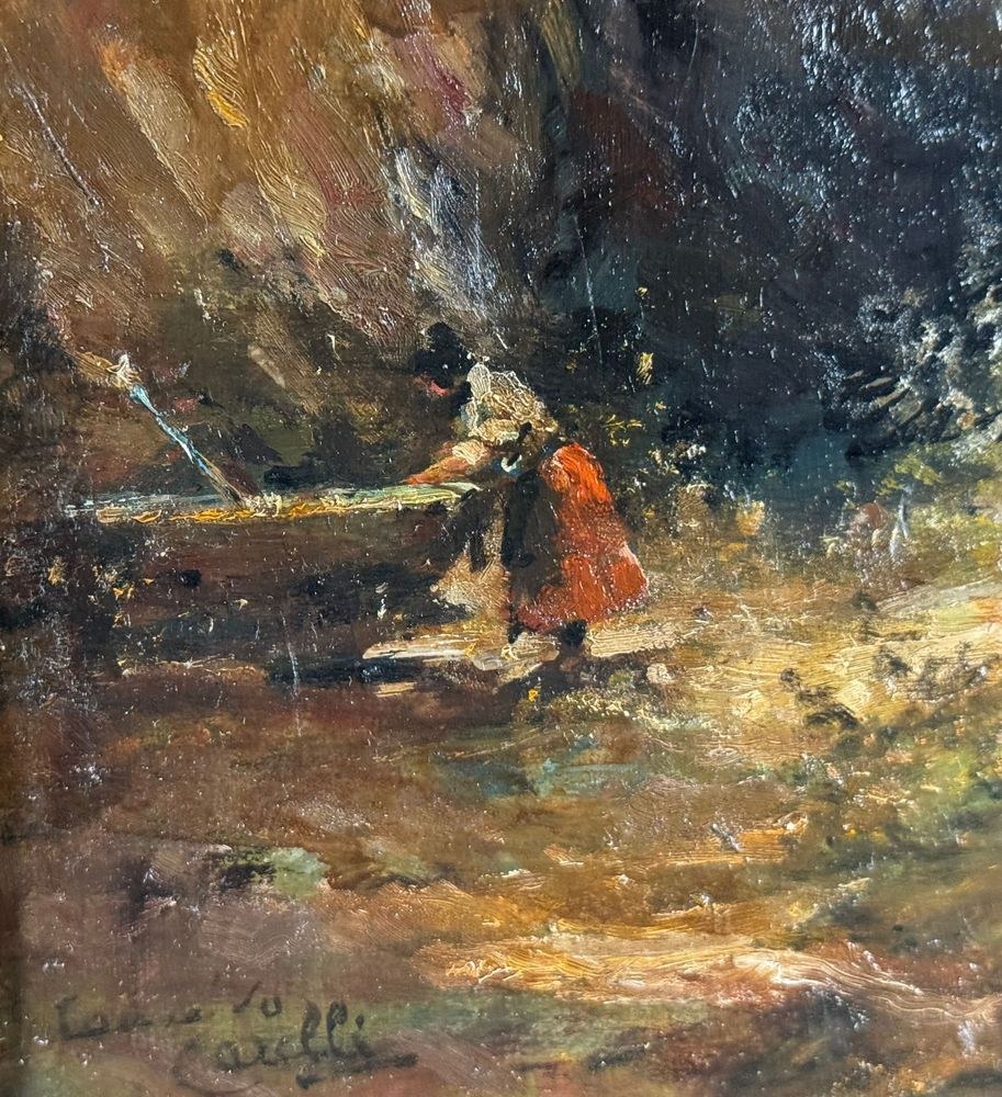 Oil painting on panel, 19th century, Italian school, depicting a landscape with a woman at a fountain. Dimensions including frame: 45x55 cm. Inner frame dimensions: 29x40 cm. Signed lower left: Consalvo Carelli. The artwork is in good condition.