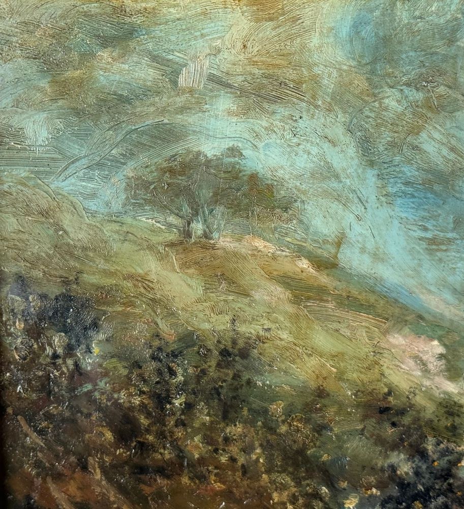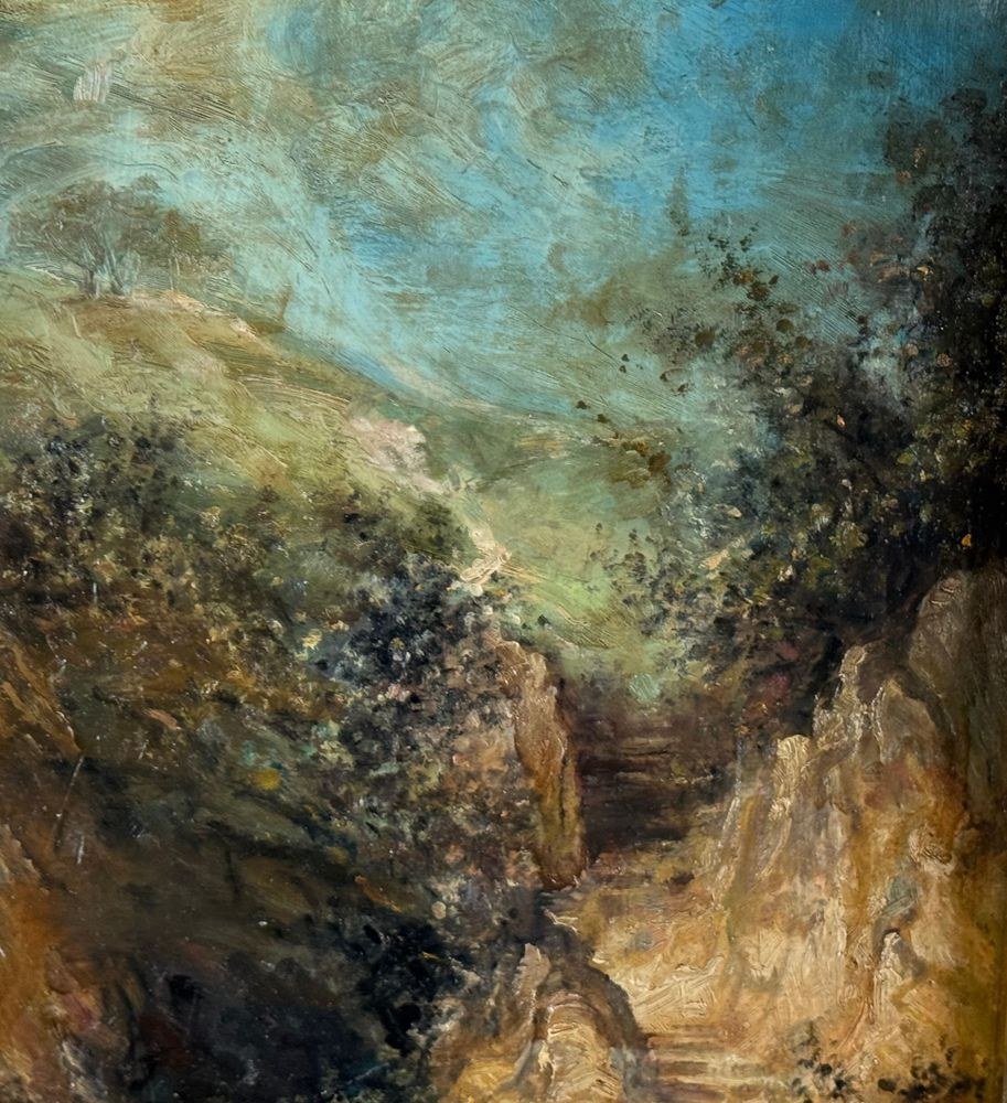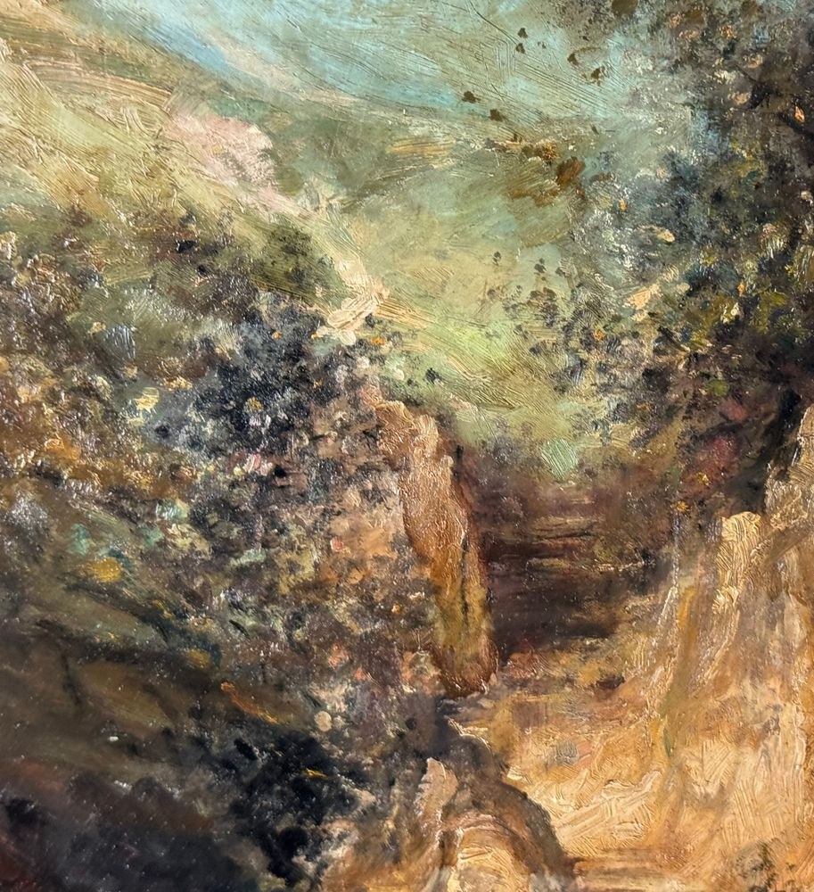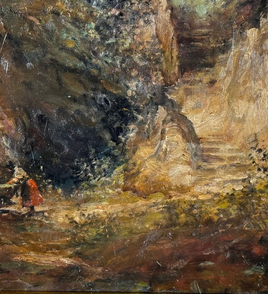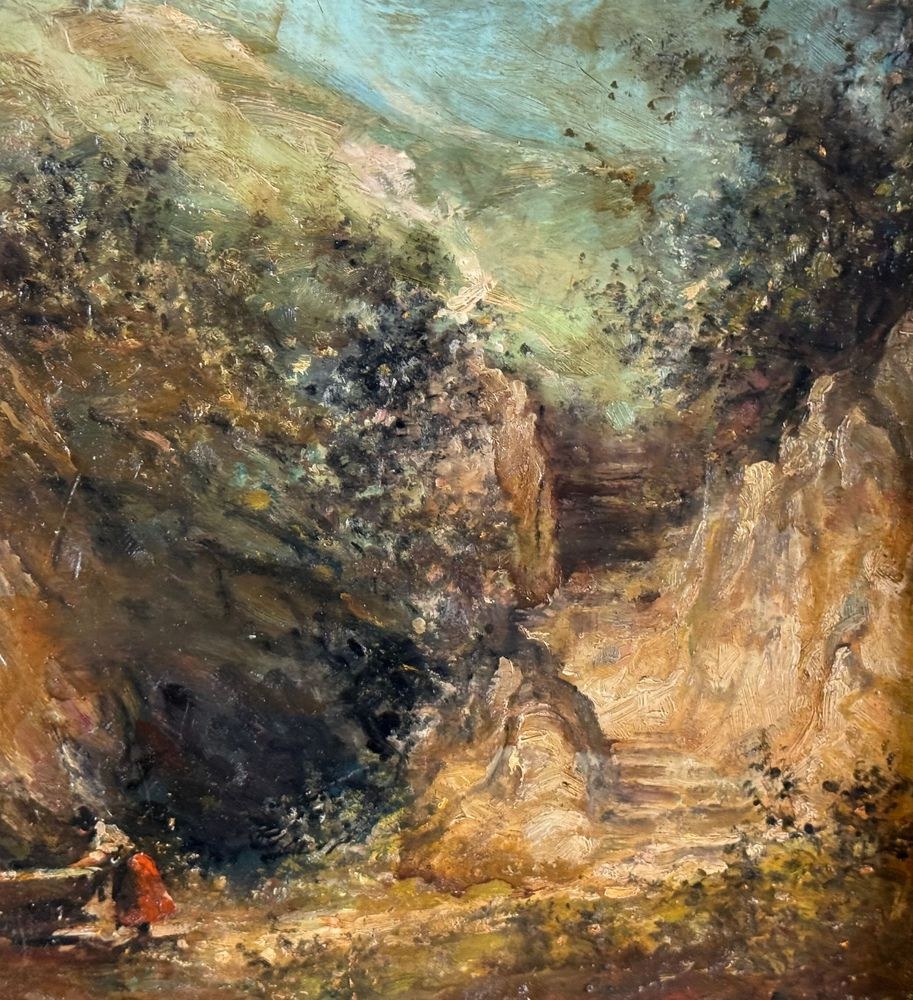 Oil painting on panel, 19th century, Italian school, depicting a landscape with a woman at a fountain. Dimensions including frame: 45x55 cm. Inner frame dimensions: 29x40 cm. Signed lower left: Consalvo Carelli. The artwork is in good condition.