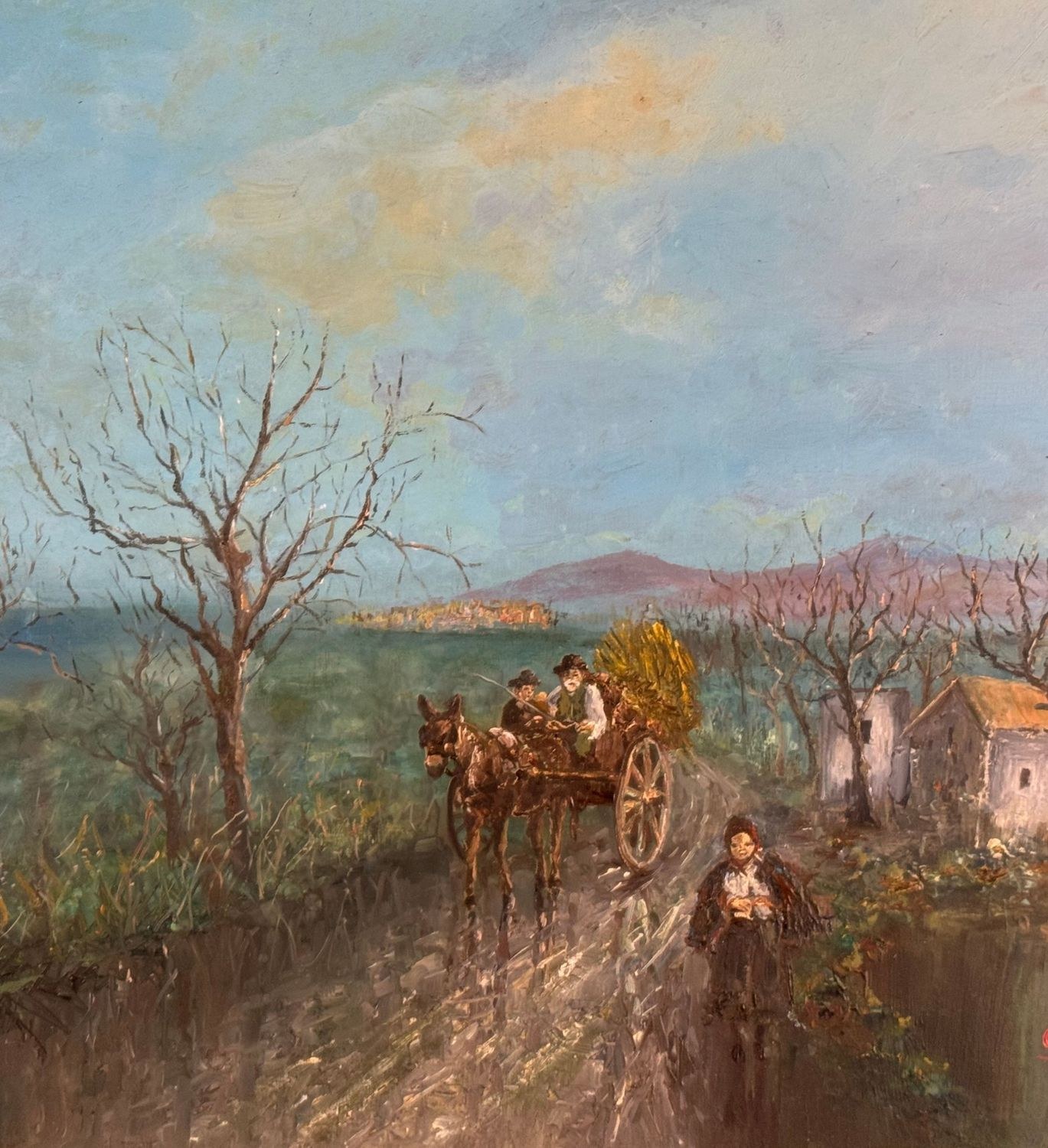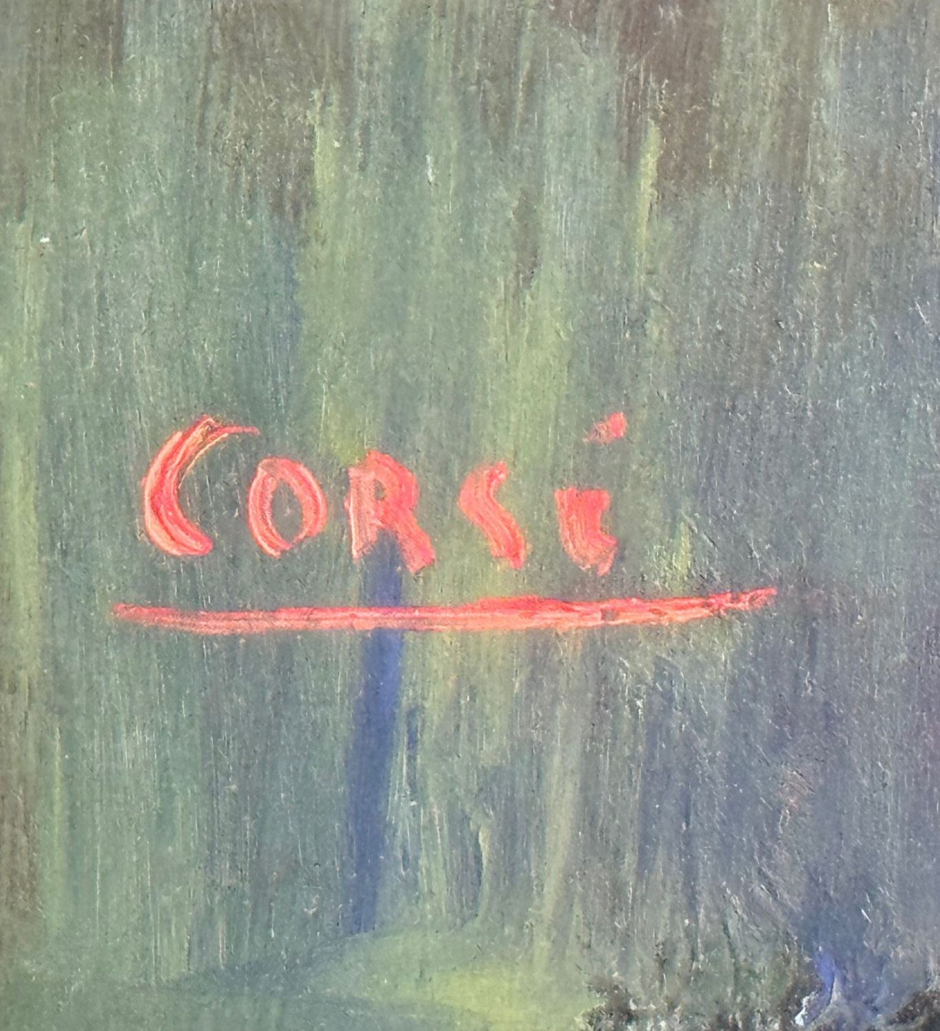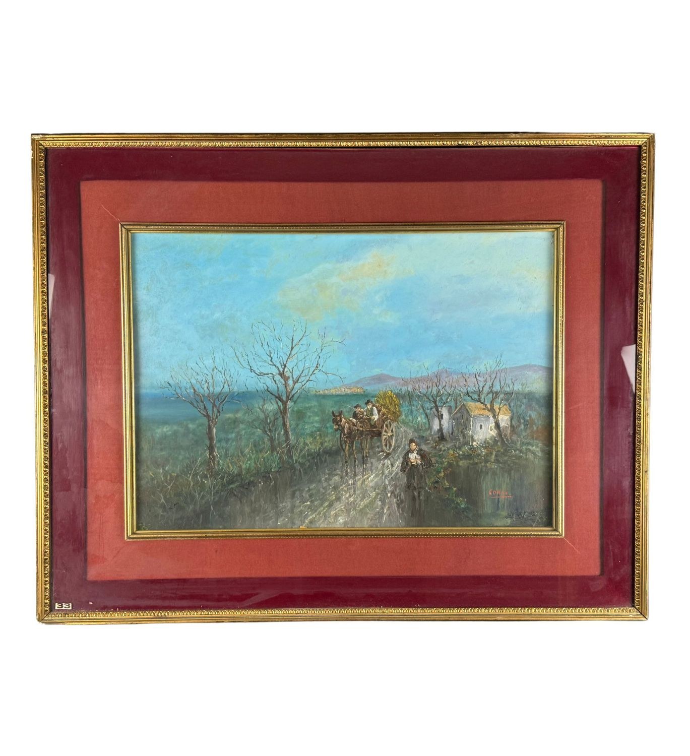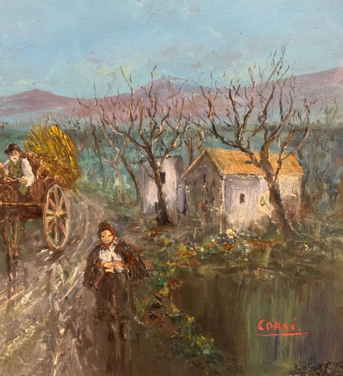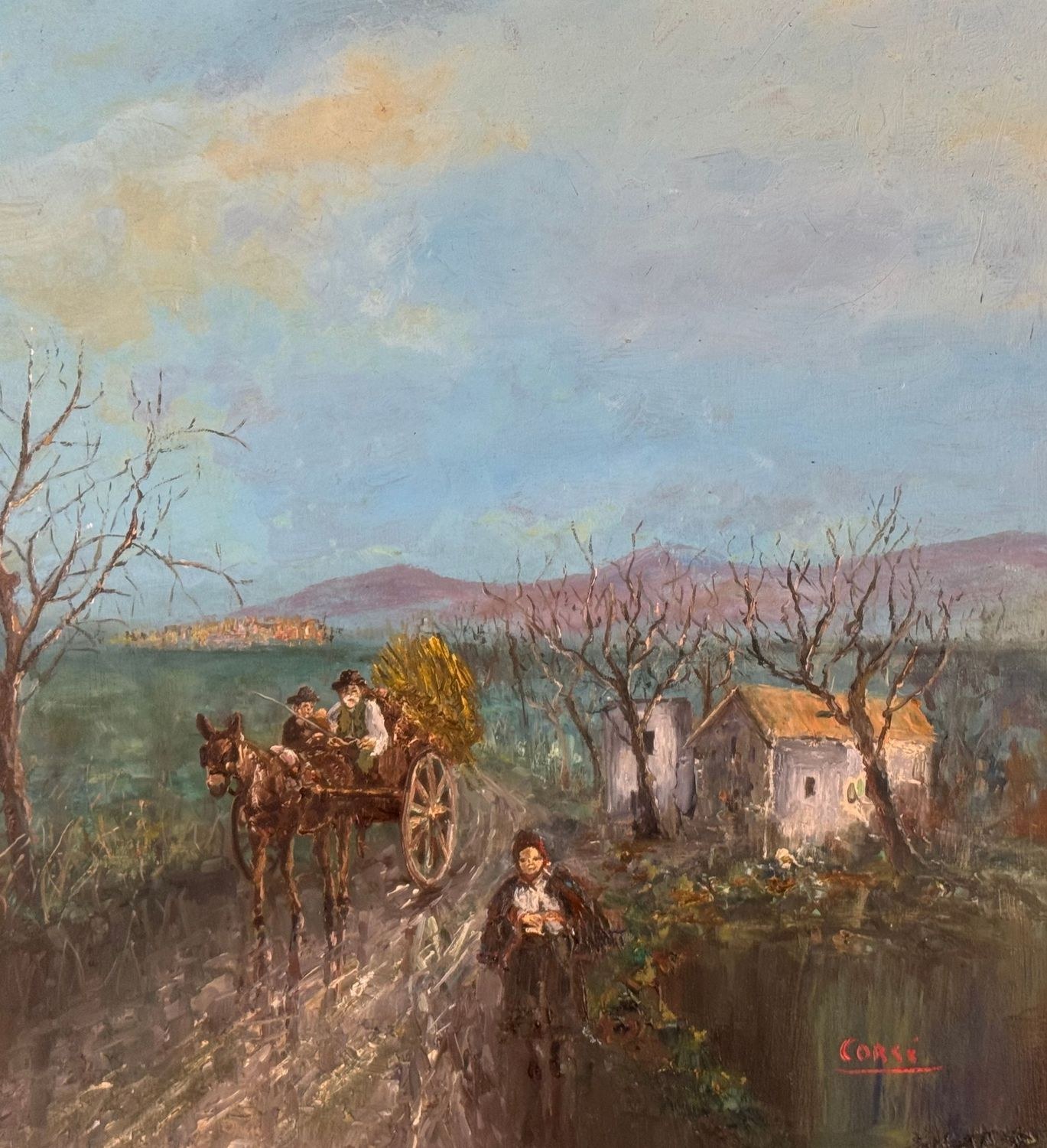 Oil painting on panel, 20th-century Italian school, depicting a country road with figures. Dimensions including the frame: 99x78 cm. Inner frame dimensions: 70x50 cm. Signed in the lower right corner by Corsi. The artwork is in good condition.
