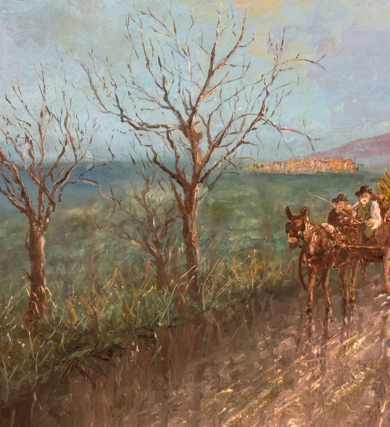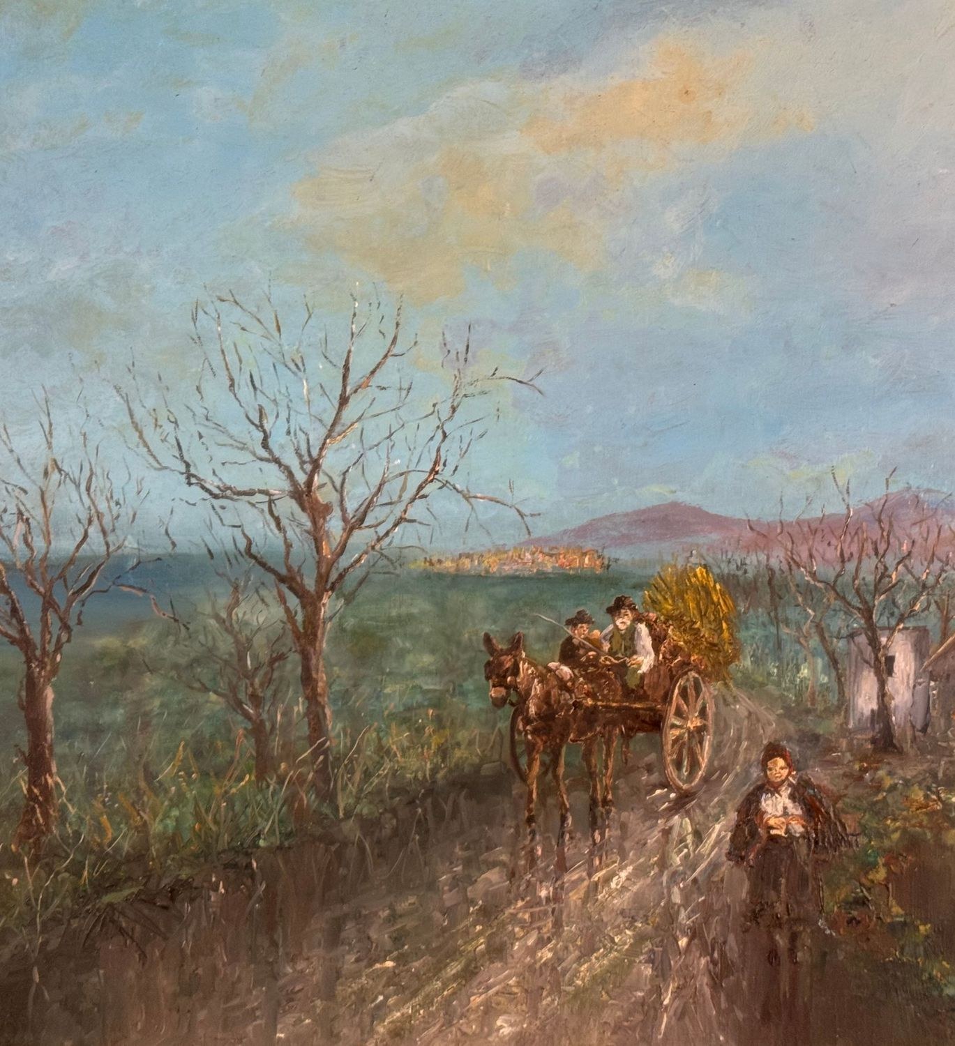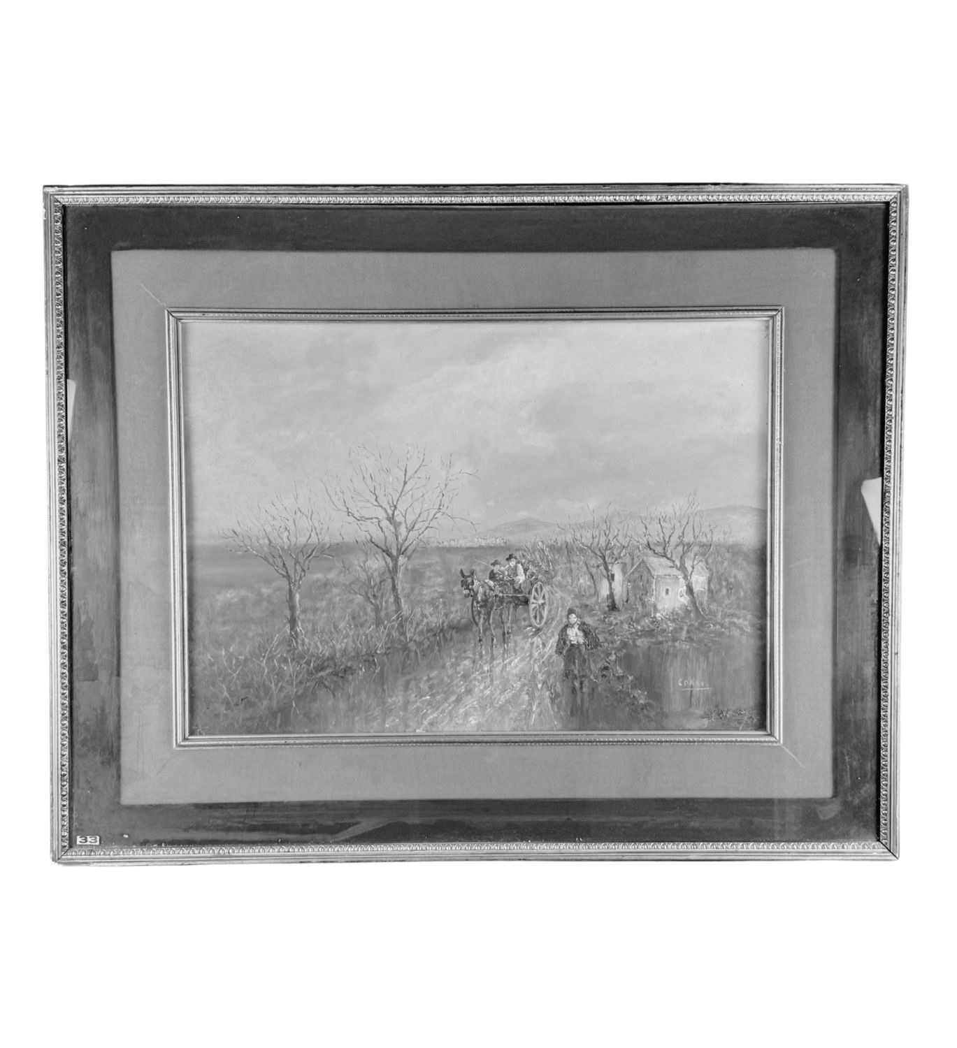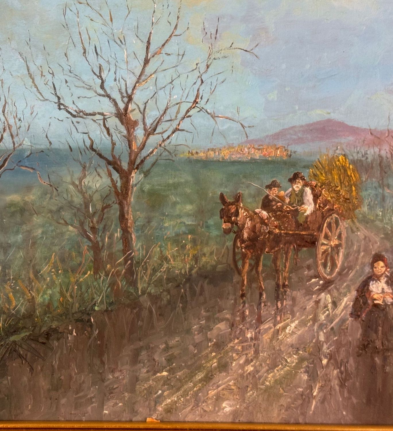 Oil painting on panel, 20th-century Italian school, depicting a country road with figures. Dimensions including the frame: 99x78 cm. Inner frame dimensions: 70x50 cm. Signed in the lower right corner by Corsi. The artwork is in good condition.
