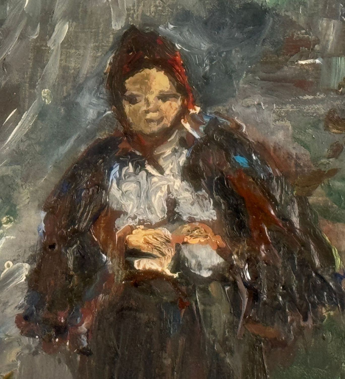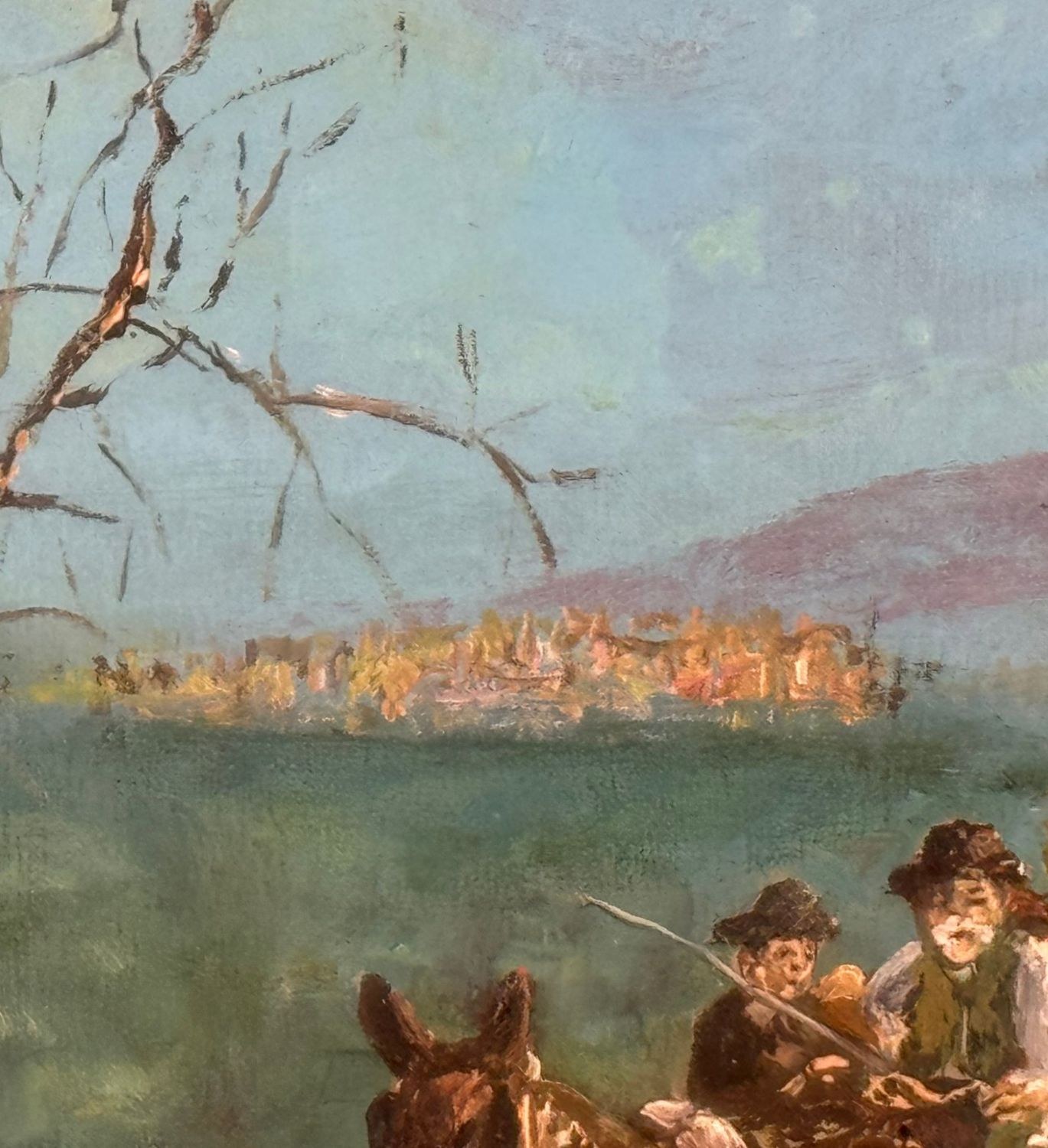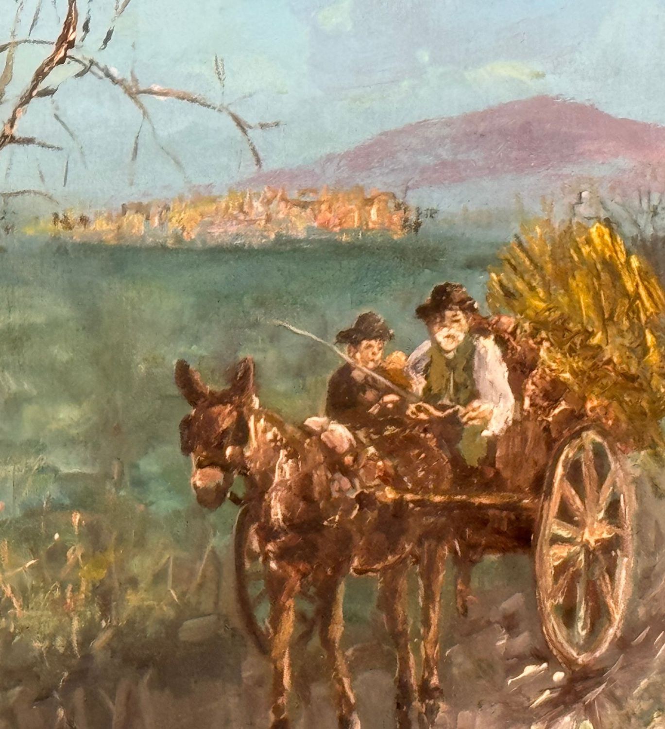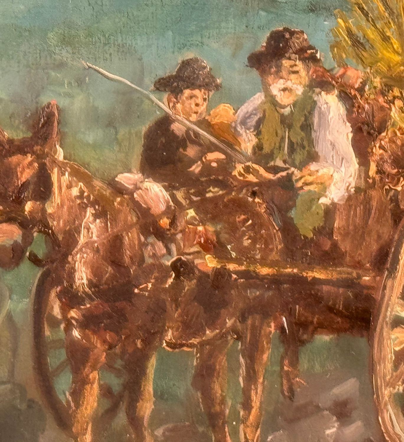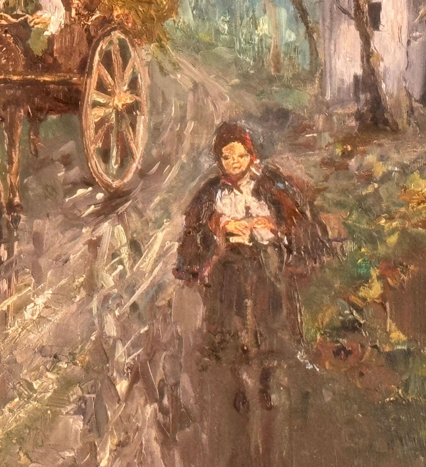 Oil painting on panel, 20th-century Italian school, depicting a country road with figures. Dimensions including the frame: 99x78 cm. Inner frame dimensions: 70x50 cm. Signed in the lower right corner by Corsi. The artwork is in good condition.