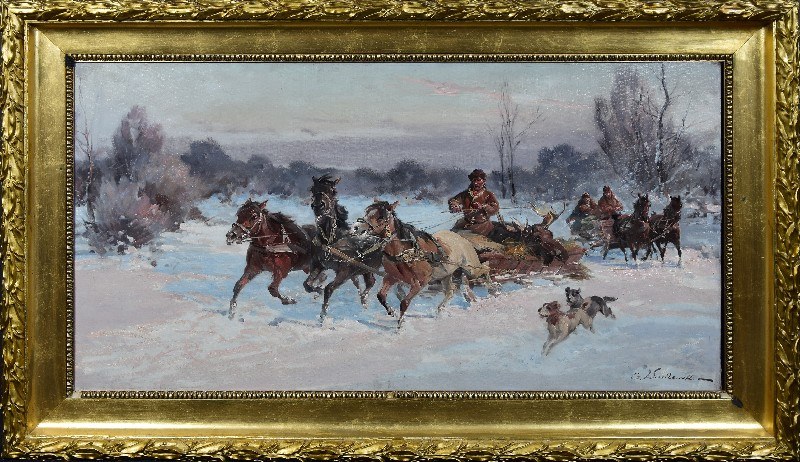 na odwrocie na blejtramie nalepka z Salonu Obrazów Juljana Burofa w Warszawa przy ul. Nowy Świat 47 z autorem i tytułem obrazu: Z polowania oraz datą 18. X. 06.