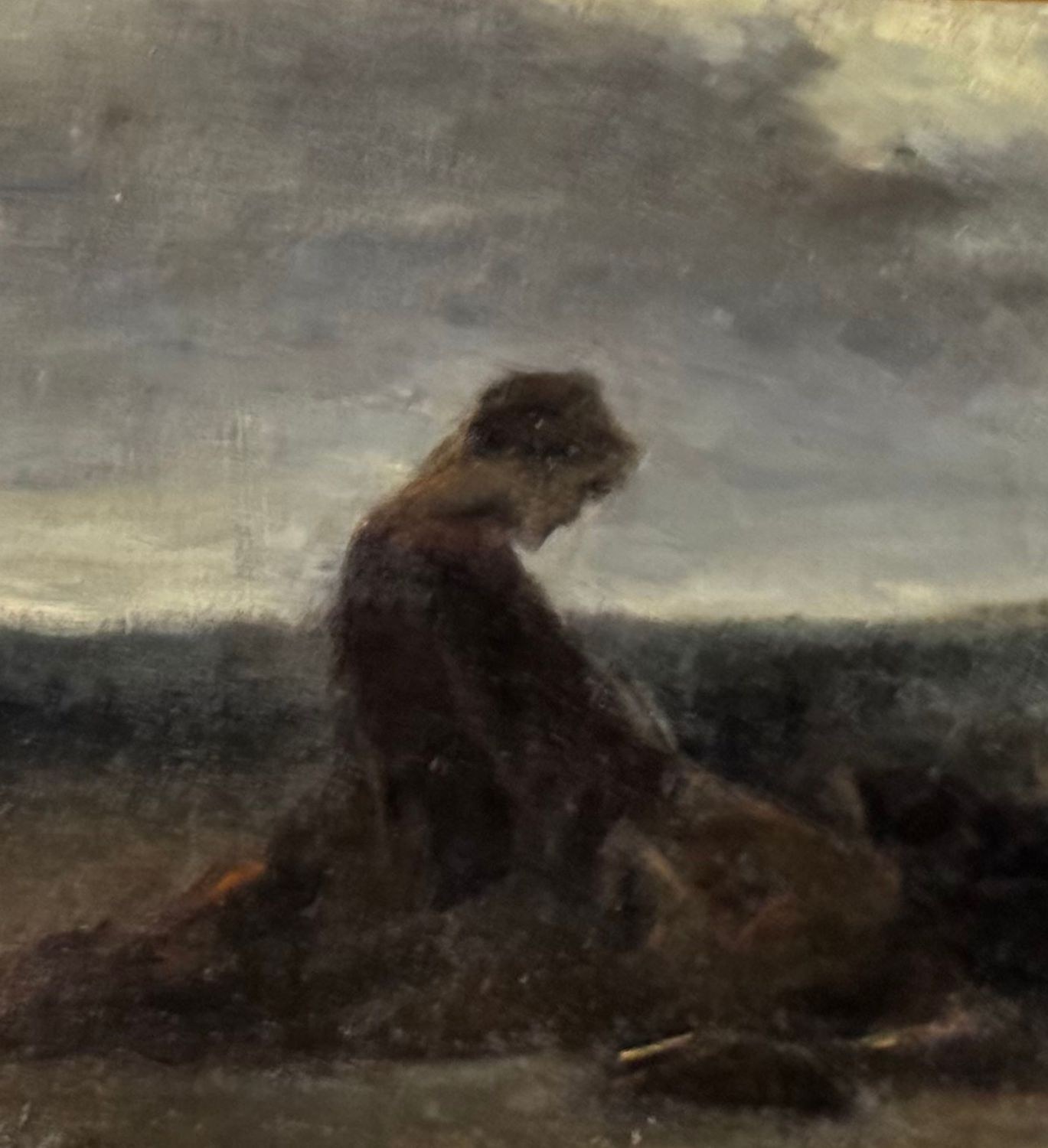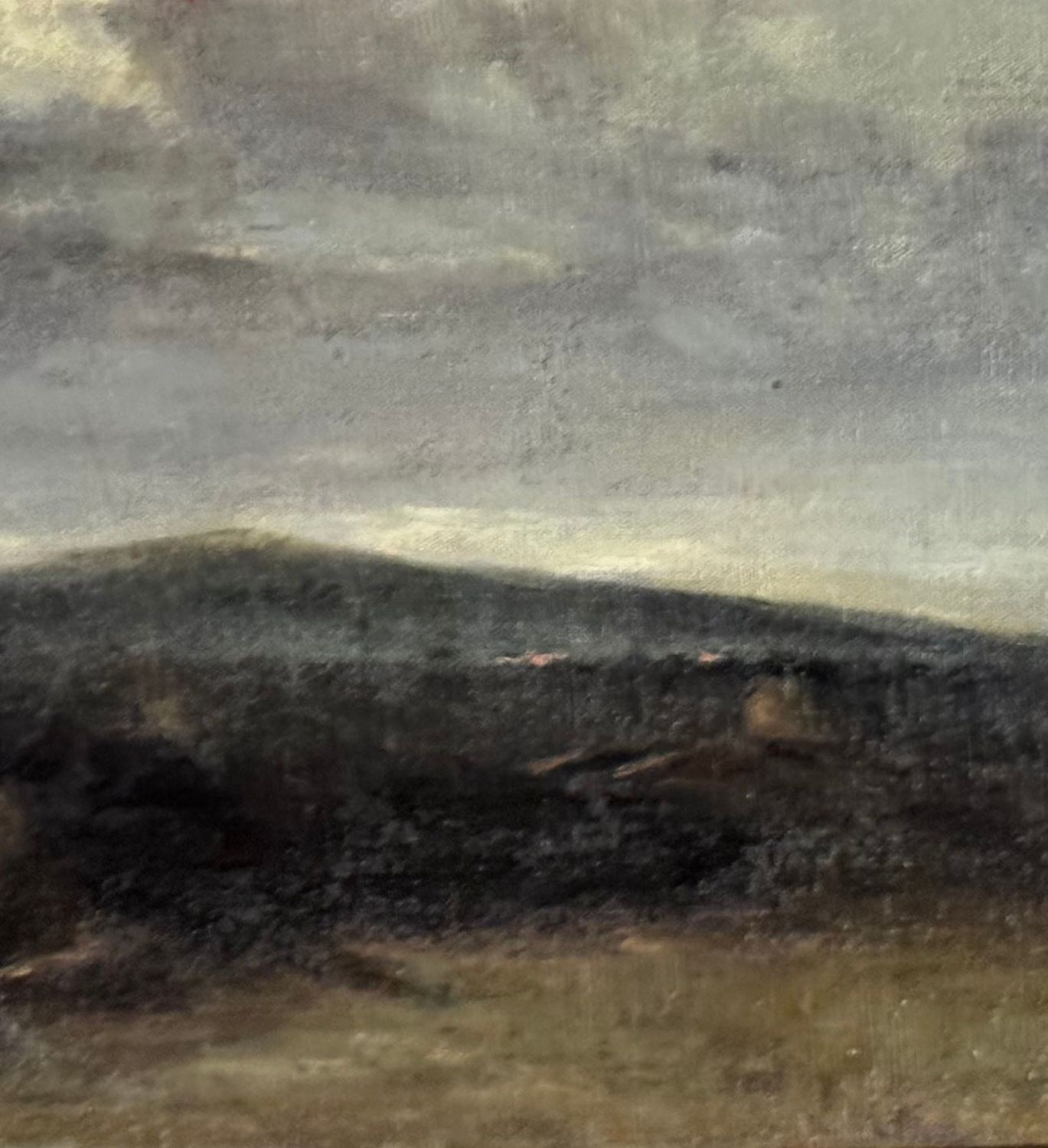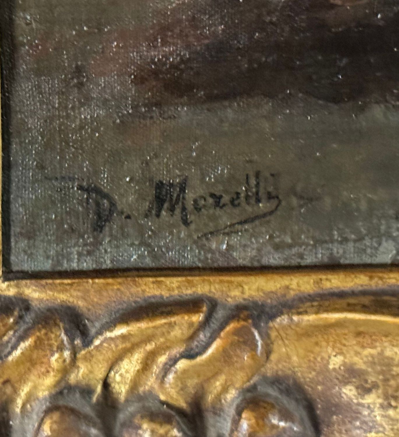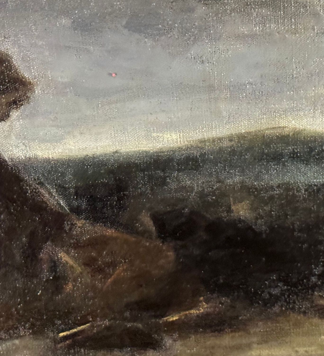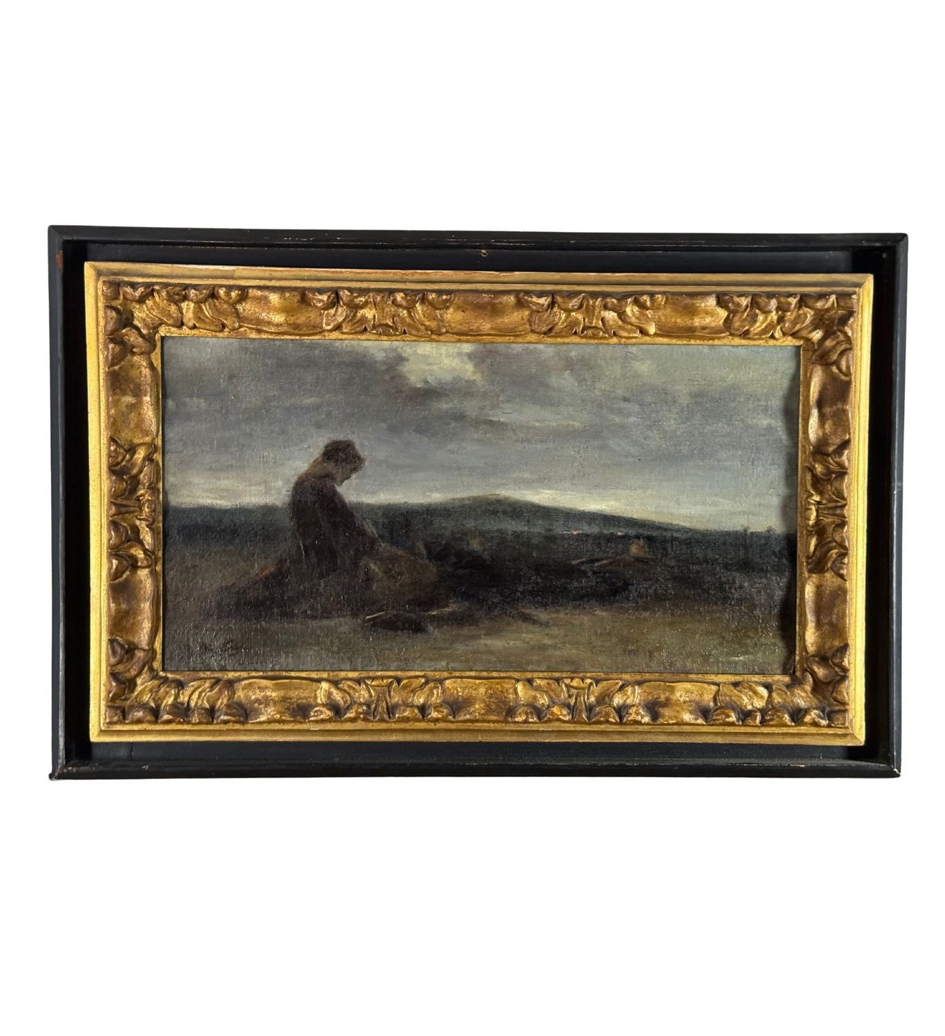Oil on canvas mounted on cardboard, 19th century, Italian school, depicting a landscape with a figure. Dimensions including frame: 61 × 39 cm. Inner frame dimensions: 45 × 25 cm. Signed lower left Domenico Morelli (1826–1901). The artwork is in good condition, with light signs of age and wear, as shown in the attached photos.