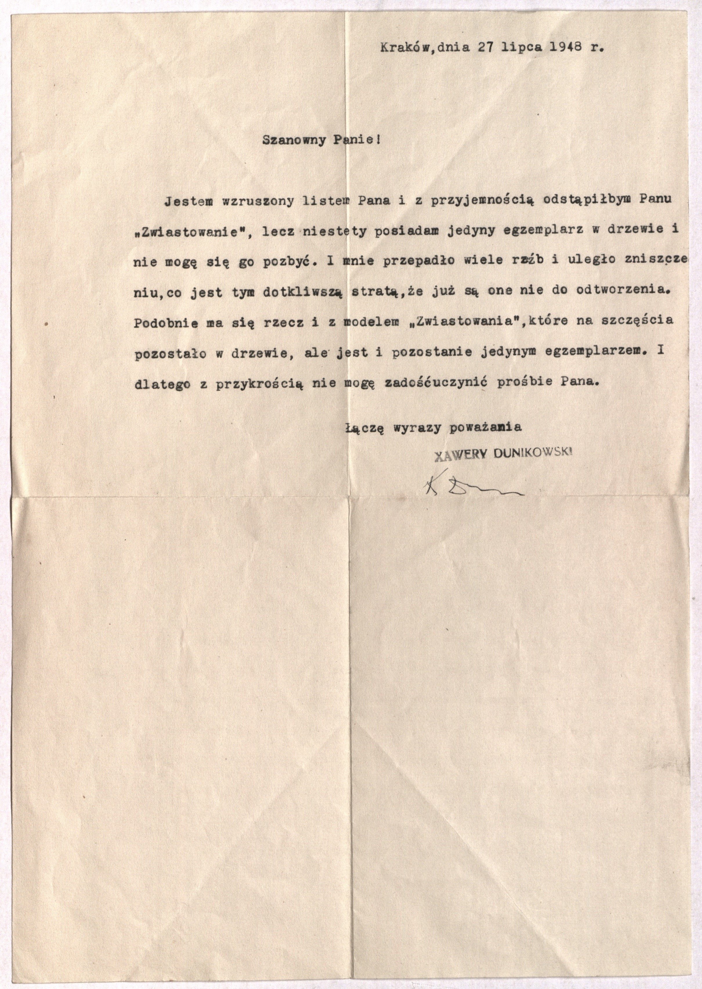 DUNIKOWSKI Xawery. List z dn. 27 lipca 1948 r.; maszynopis z odręcznym podpisem; korespondencja dotyczy rzeźby Zwiastowanie: […] I mnie przepadło wiele rzeźb i uległo zniszczeniu, co jest tym dotkliwszą stratą, że już są one nie do odtworzenia […]; st. bdb.; wym. 210x297 mm.