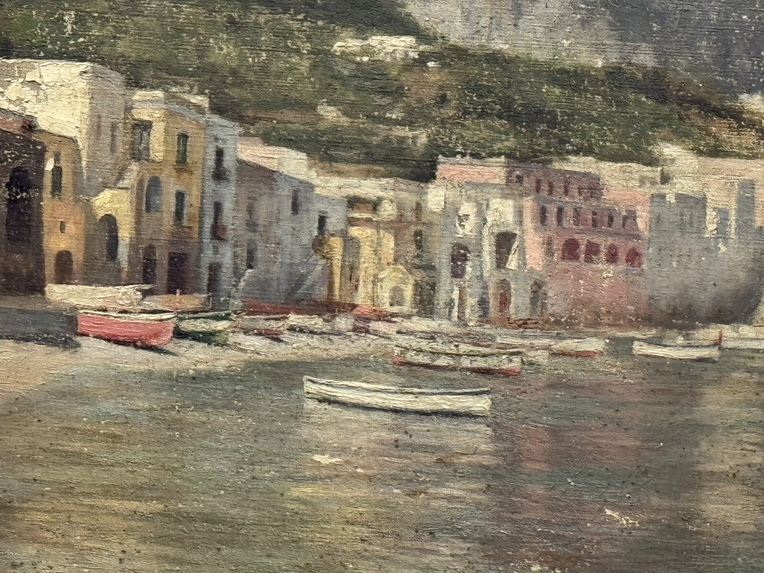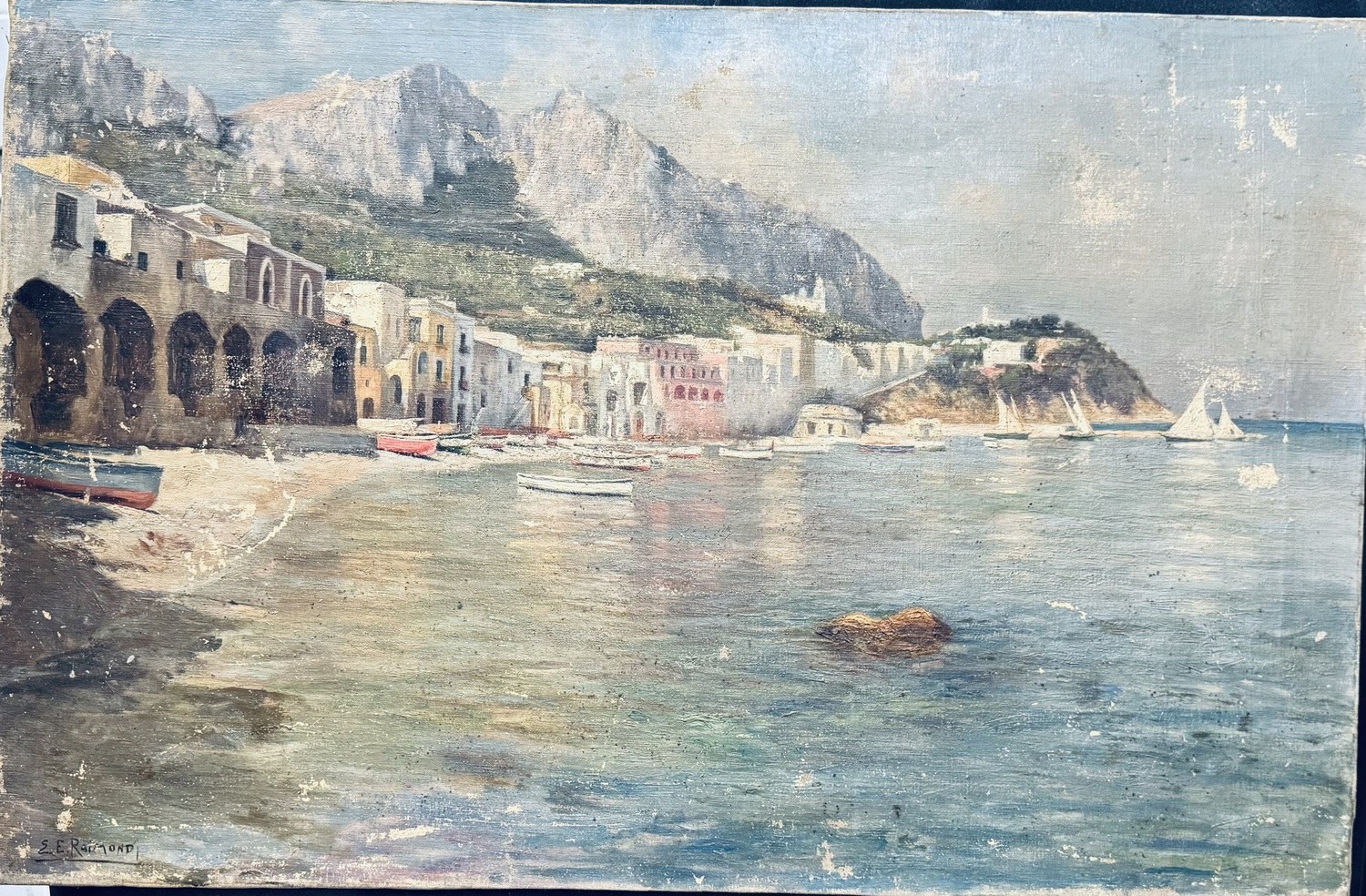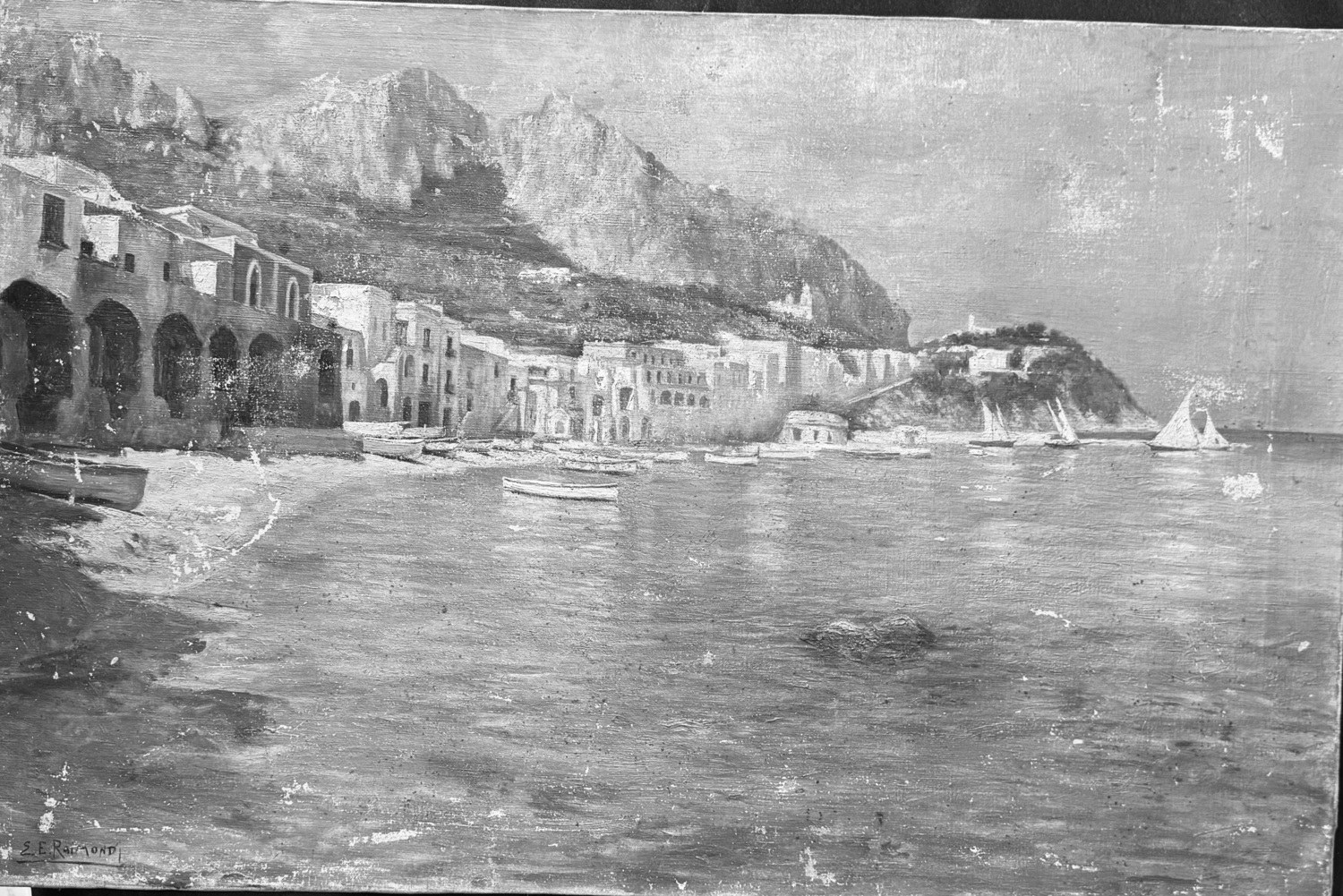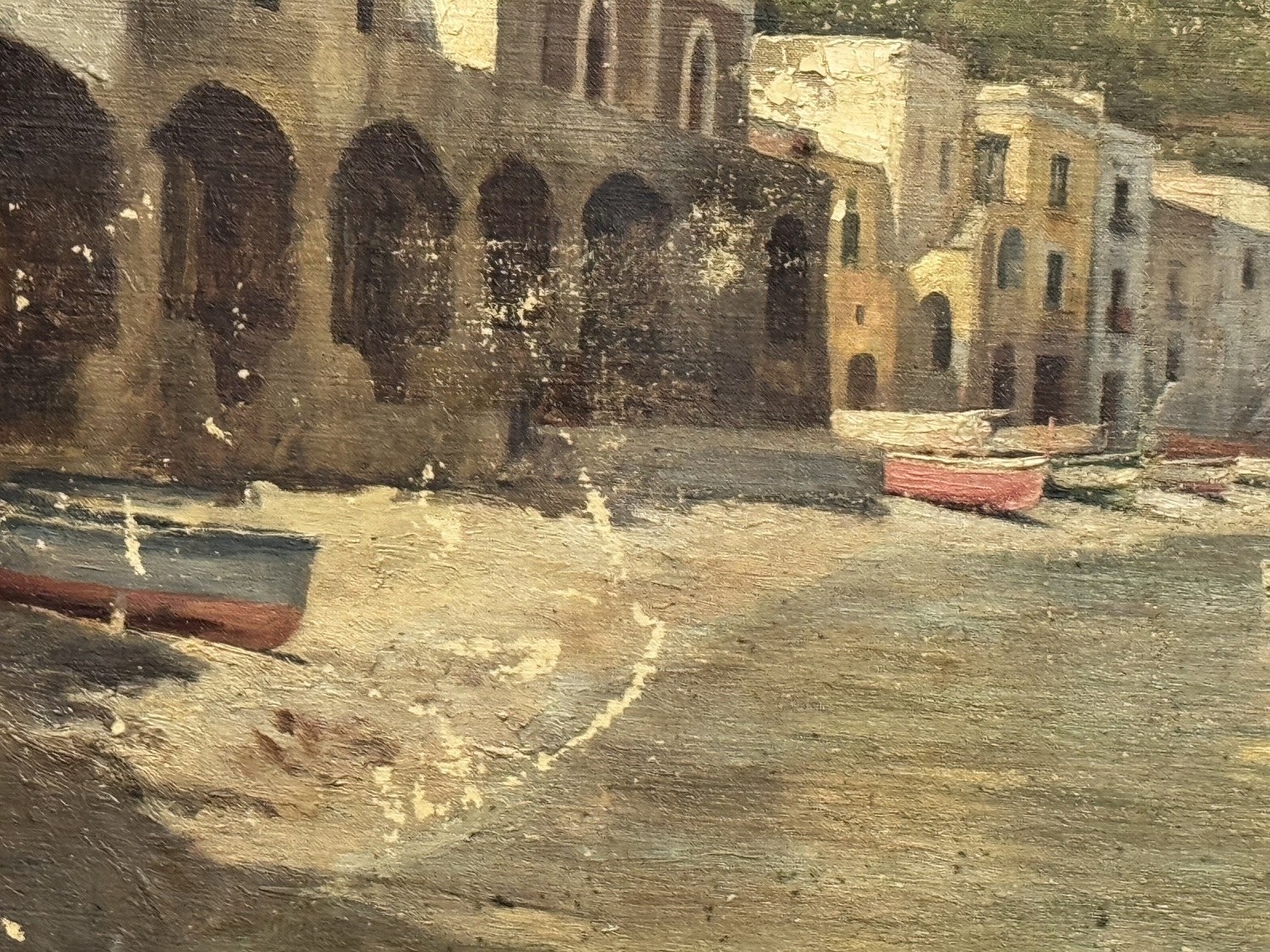 Oil painting on canvas, 19th/20th century, Italian school depicting a seascape. Dimensions: 48x74 cm. Signed lower left E. Raimondi. The painting shows slight signs of age as shown in the attached photos.