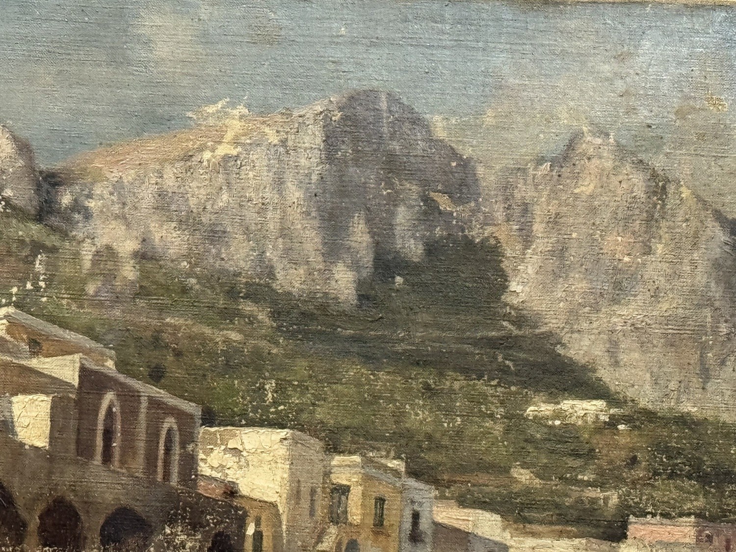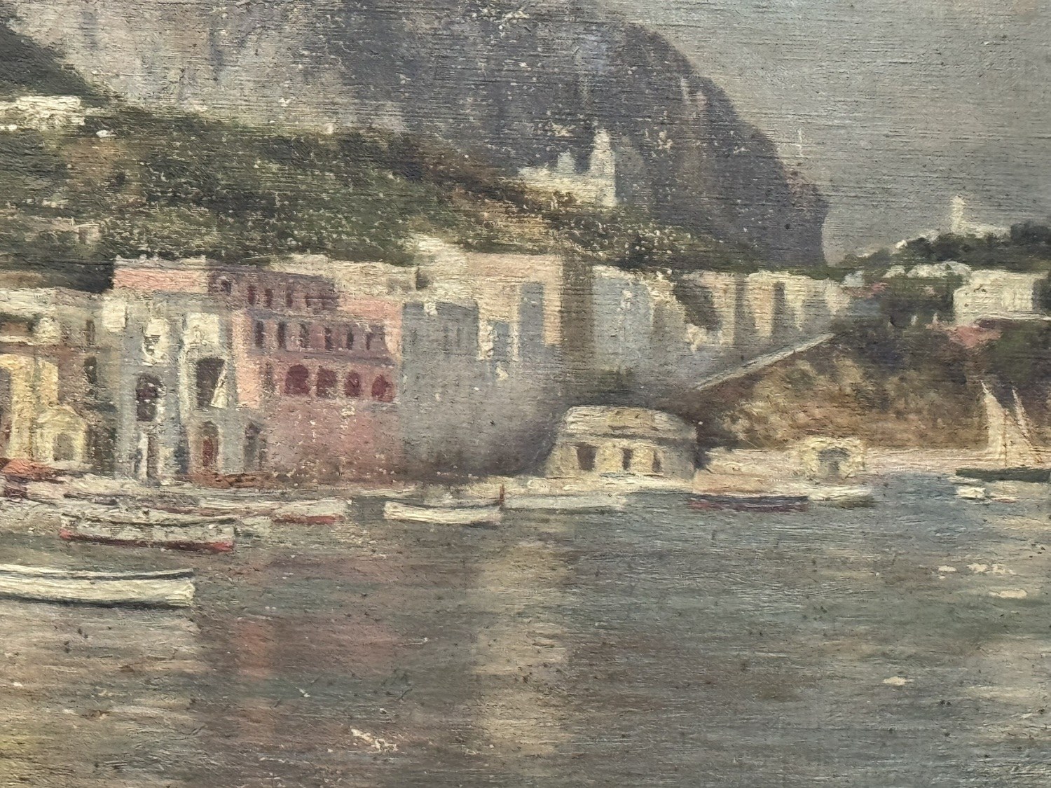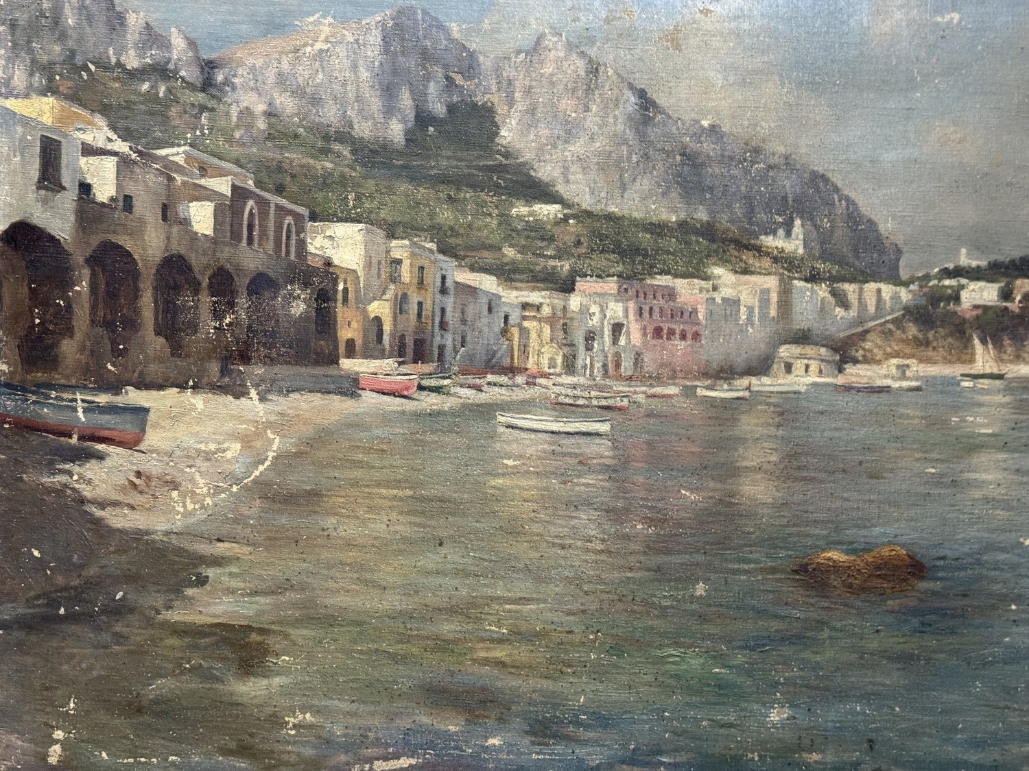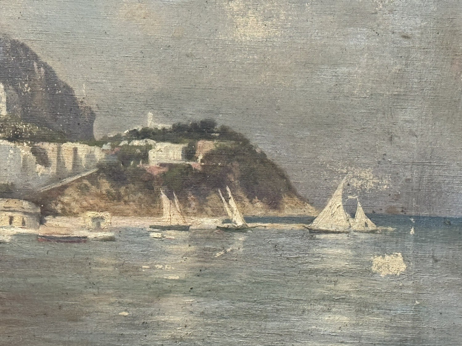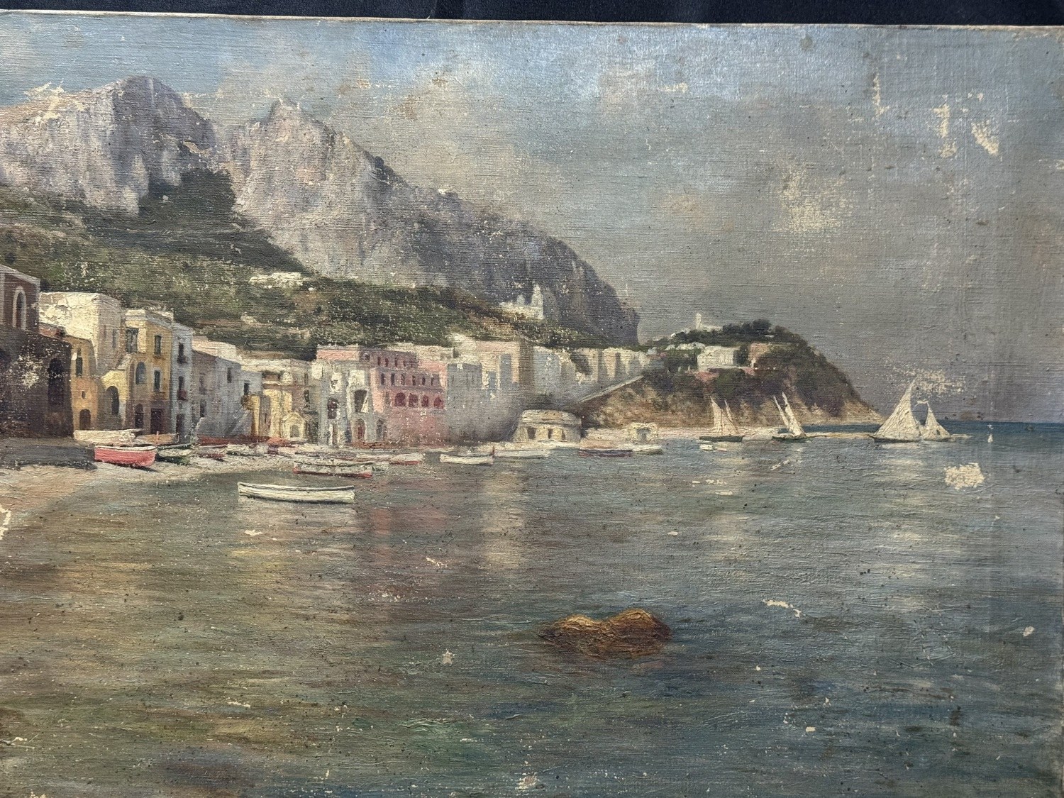 Oil painting on canvas, 19th/20th century, Italian school depicting a seascape. Dimensions: 48x74 cm. Signed lower left E. Raimondi. The painting shows slight signs of age as shown in the attached photos.