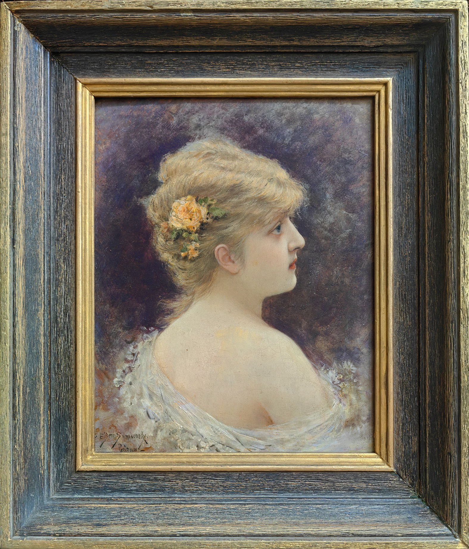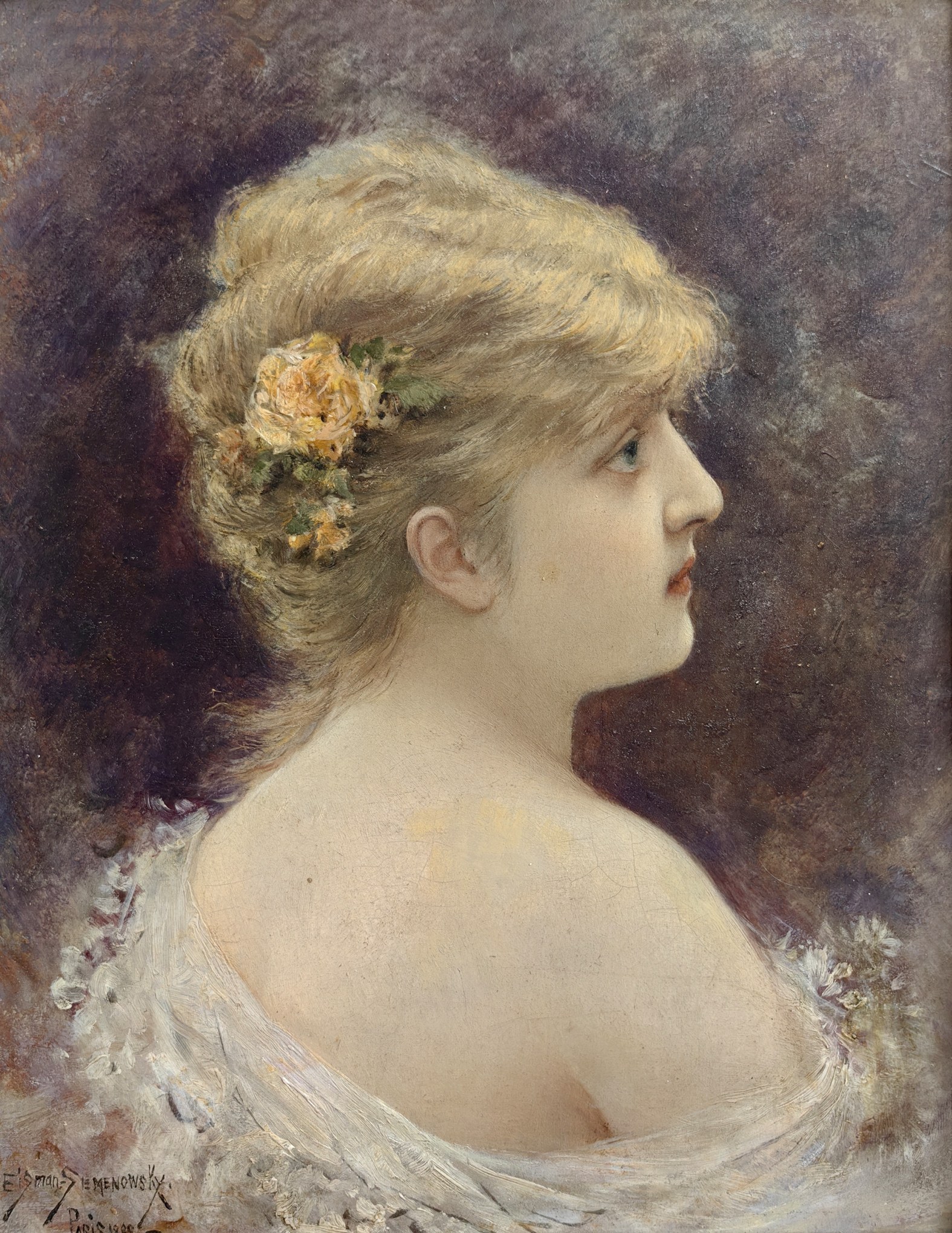 Intymny, subtelny portret młodej kobiety ujętej en profil, na tle laserunkowo kładzionych fioletów i szarości. Artyście udało się połączyć akademicką precyzję rysunku z miękkim modelunkiem światłocieniowym cery i włosów, zdobionych bukiecikiem róż. Delikatna, srebrzysta draperia odsłania ramiona modelki, a pastelowa paleta – charakterystyczna dla malarstwa belle époque – podkreśla liryczny, elegancki nastrój kompozycji. Portrety tego typu należą do najbardziej cenionych realizacji Eisman-Semenowskiego, sytuujących go w kręgu czołowych twórców kobiecego portretu salonowego przełomu XIX i XX wieku.