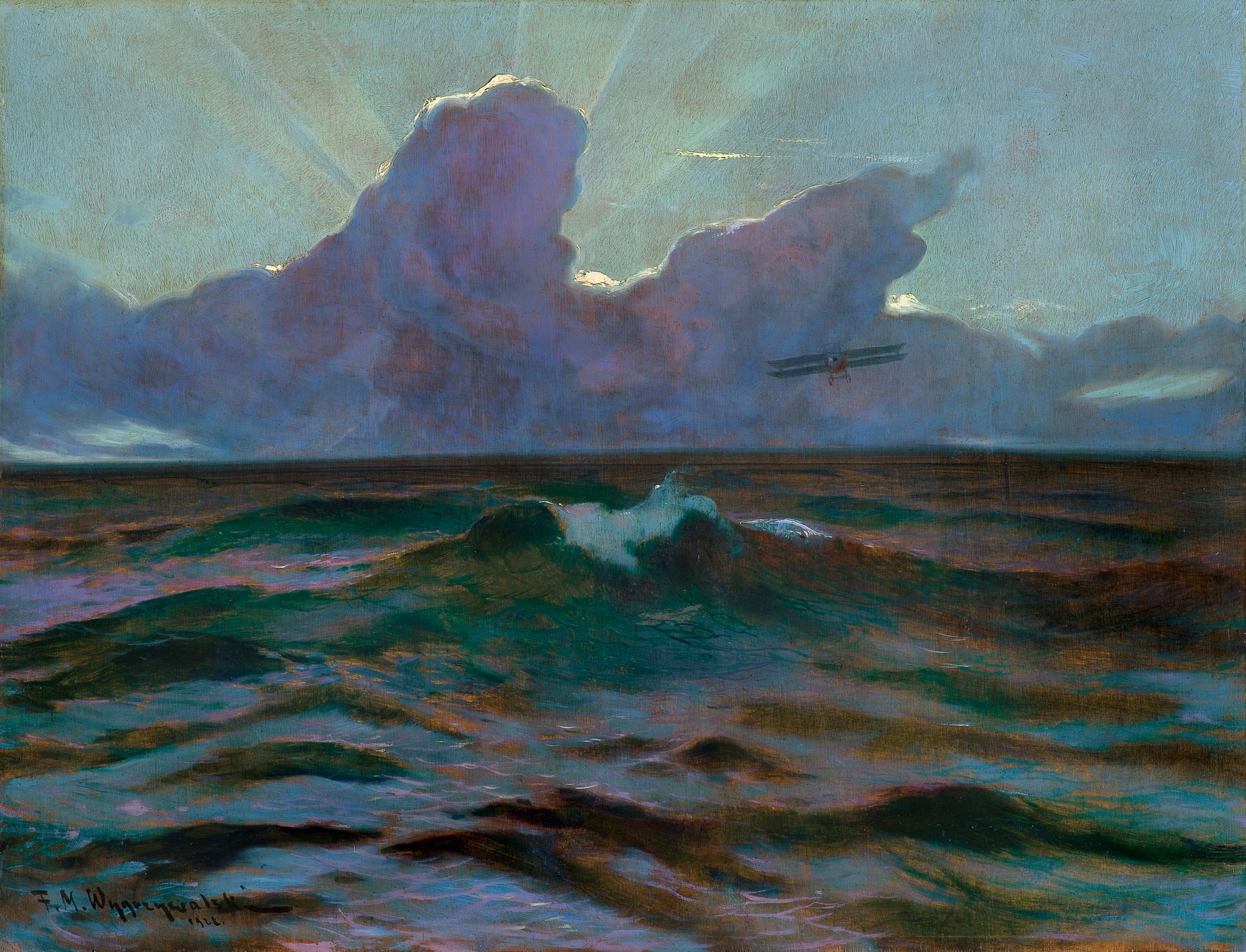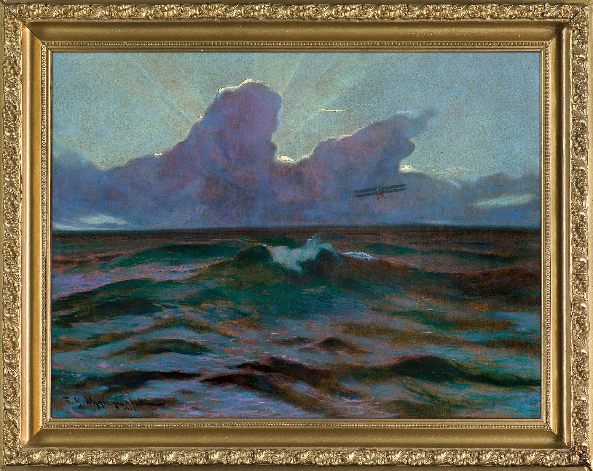 Dzieło Wygrzywalskiego, powstałe w 1928 roku, uderza nie tylko rozmachem kompozycji, ale i niezwykle nowoczesnym jak na swoje czasy tematem. Na tle monumentalnych, ciężkich chmur, przeszywanych promieniami słońca, widzimy samotny samolot przelatujący nad oceanem – motyw, który można odczytywać w kontekście przełomowych wydarzeń z historii lotnictwa. W 1928 roku cały świat obiegła wiadomość o pierwszym kobiecym przelocie nad Atlantykiem: Amerykanka Amelia Earhart jako pierwsza kobieta-pilotka wzięła udział w locie przez ocean. Lot odbył się z Nowej Fundlandii w Kanadzie do Burry Port w Walii. Chociaż Earhart nie pilotowała samolotu podczas tej transatlantyckiej podróży, lot przyniósł jej międzynarodową sławę i uczynił z niej wybitną postać w świecie lotnictwa.
