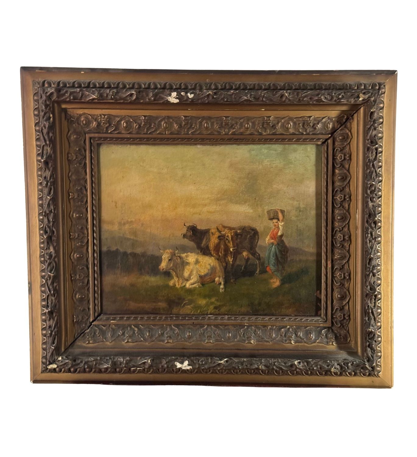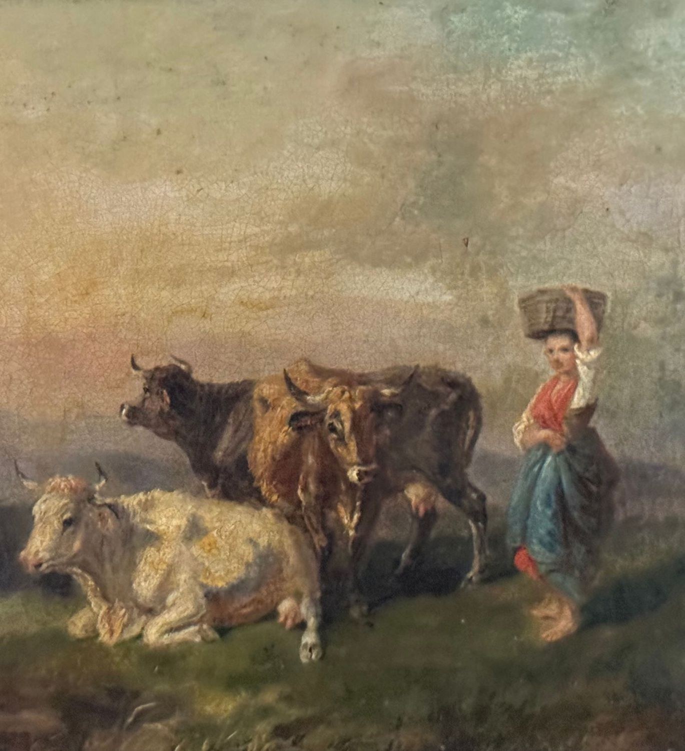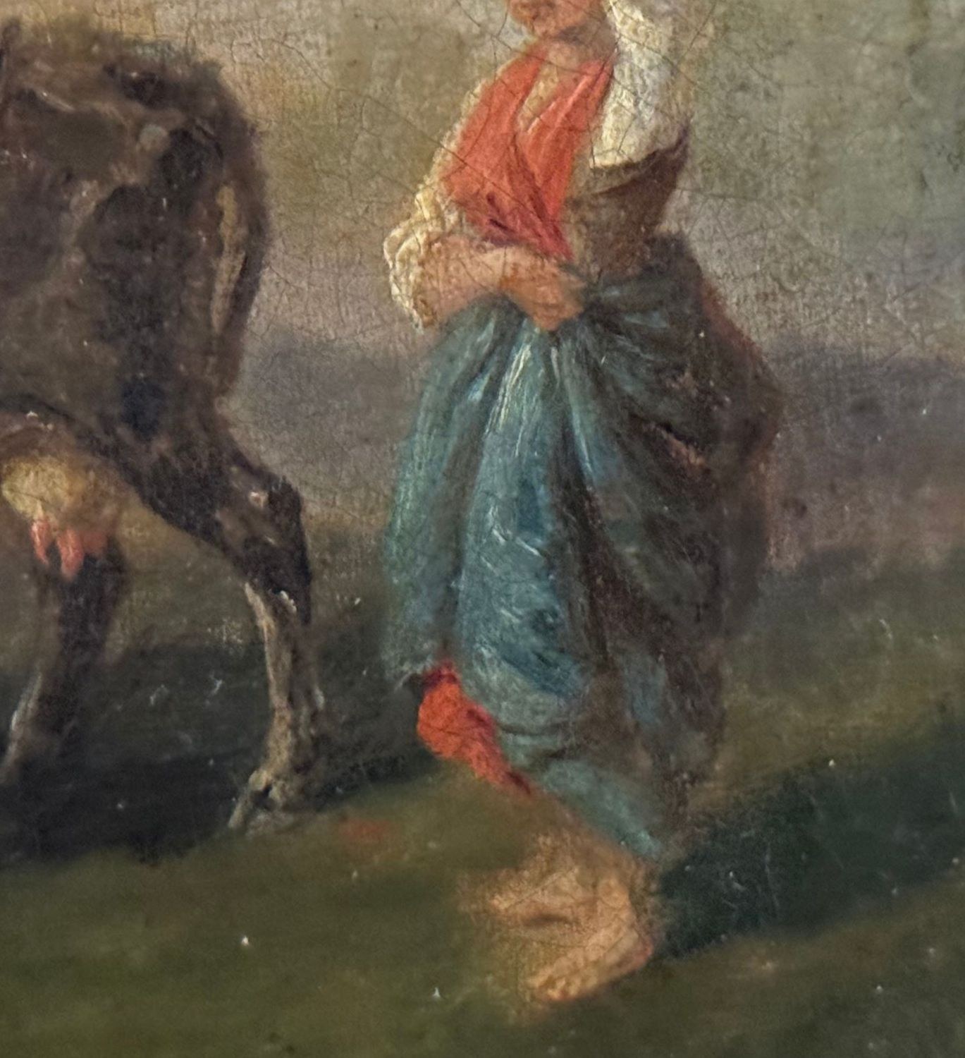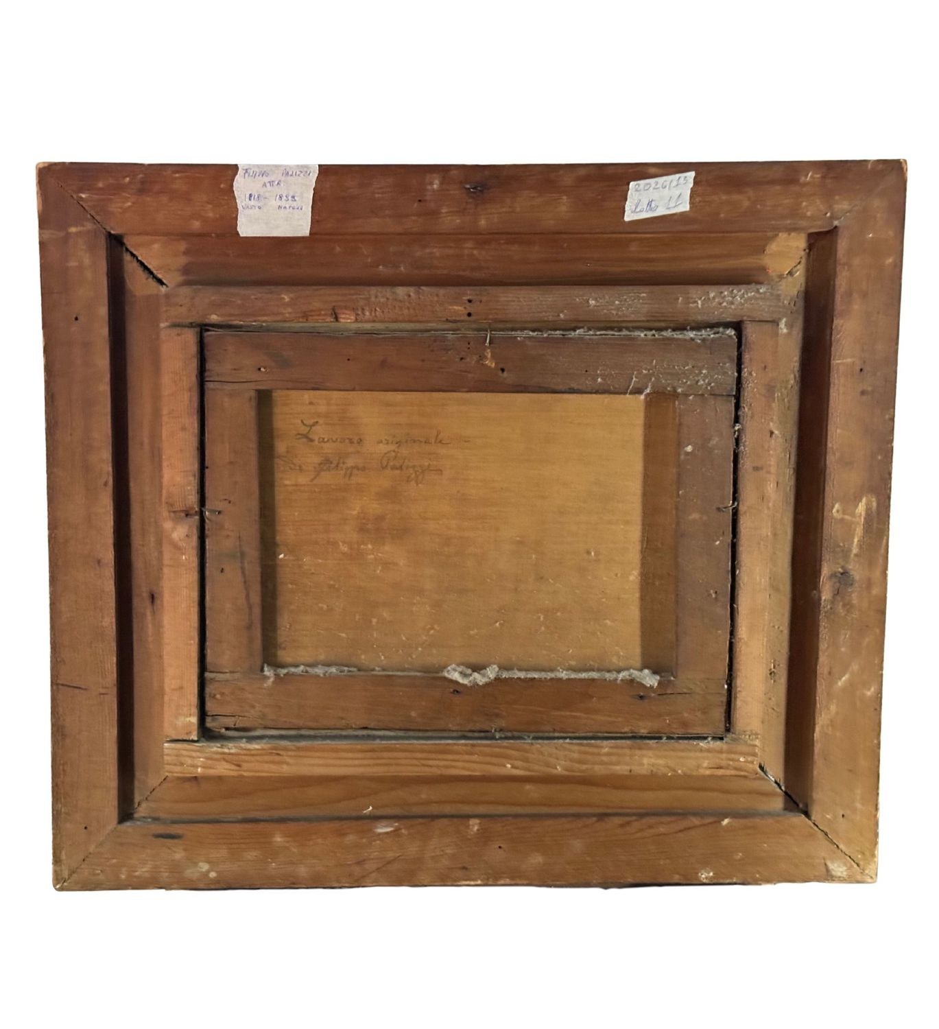 Oil on canvas painting, 19th century, Italian school, depicting a peasant woman with a flock. Dimensions including frame: 60 × 52 cm. Inner frame dimensions: 37.5 × 28.5 cm. Attributed to Filippo Palizzi. The artwork is in good condition, with signs of age and wear, as shown in the attached photos.