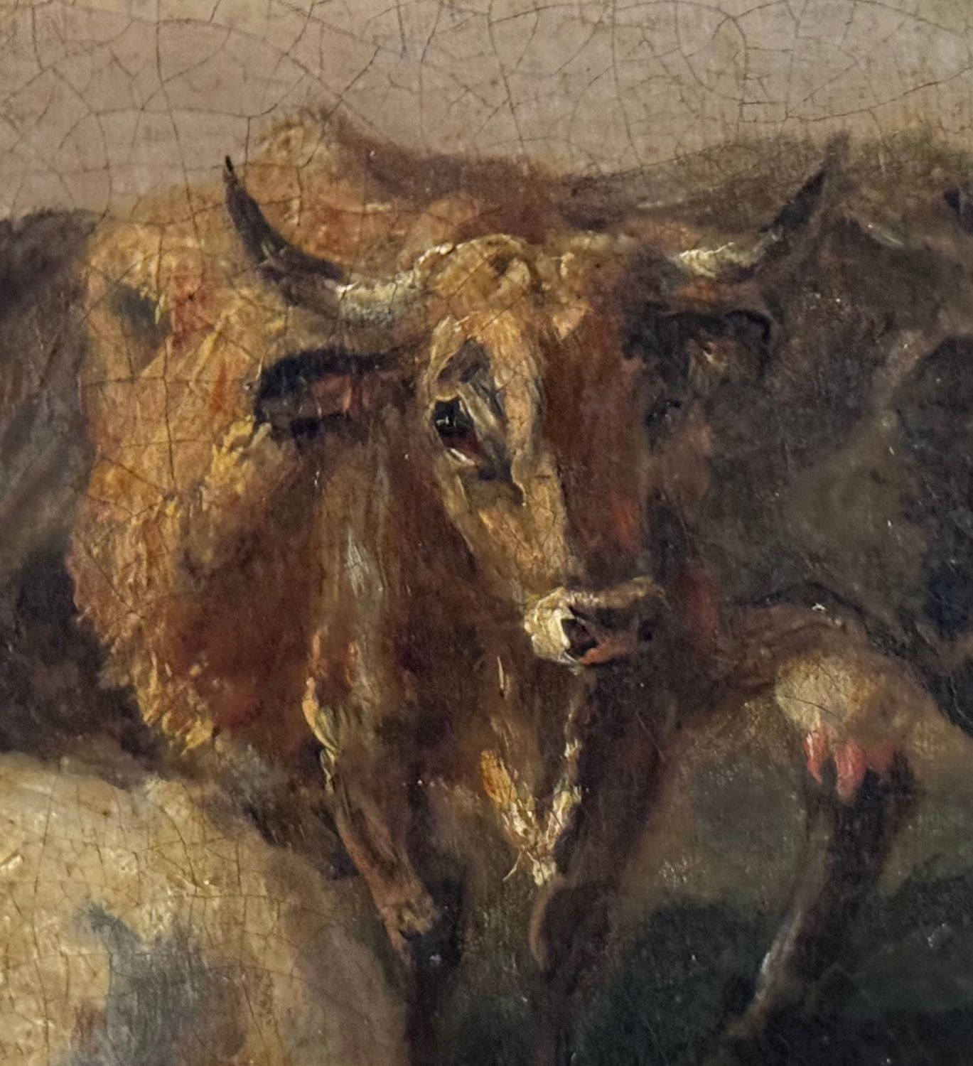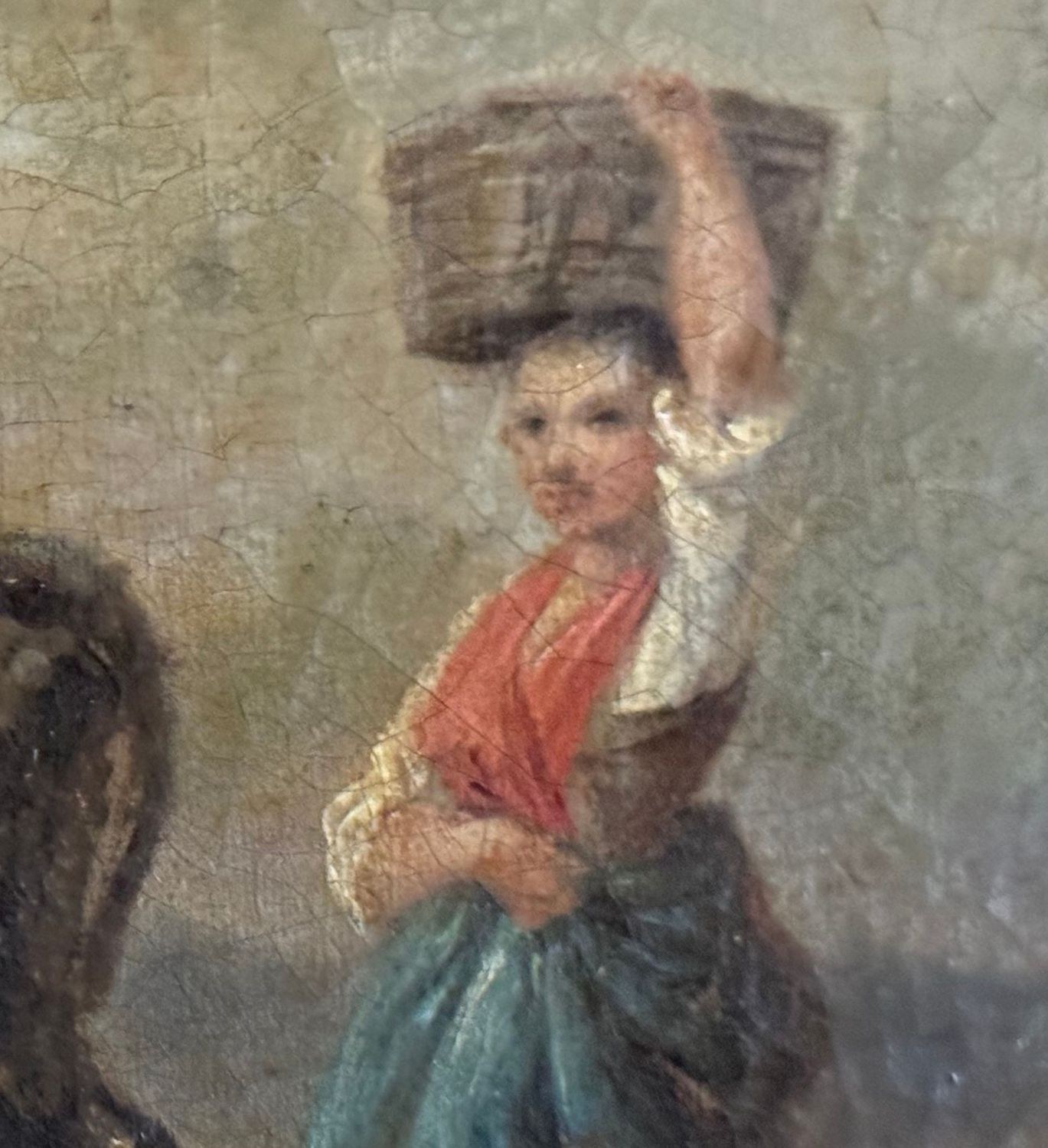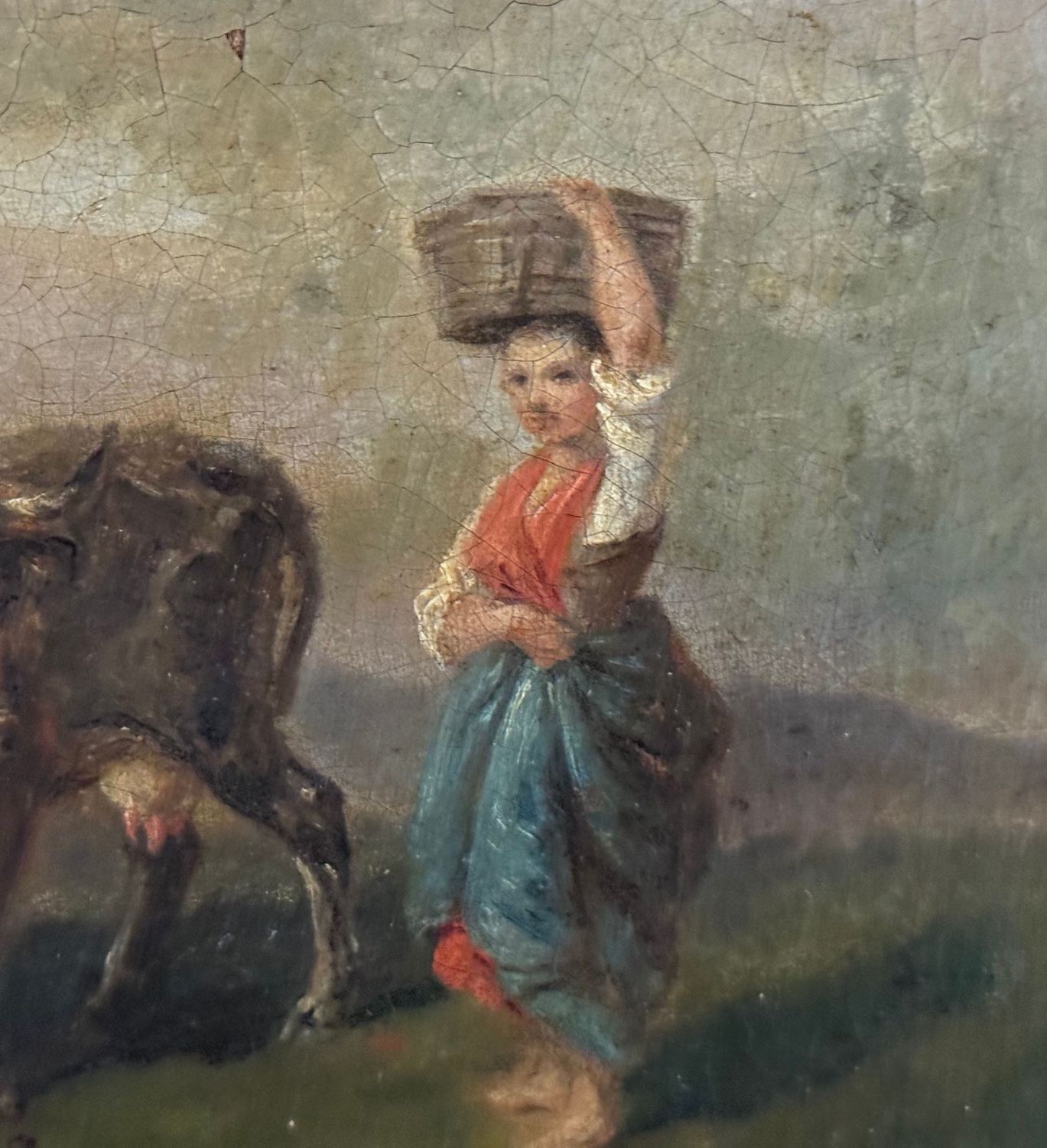 Oil on canvas painting, 19th century, Italian school, depicting a peasant woman with a flock. Dimensions including frame: 60 × 52 cm. Inner frame dimensions: 37.5 × 28.5 cm. Attributed to Filippo Palizzi. The artwork is in good condition, with signs of age and wear, as shown in the attached photos.