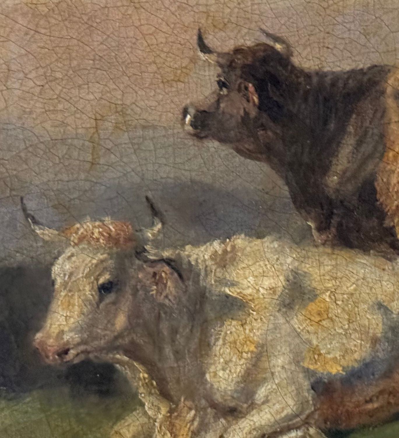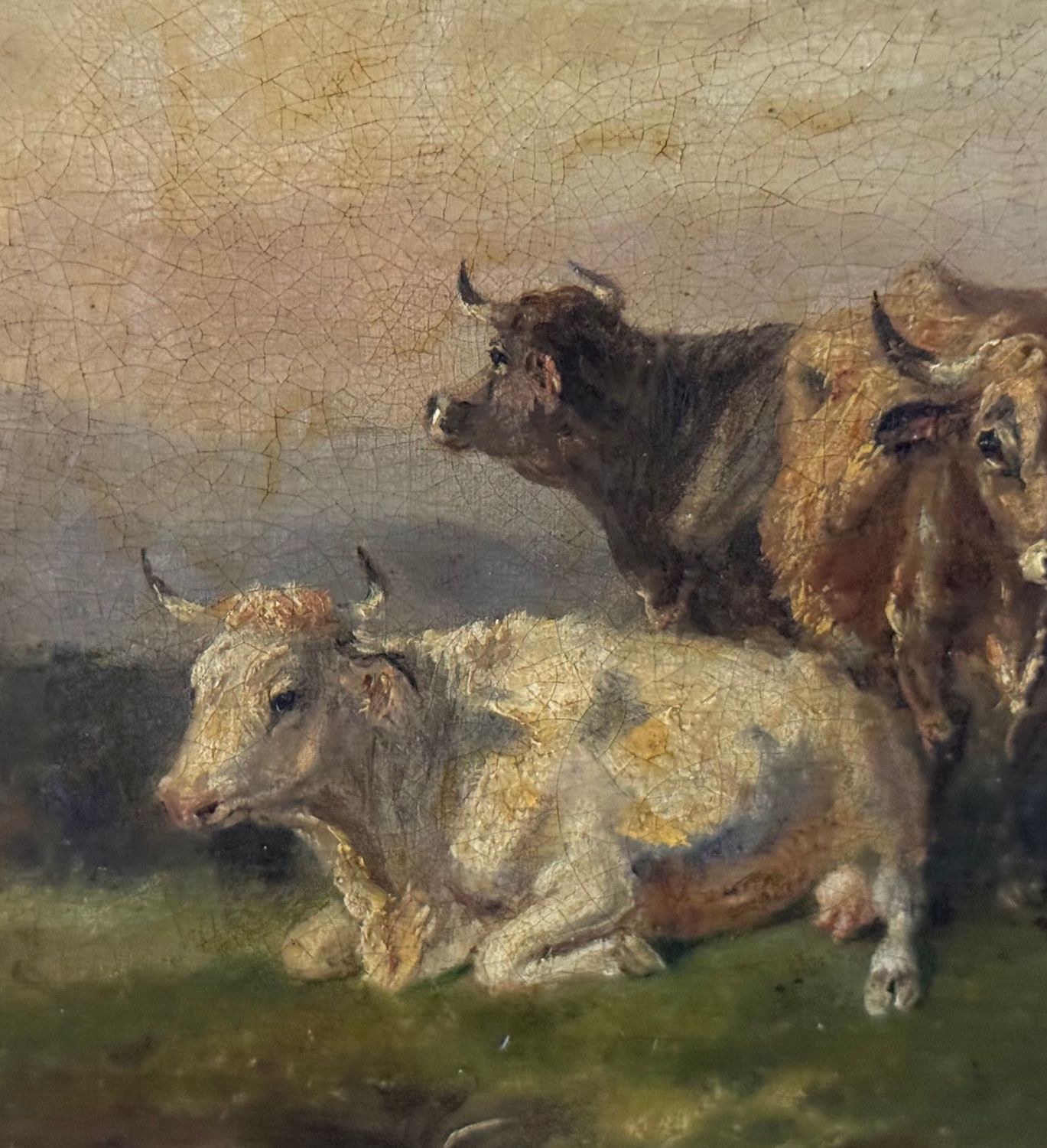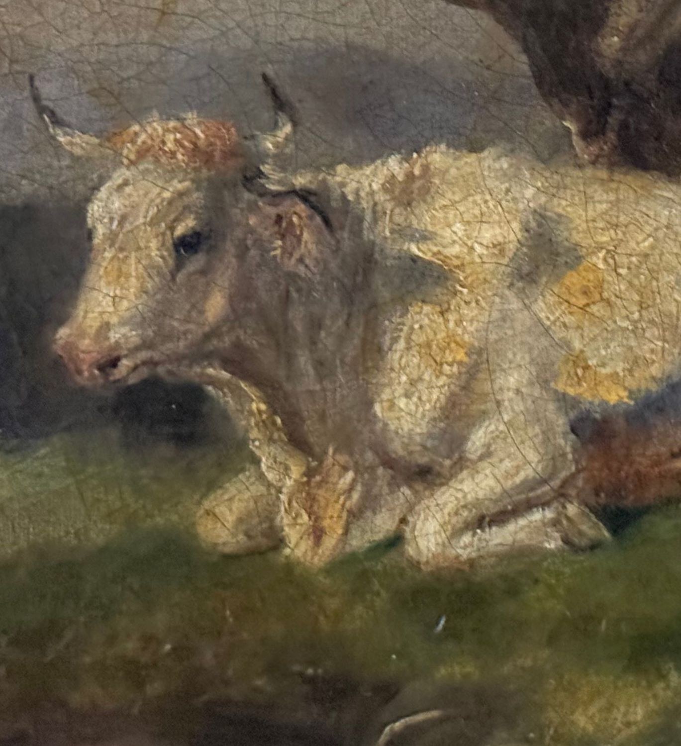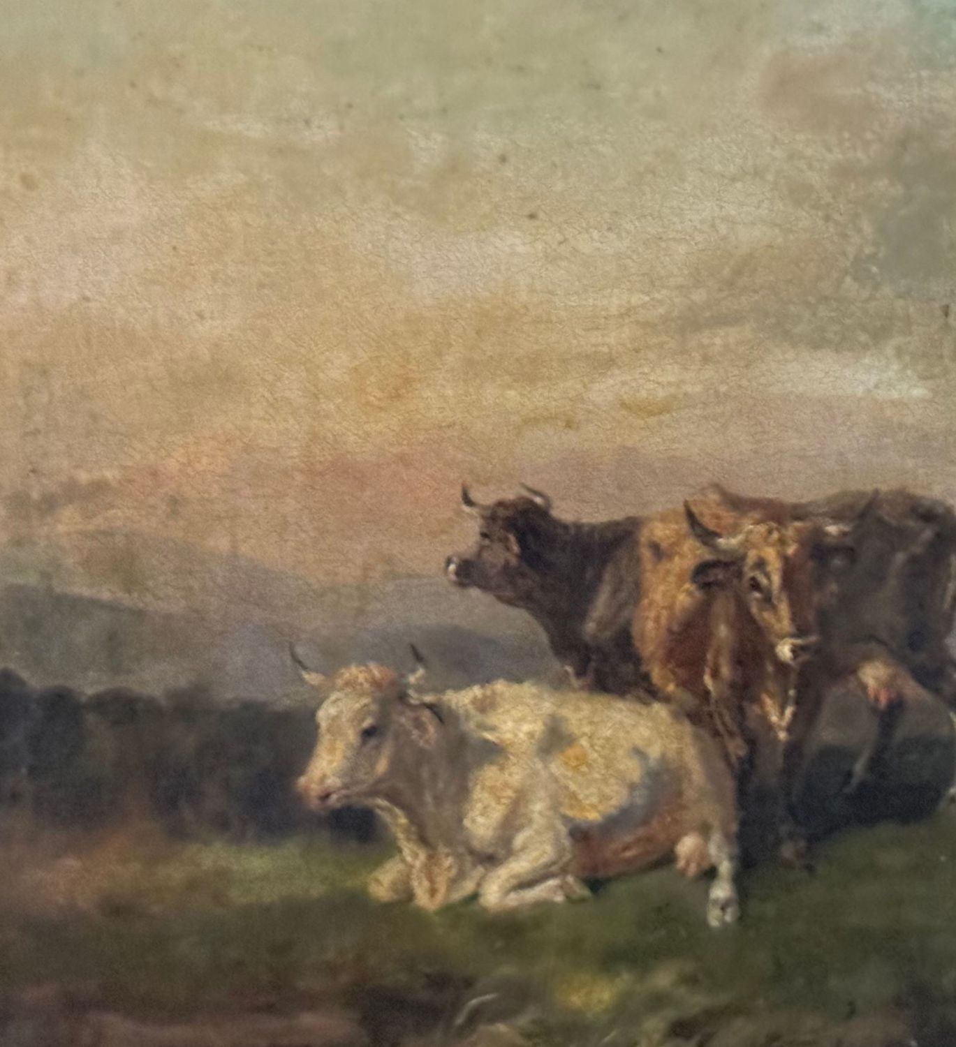 Oil on canvas painting, 19th century, Italian school, depicting a peasant woman with a flock. Dimensions including frame: 60 × 52 cm. Inner frame dimensions: 37.5 × 28.5 cm. Attributed to Filippo Palizzi. The artwork is in good condition, with signs of age and wear, as shown in the attached photos.