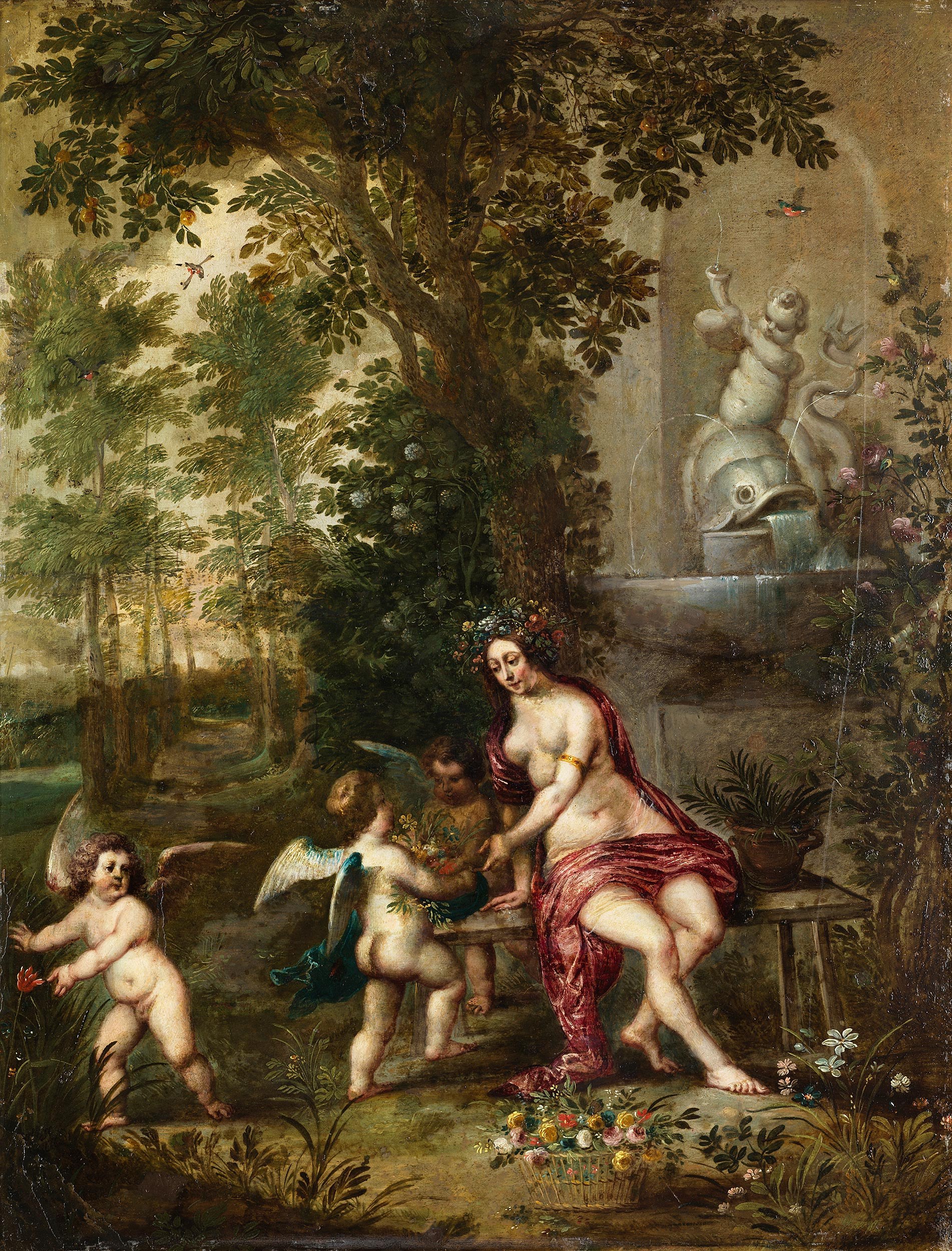In Parklandschaft mit einer Allee, vor einem großen, steinernen Brunnen mit wasserspeiendem Delfin, auf einer Bank sitzend, die schöne Göttin Flora, nur mit einem langen roten Tuch bekleidet. Sie trägt auf ihrem Kopf einen großen Blütenkranz, während ein Putti ihr weitere Blumen bringt. Linksseitig am unteren Rand ein weiterer geflügelter Putto, der höhere Gräser zur Seite schiebt, um weitere Blumen zu pflücken. Am Boden vor Flora stehend ein geflochtener Korb, aus dem weitere farbenfrohe Blumen herausragen. Flora, die römische Göttin der Blumen und Blüten, aber auch des Frühlings wird besonders durch das helle Inkarnat ihres nackten Oberkörpers und die zahlreichen farbigen Blumen hervorgehoben. (14114725) (1) (18)