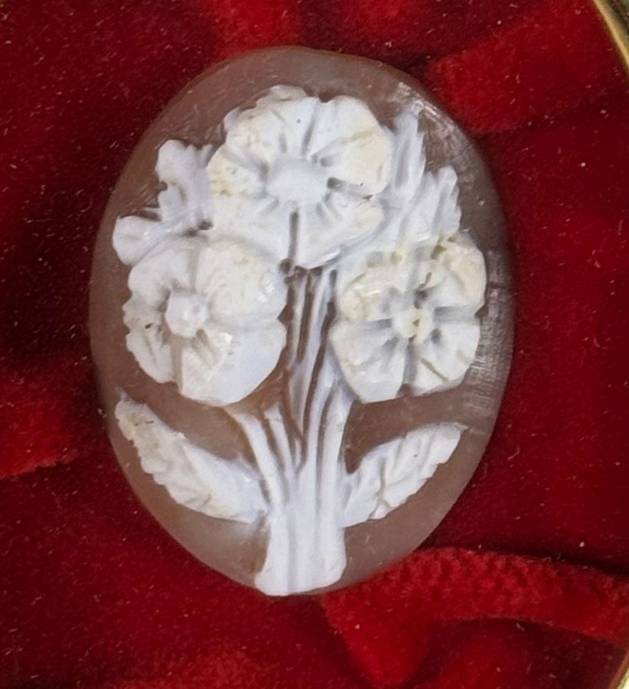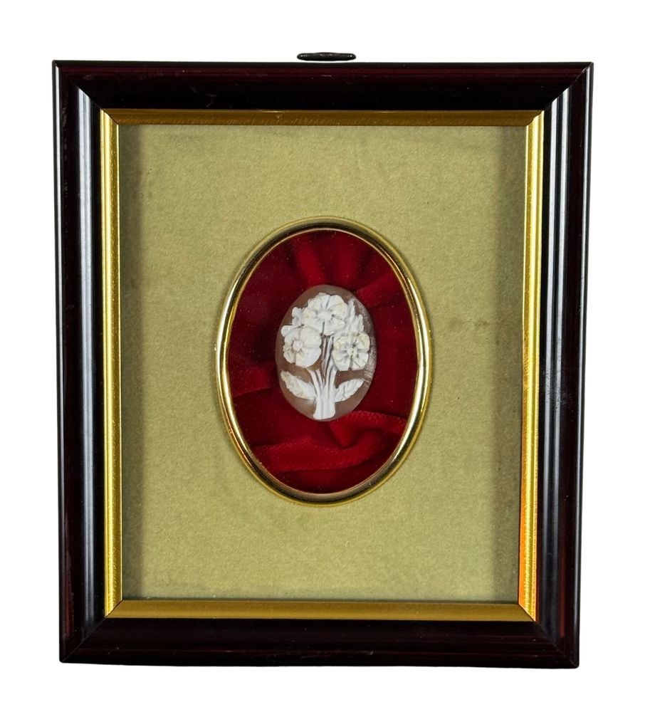 Cameo depicting Flowers. Dimensions including frame: 13x15 cm. Inner frame dimensions: 4x3 cm. Artwork in good condition.