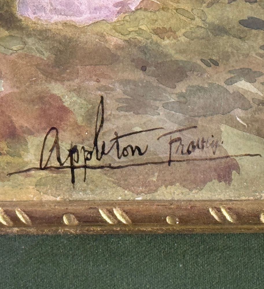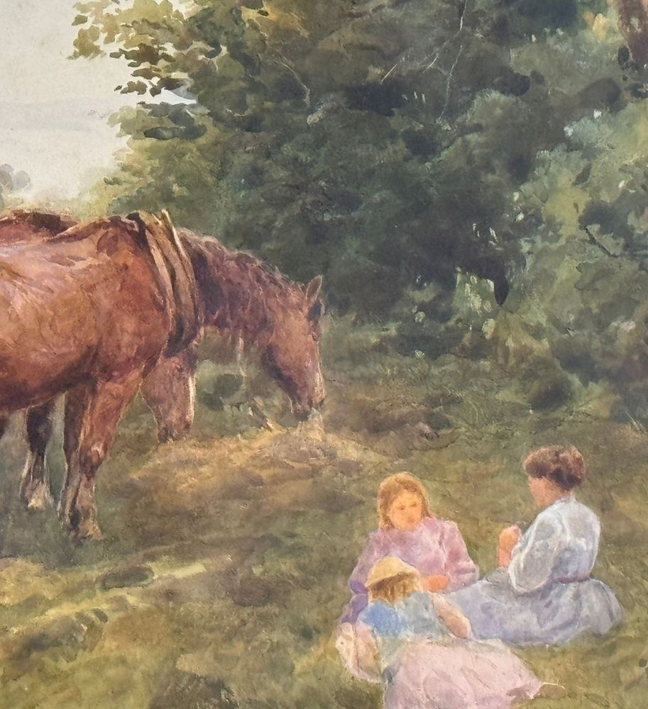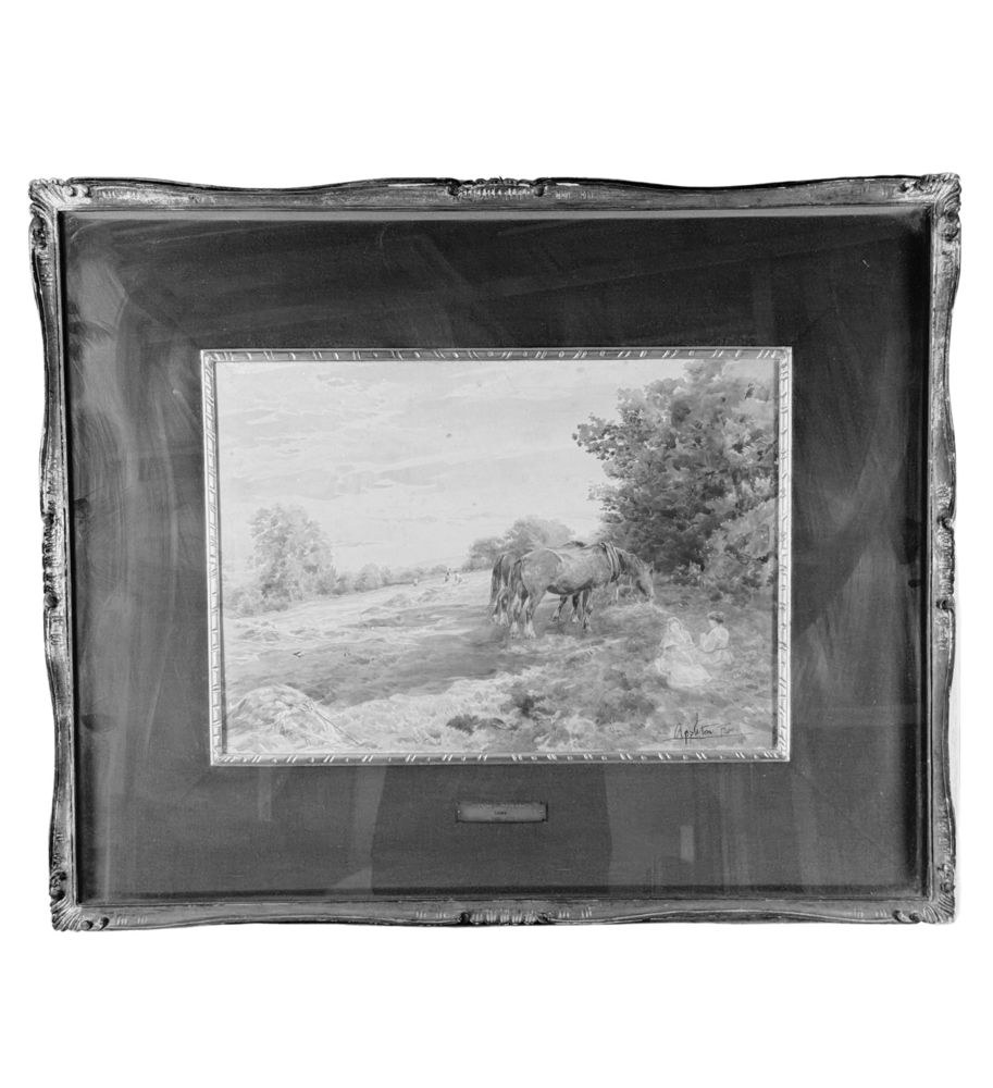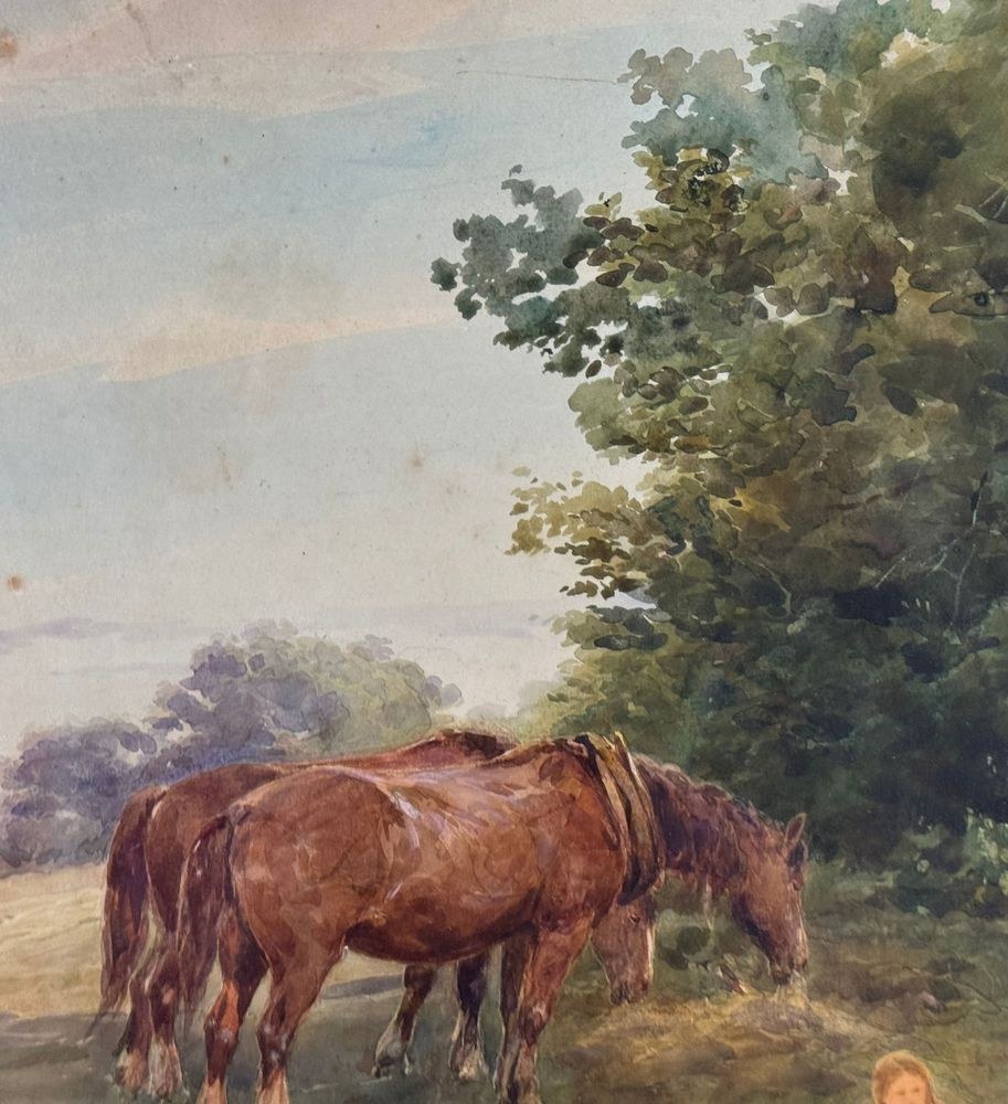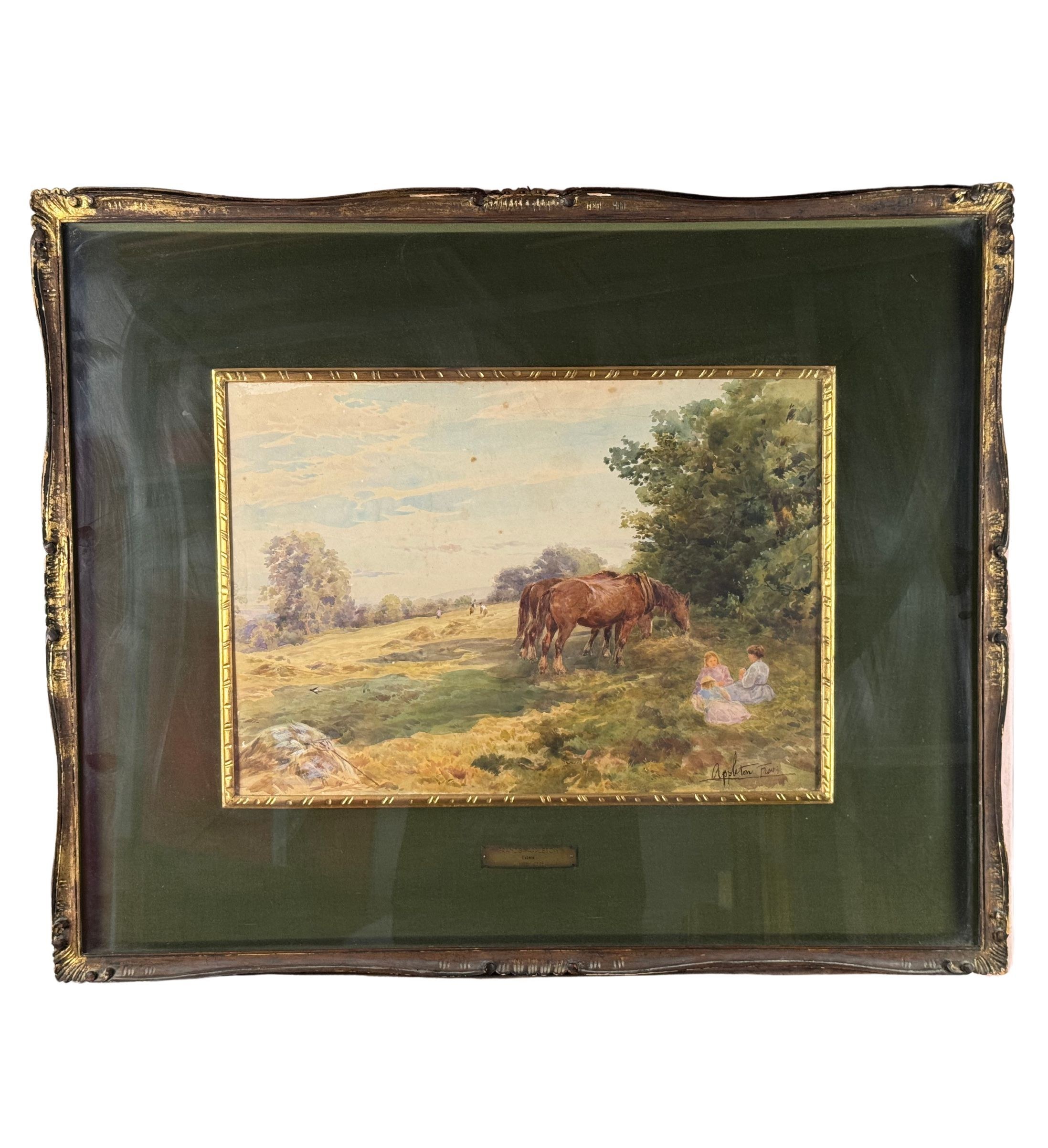 Watercolor on paper, 19th/20th century, European school, depicting a Landscape with figures and horses (Summer). Dimensions including frame: 84x69 cm. Inner frame dimensions: 52x37 cm. Signed in the lower right corner by Francis Appleton. The work is in good condition with a certificate of authenticity on the back from the National Institute of Art.
