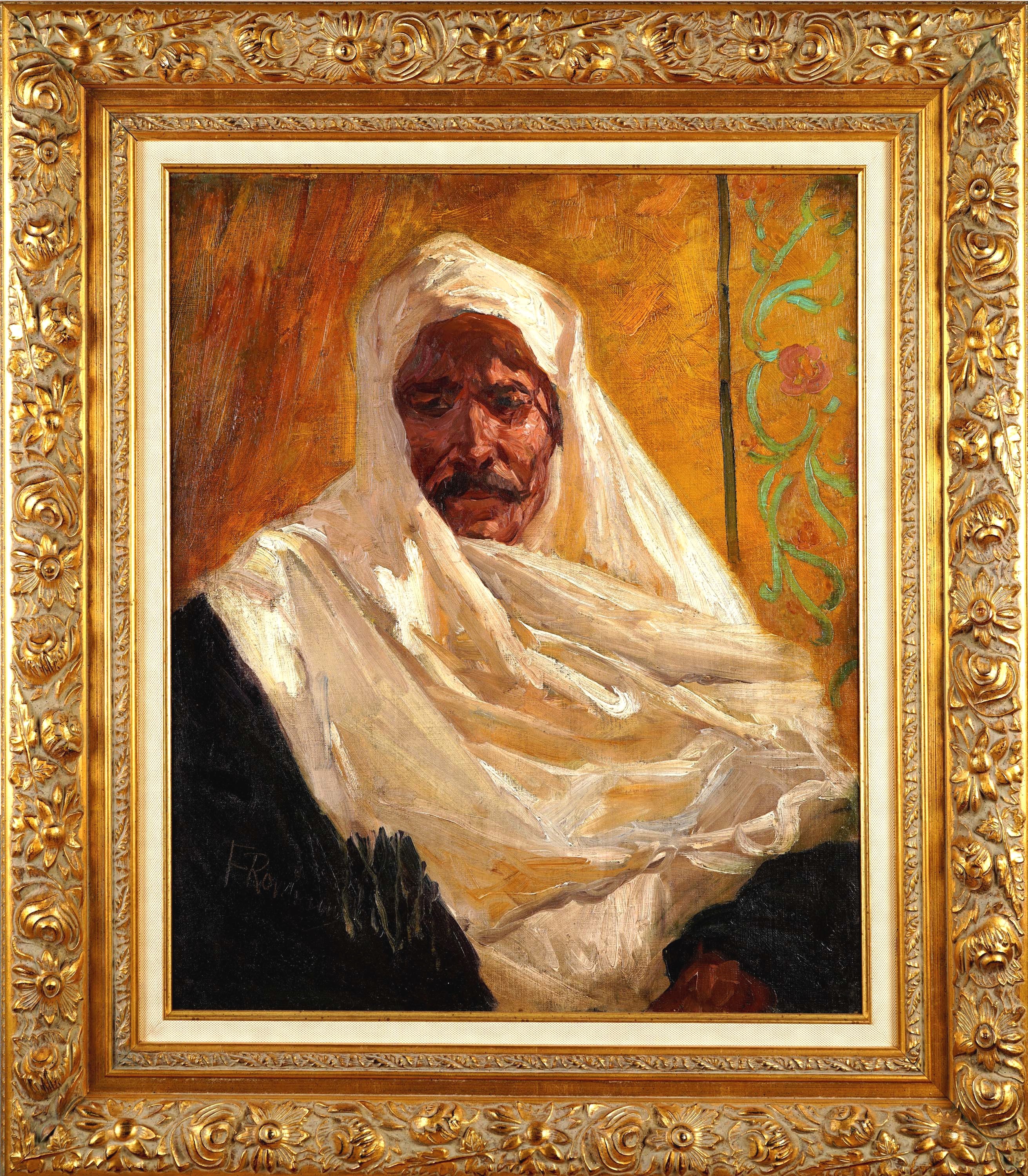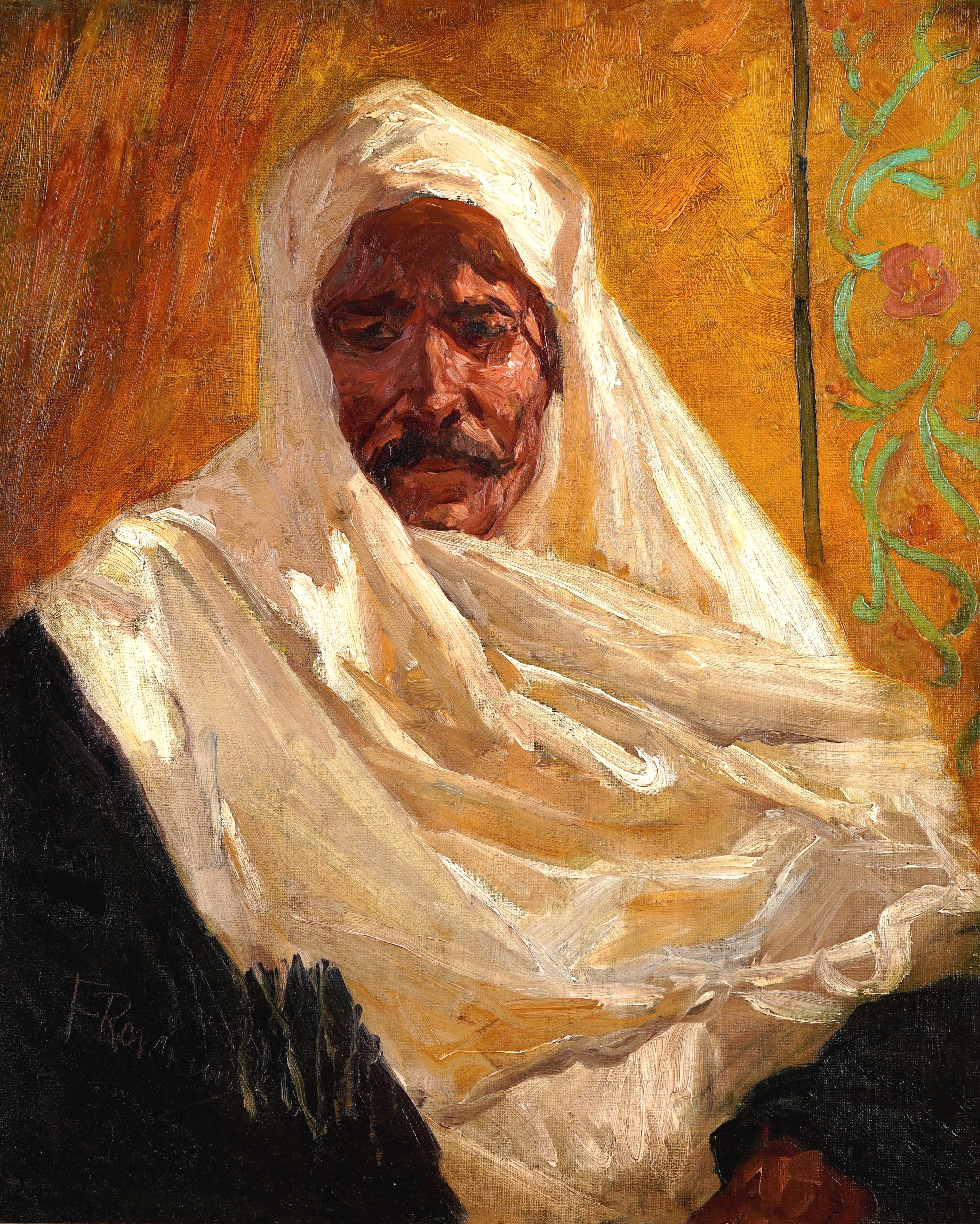 - kartka z opisem pracy w j. niemieckim: Francois Roubaud / geb. 1856 in Odessa, gest. 1928 in München. / 112 Arabischer Scheik in dunklem Burnus und weiβemKopfüberwurf. Brustbild / en face. / Oel auf P. 68 x 57 cm. Bez.: F. Rouband. H. R. [w prawym górnym rogu kartki napis - częściowo czytelny: …Helb… / München 17. September 30.];