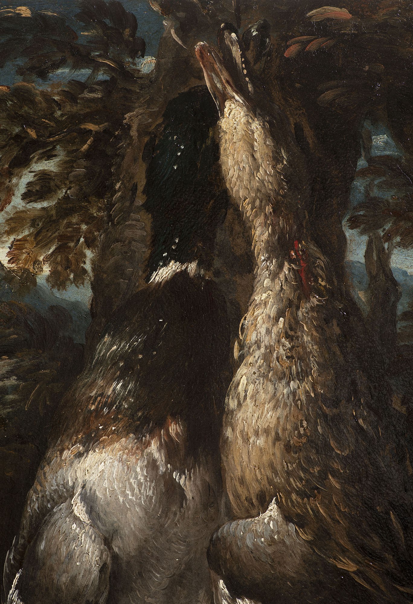 A hare and a wild duck are beautifully depicted in this pair of still lifes. The two animals are painted realistically and hanging from a tree. In the background, a mountainous landscape opens up in the distance. The meticulous workmanship and the finesse of the brush exemplify the artist's training. Since the Middle Ages, hunting had been the preserve of the aristocracy. Hunting still lifes depicting the kill were a reminder of this privilege, and gave their owners a sense of participating in the aristocratic lifestyle; whether they themselves were of noble, or only affluent middle-class birth.