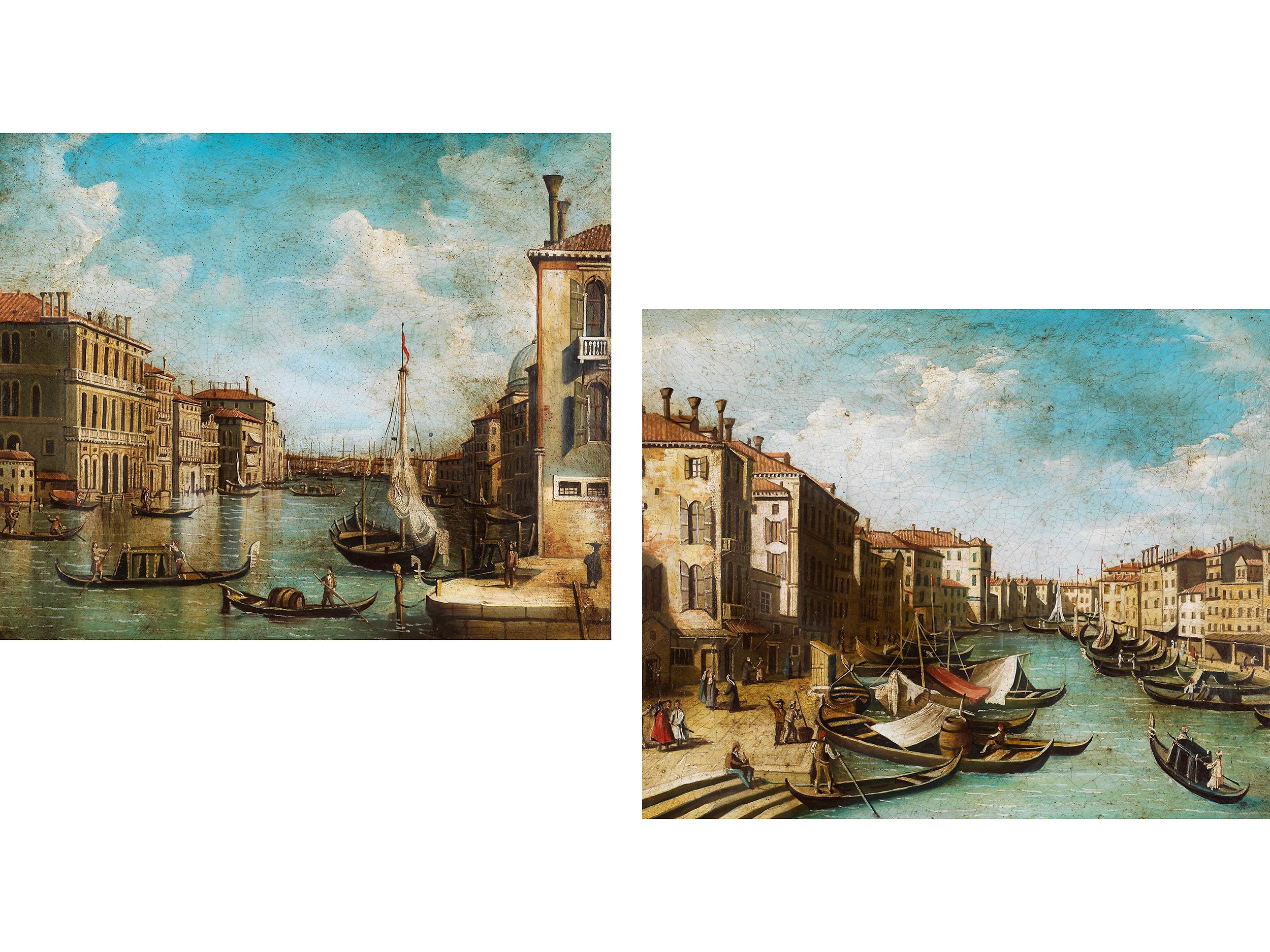 Blick über den ruhigen Canal, der seitlich von zahlreichen Häusern und Palazzi flankiert wird. Auf dem Wasser selbst mehrere Boote und Gondeln, zum Teil auch am Ufer ankernd. Eines der Gemälde zeigt links einen breiten Platz mit Figuren und einigen Treppenstufen, die hinab zum Canal führen. Malerei in zurückhaltender Farbgebung mit hohem Himmel. (1411185) (18)
