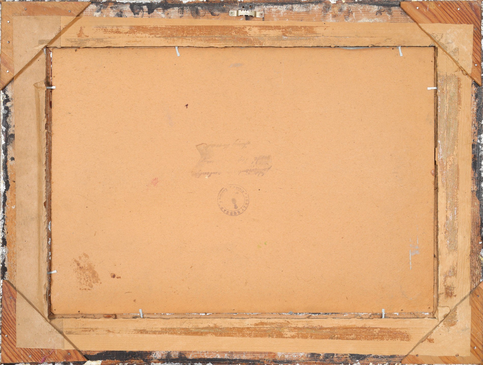 Na odwrocie pieczątka Jerzego Kossaka z herbem rodu Kossaków oraz pieczątka artysty z potwierdzeniem autentyczności obrazu.
