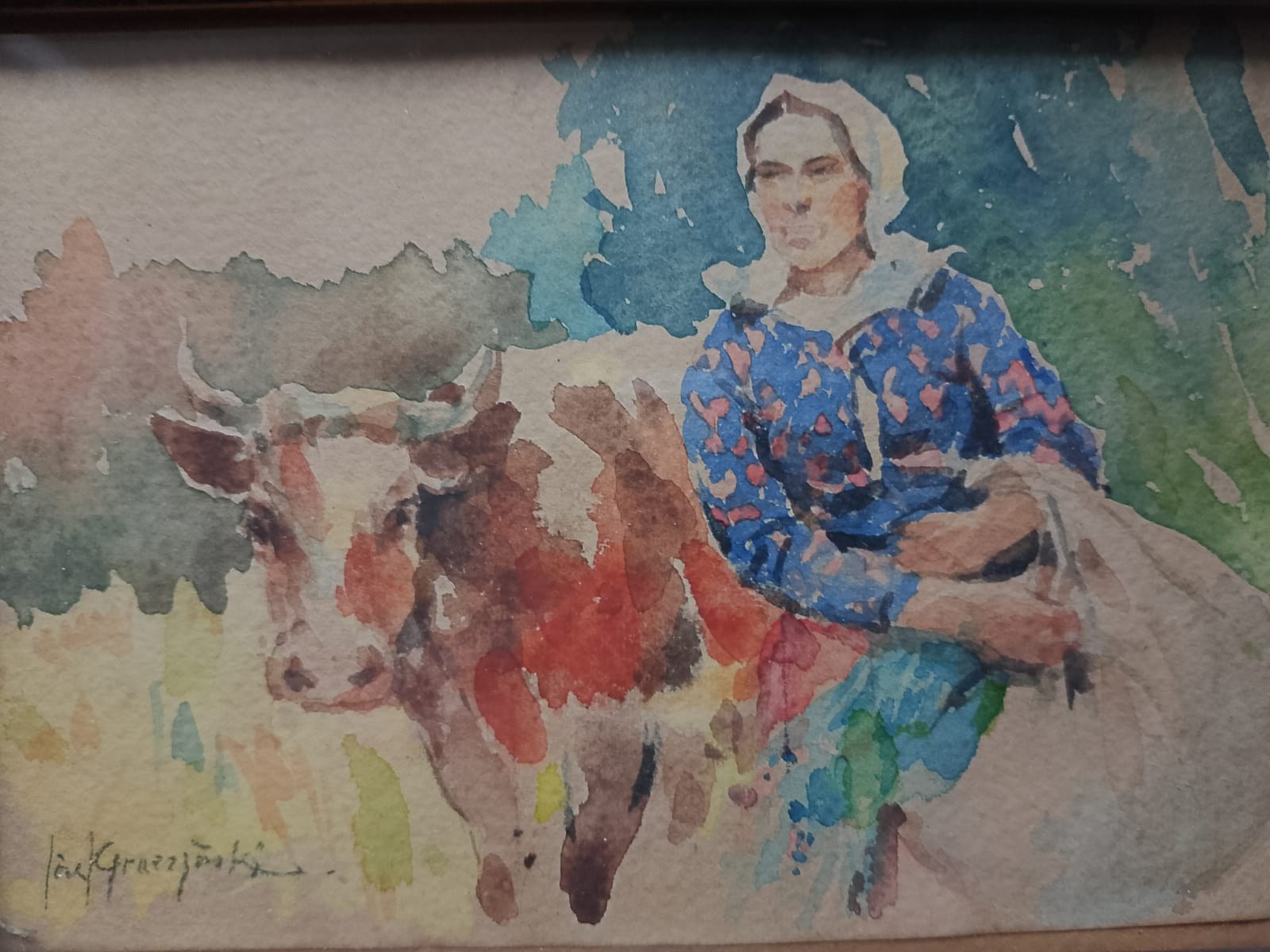 akwarela/papier, 10,5 x 16 cm, sygnowana l.d., praca oprawiona, na odwociu nalepka zakładu ramiarskiego