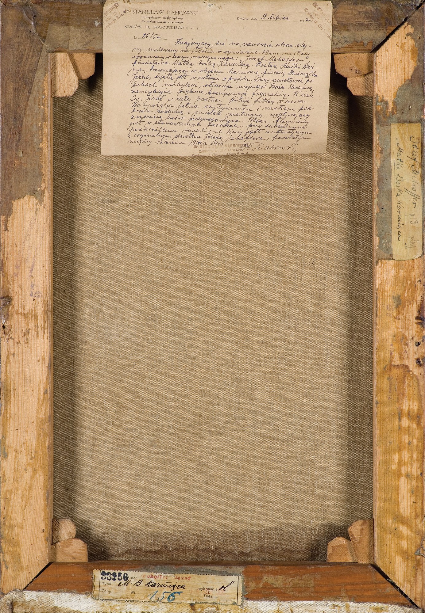 Na odwrocie, na lewej i prawej listwie krosna, pieczęci składu przyborów malarskich Róży Aleksandrowicz w Krakowie, obok pieczęci z numerem odnoszącym się do wielkości podobrazia: 57; na górnej listwie krosna karta z odręczną opinią dr. Stanisława Dąbrowskiego z lipca 1952 r. potwierdzającą autentyczność dzieła Mehoffera; na prawej listwie krosna nalepka (tuszem, ołówkiem): Józef Mehoffer | 913 olej | „Matka Boska Karmiąca“; na dolnej listwie krosna nalepka Towarzystwa Zachęty Sztuk Pięknych w Warszawie (pieczęć, druk, tusz, kredka): 33256 Autor Mehoffer Józef | Tytuł M. B. Karmiąca wykonanie ol. | Cena Wł 156 Data 4 CZER 1935.
