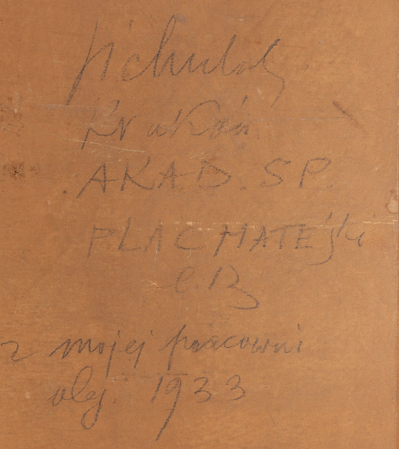 opisany na odwrociu: 'Warszawa', 'No 375', 'Wnętrze pracowni | K. Sichulskiego | we Lwowie | przy ul. Zofii l. b3', 'Sichulski | Kraków | AKAD. SP | PLAC MATEJKI | l. B | z mojej pracowni | olej 1933' oraz '72x105', papierowe nalepki wystawowe: trzy Towarzystwa Przyjaciół Sztuk Pięknych w Krakowie oraz jedna Towarzystwa Zachęty Sztuk Pięknych w Warszawie, dwie nalepki aukcyjne, na ramie jedna nalepka aukcyjna