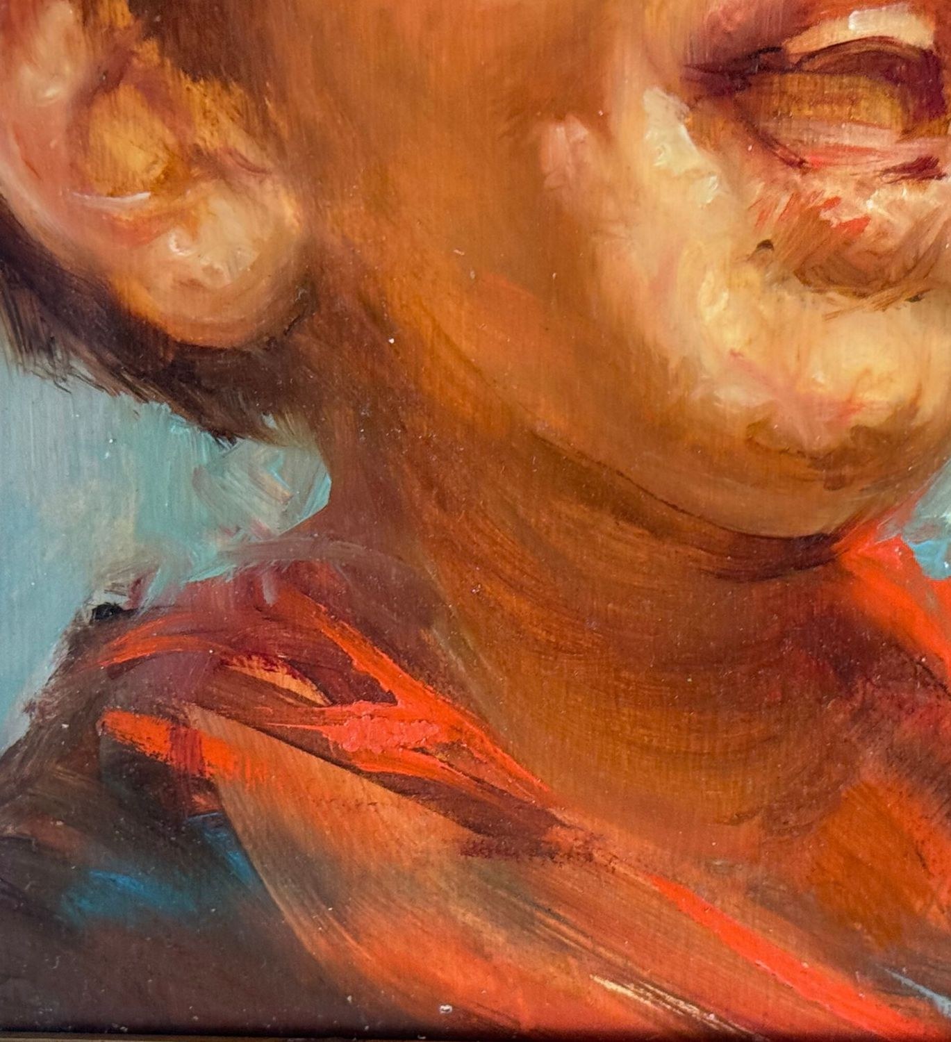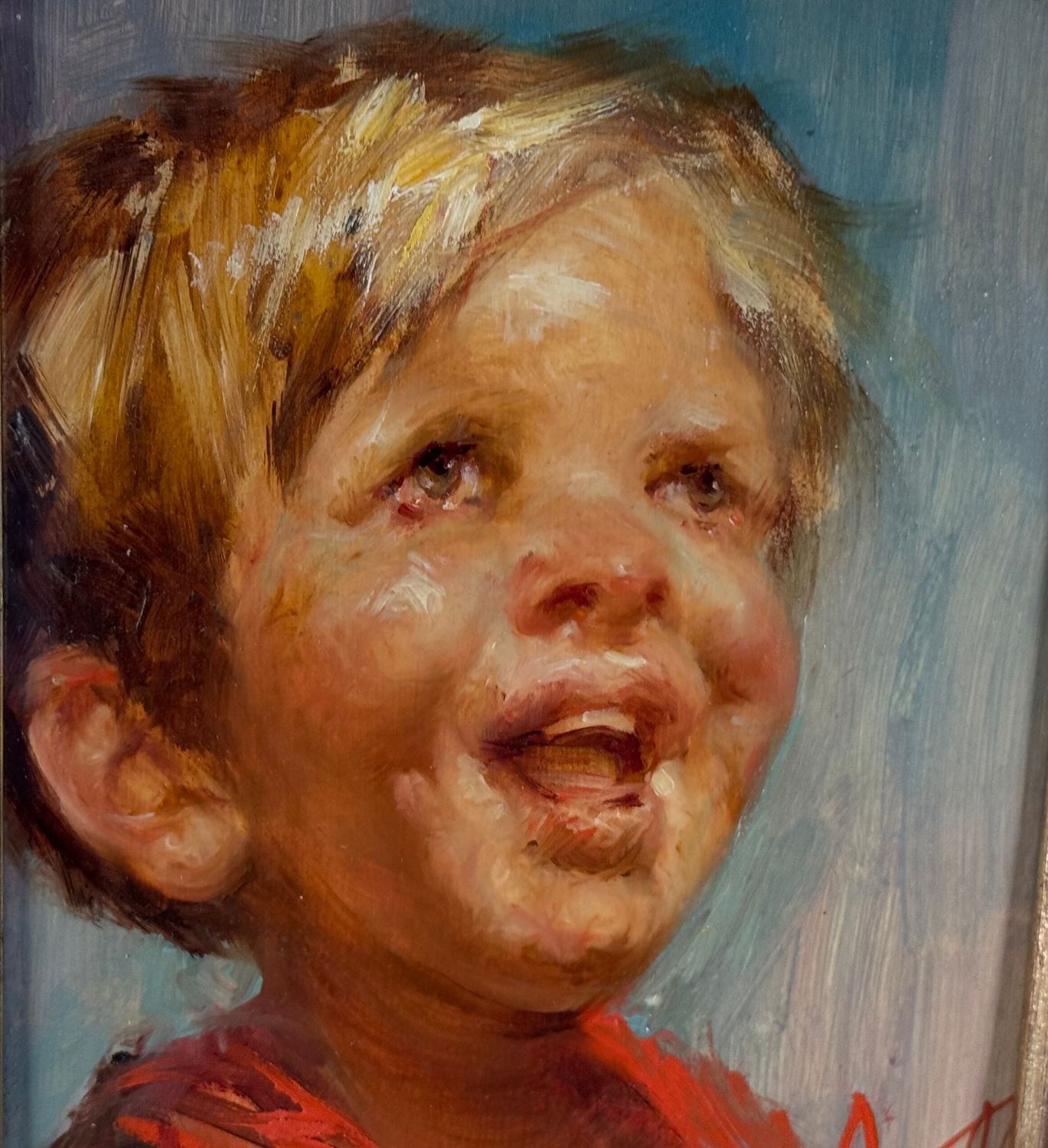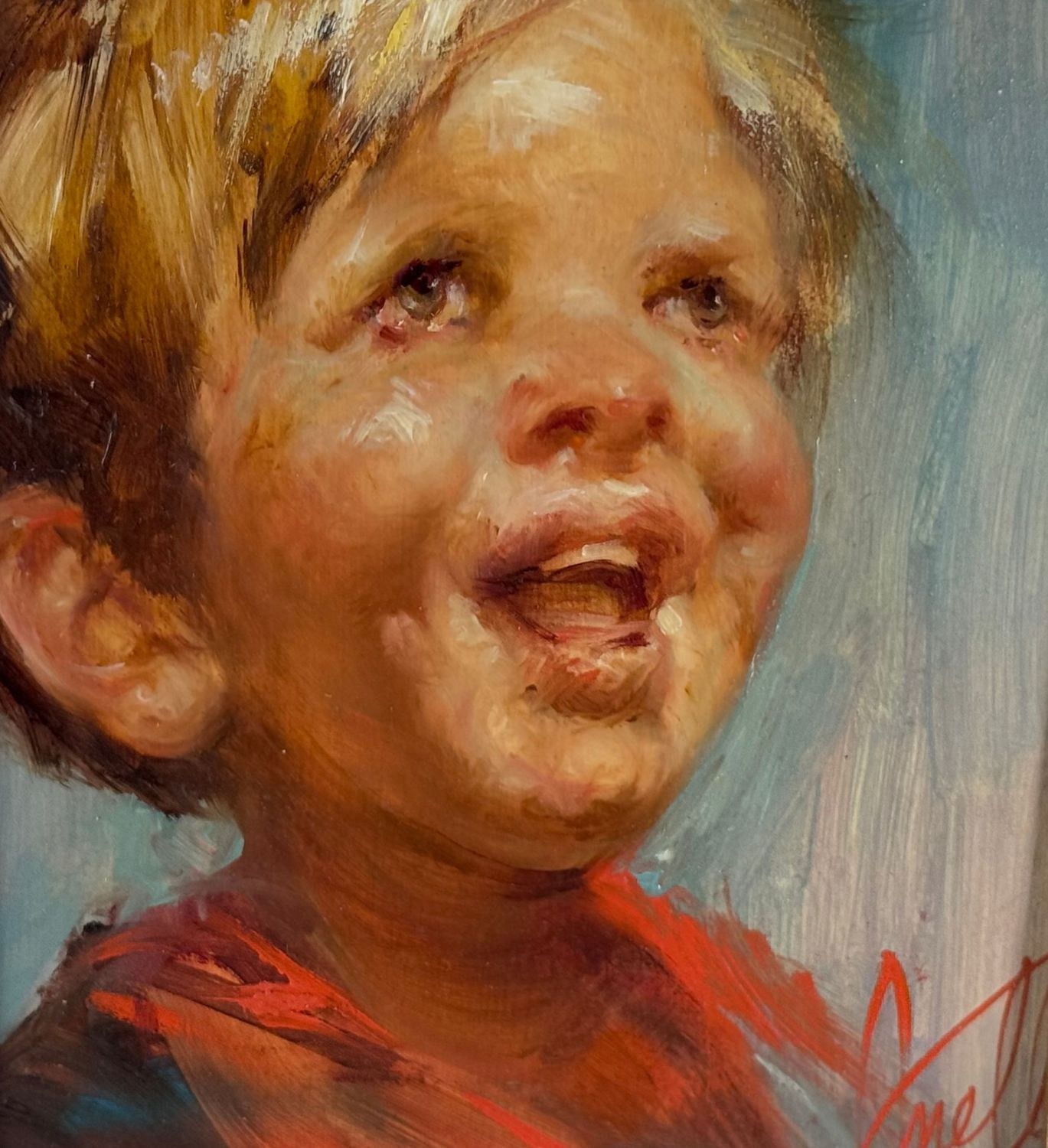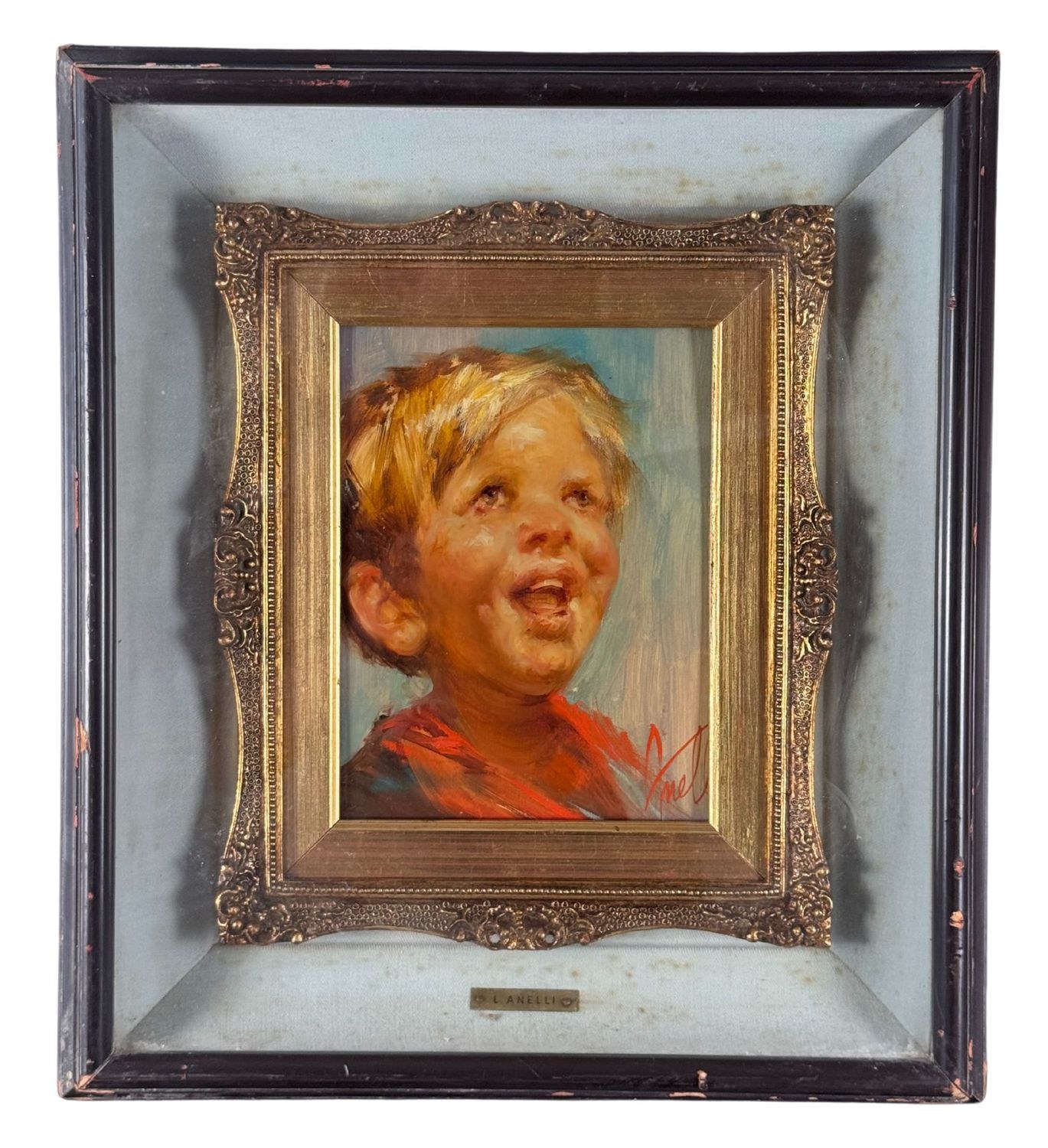 Oil painting on panel, 20th century, Italian school, depicting a Portrait of a Child. Dimensions including frame: 43x48 cm. Inner frame dimensions: 21x25 cm. Signed lower right by L. Anelli. Artwork in good condition.