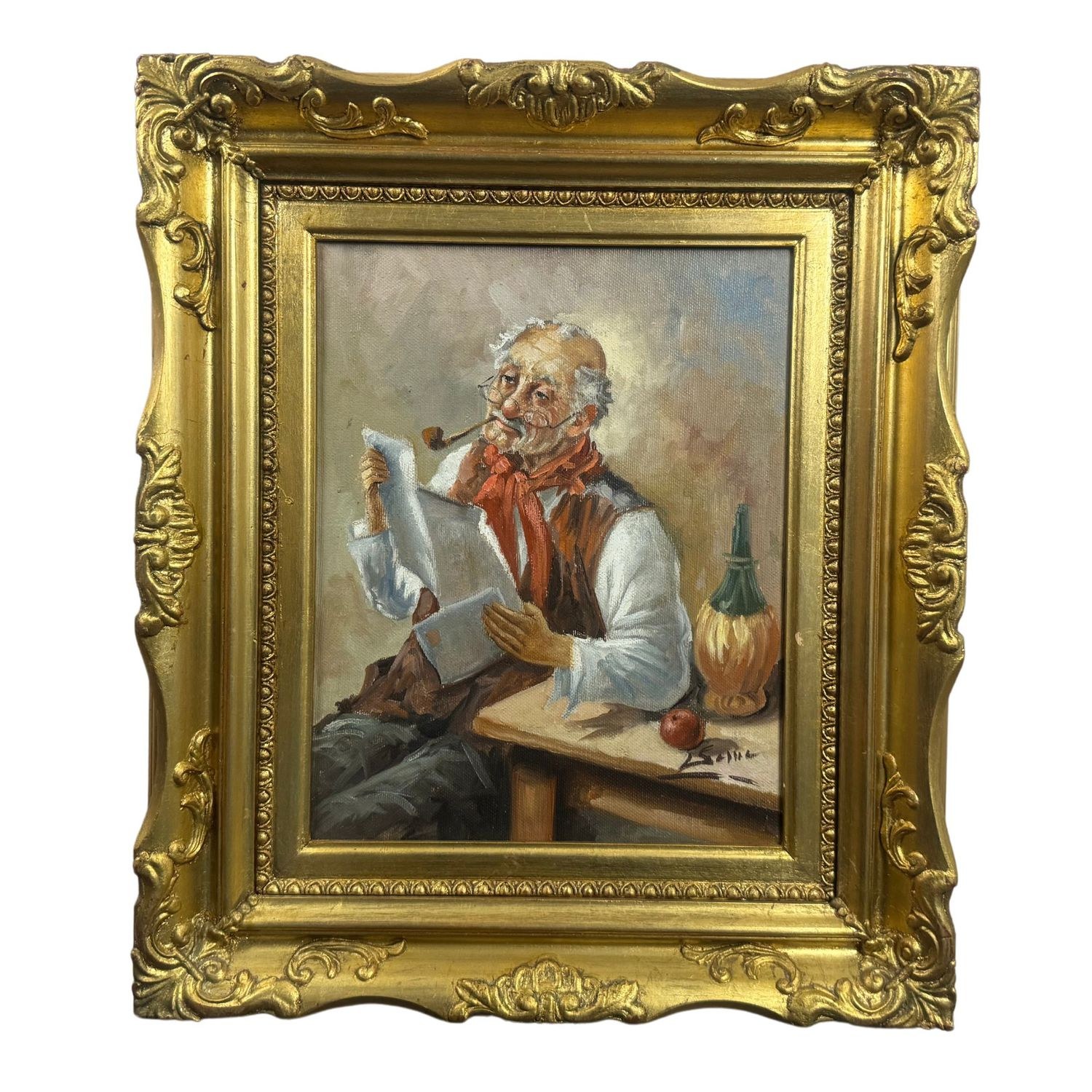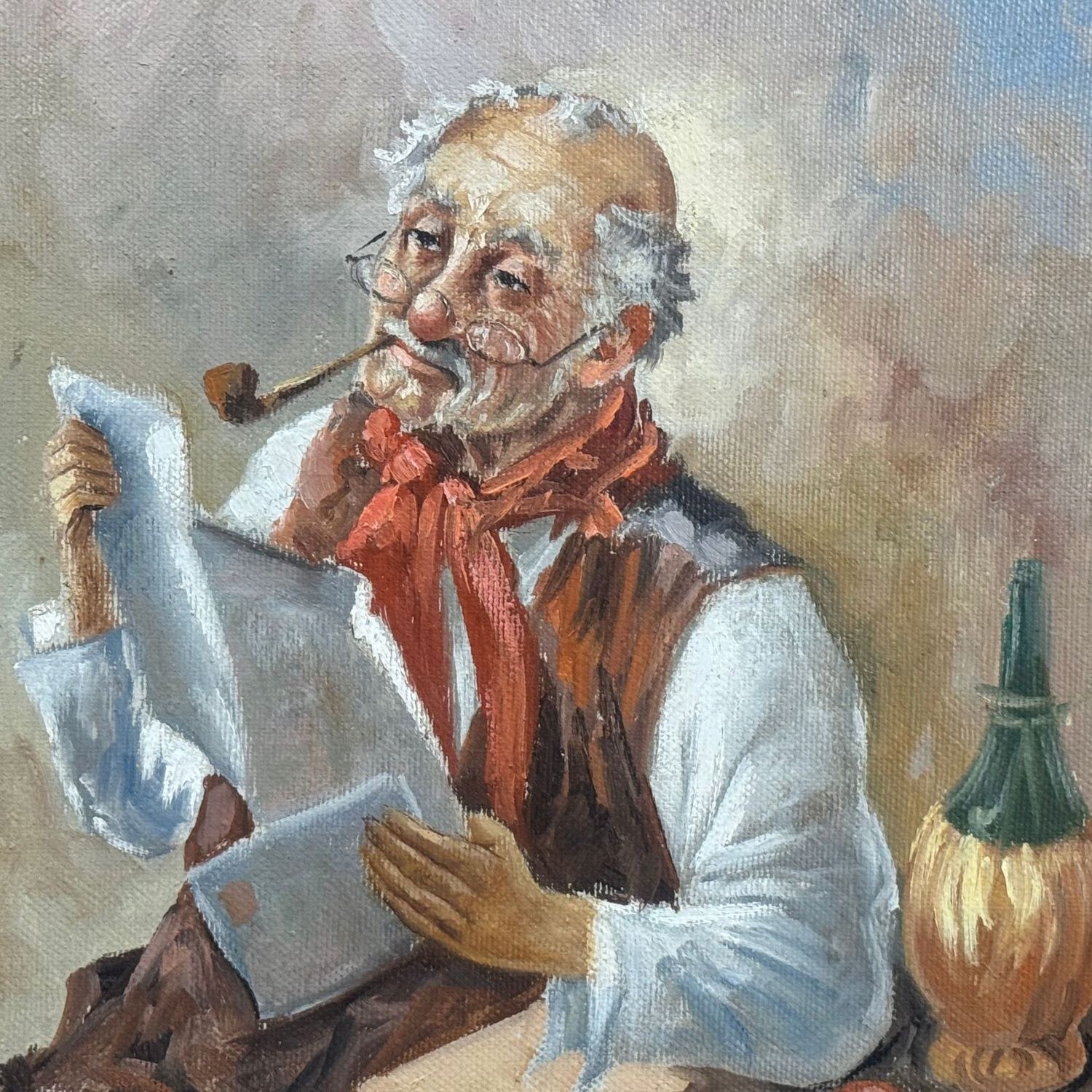 Oil painting on canvas, 20th-century Italian school, depicting Elderly Man with Pipe Reading.