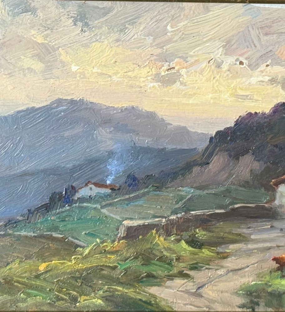 Oil painting on panel, 20th-century Italian school, depicting a countryside landscape with farmhouse. Dimensions including frame: 45x32 cm. Inner frame dimensions: 35x21 cm. Signed lower right and on the back: Leon Giuseppe Buono (1888 – Pozzuoli, 1976). Work in excellent condition.
