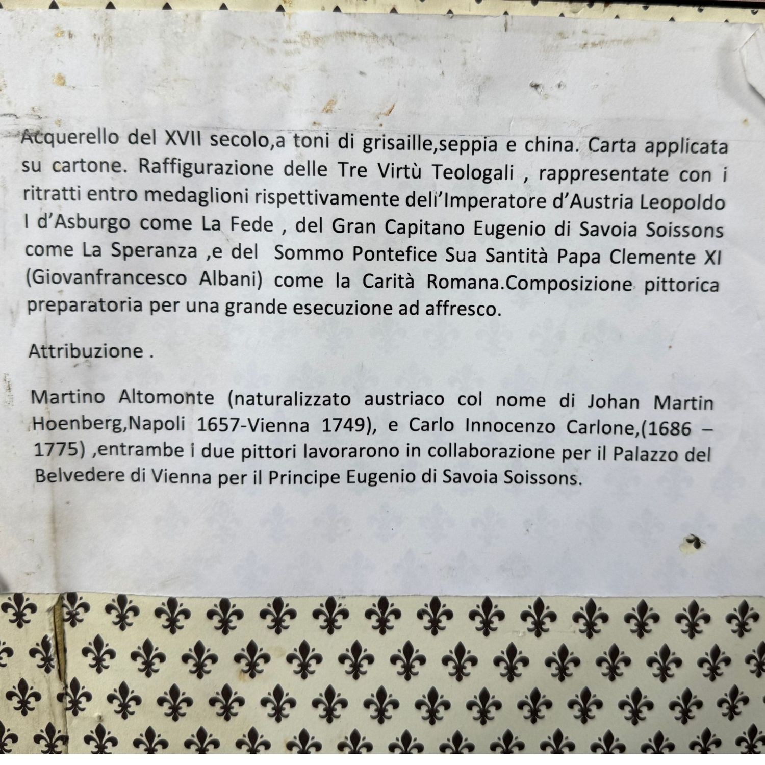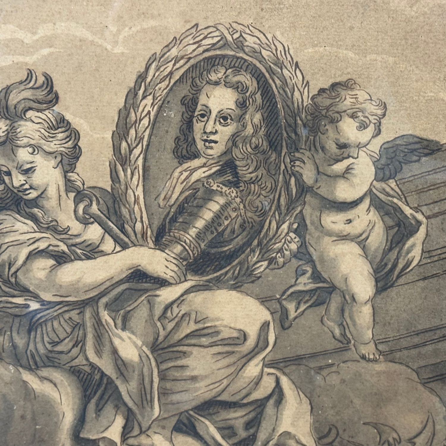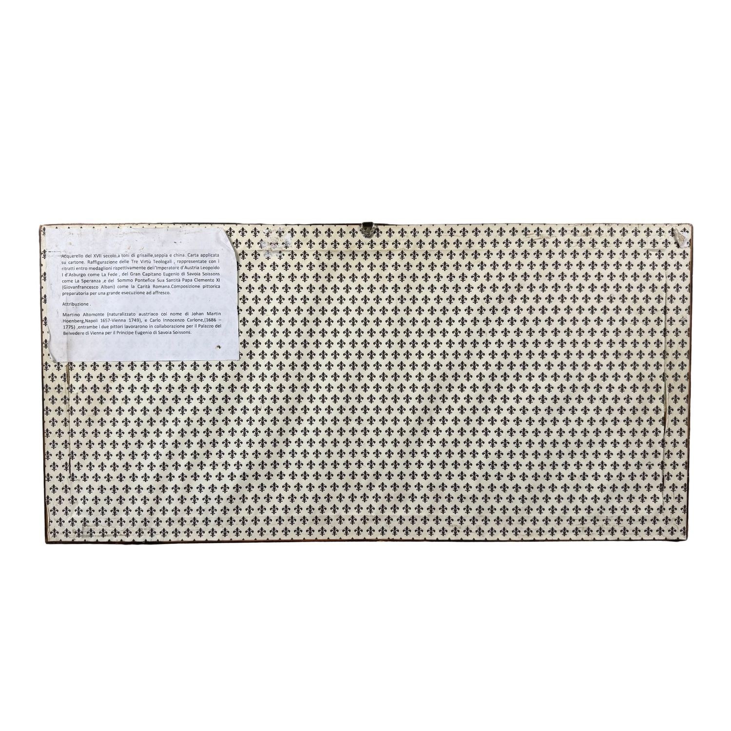 Watercolor from the 18th century, rendered in tones of grisaille, sepia, and ink. Paper applied to cardboard. Depiction of the Three Theological Virtues, represented with portraits within medallions respectively of the Emperor of Austria Leopold of Habsburg as Faith, the Great Captain Eugene of Savoy Soissons as Hope, and the Supreme Pontiff His Holiness Pope Clement XI (Gianfrancesco Albani) as Roman Charity.