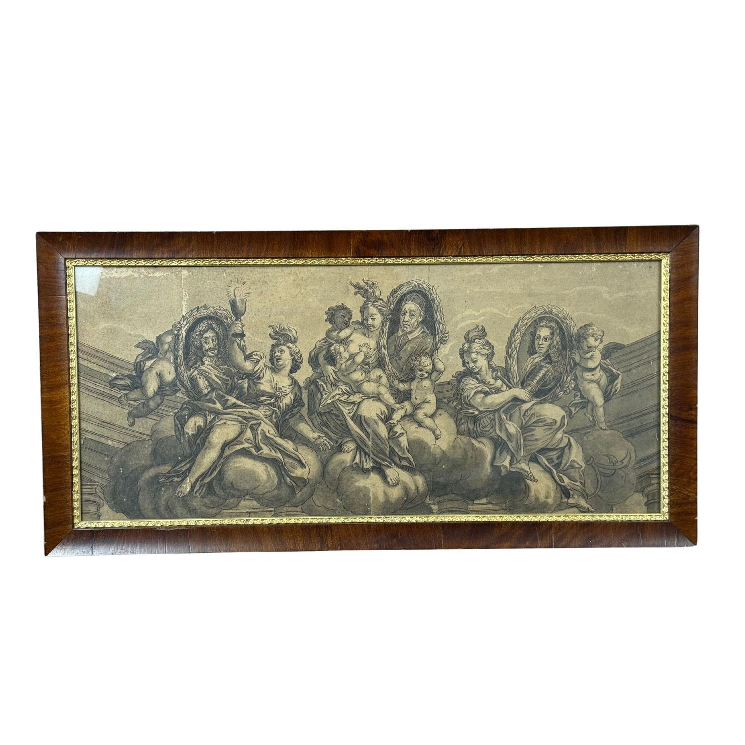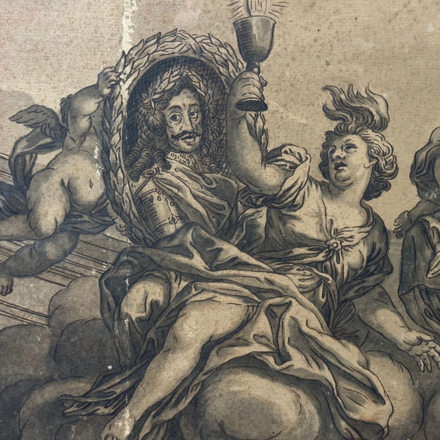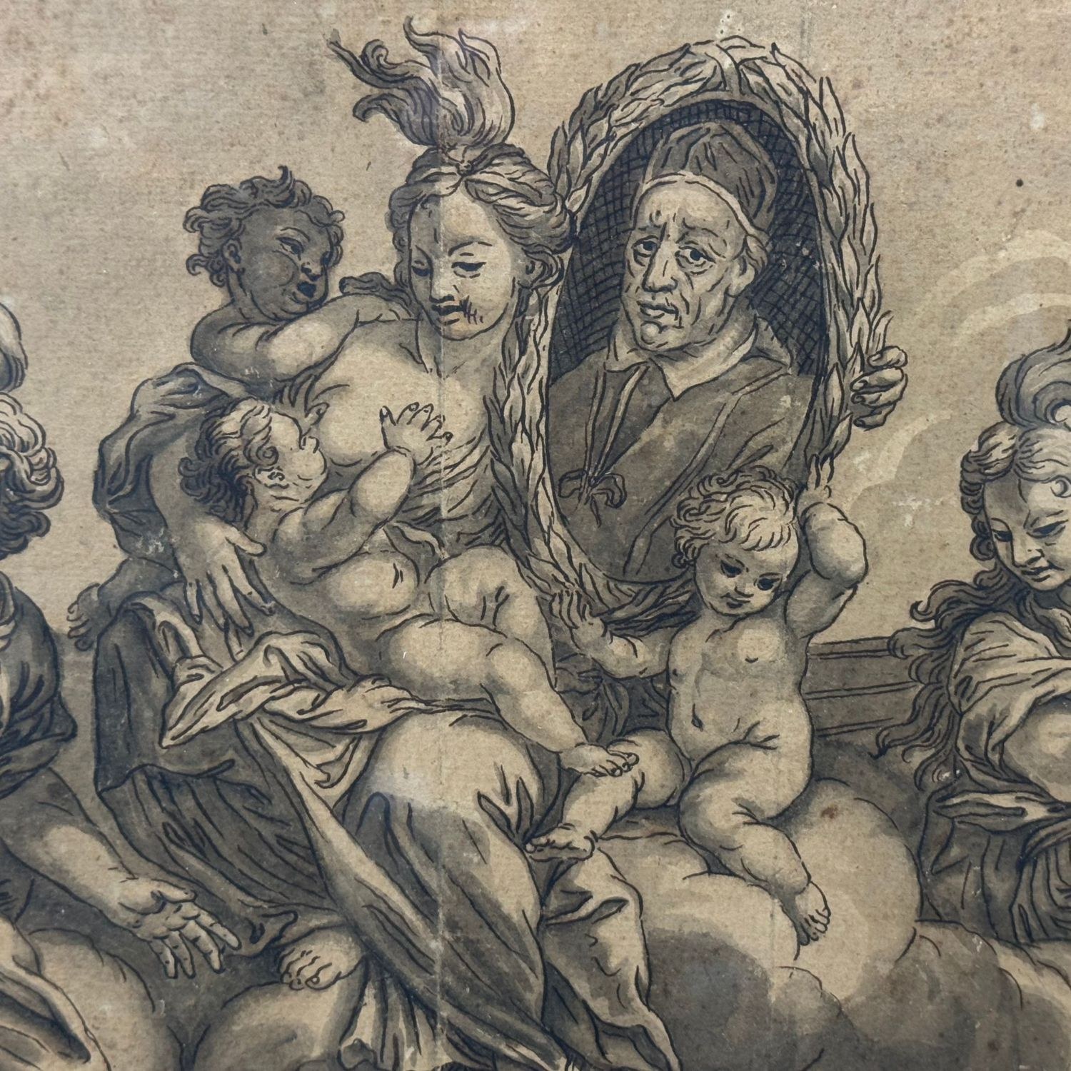 Watercolor from the 18th century, rendered in tones of grisaille, sepia, and ink. Paper applied to cardboard. Depiction of the Three Theological Virtues, represented with portraits within medallions respectively of the Emperor of Austria Leopold of Habsburg as Faith, the Great Captain Eugene of Savoy Soissons as Hope, and the Supreme Pontiff His Holiness Pope Clement XI (Gianfrancesco Albani) as Roman Charity.