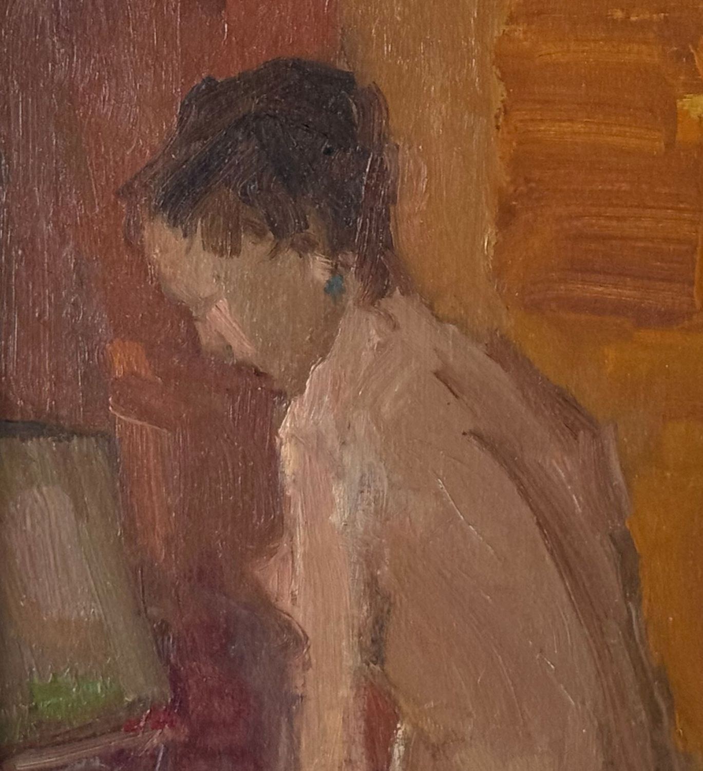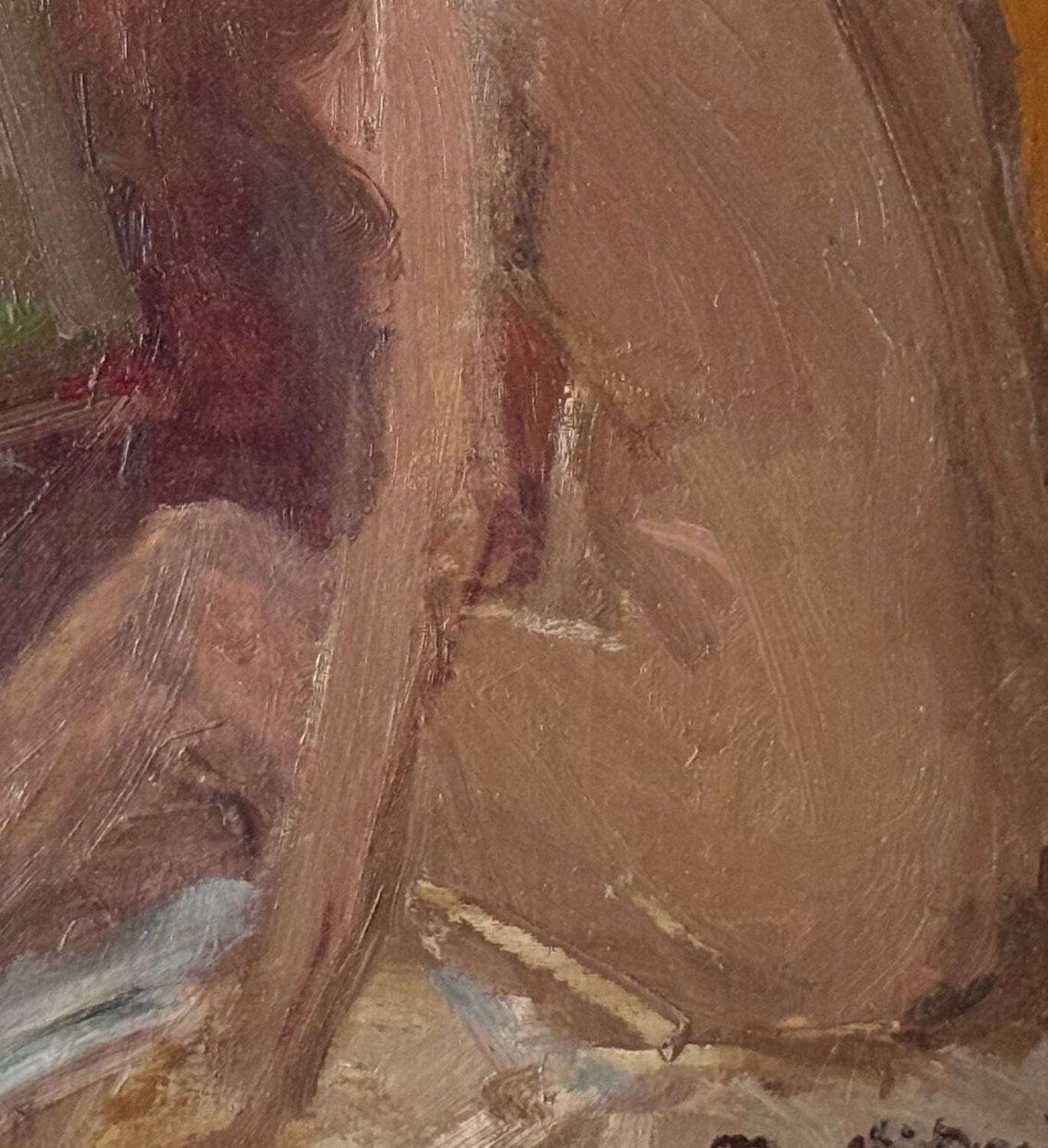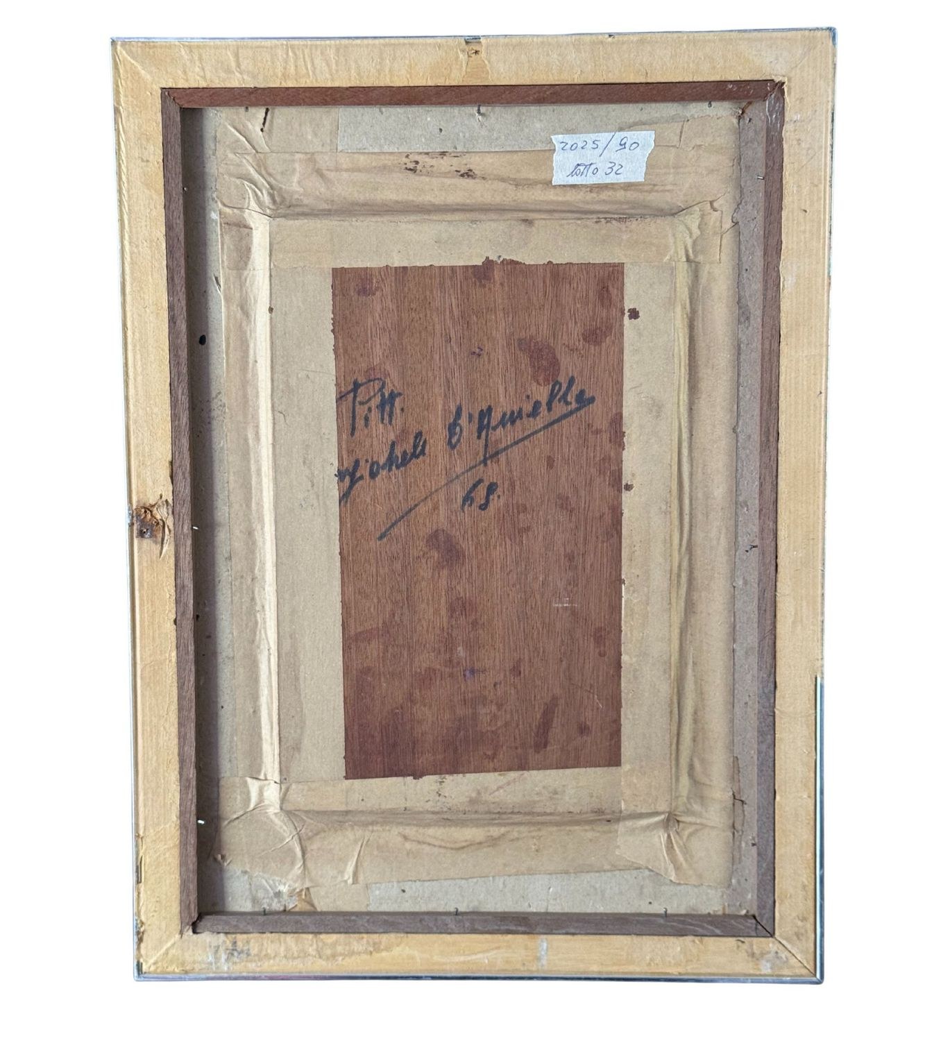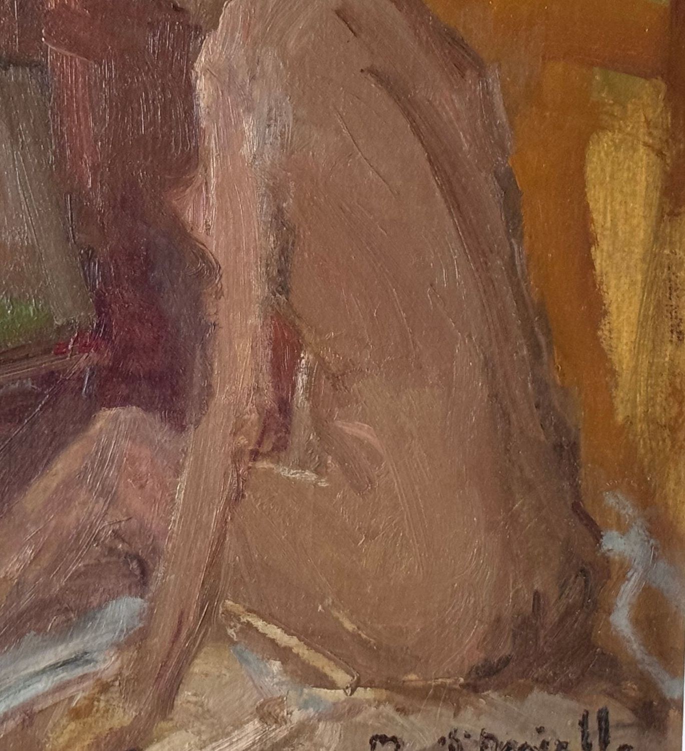 Oil on panel painting, 20th century, Italian school, depicting a female nude. Dimensions including frame: 35 x 47 cm. Inner frame dimensions: 20 x 30 cm. Signed lower right *M. D'Aniello*. The artwork is in good condition.
