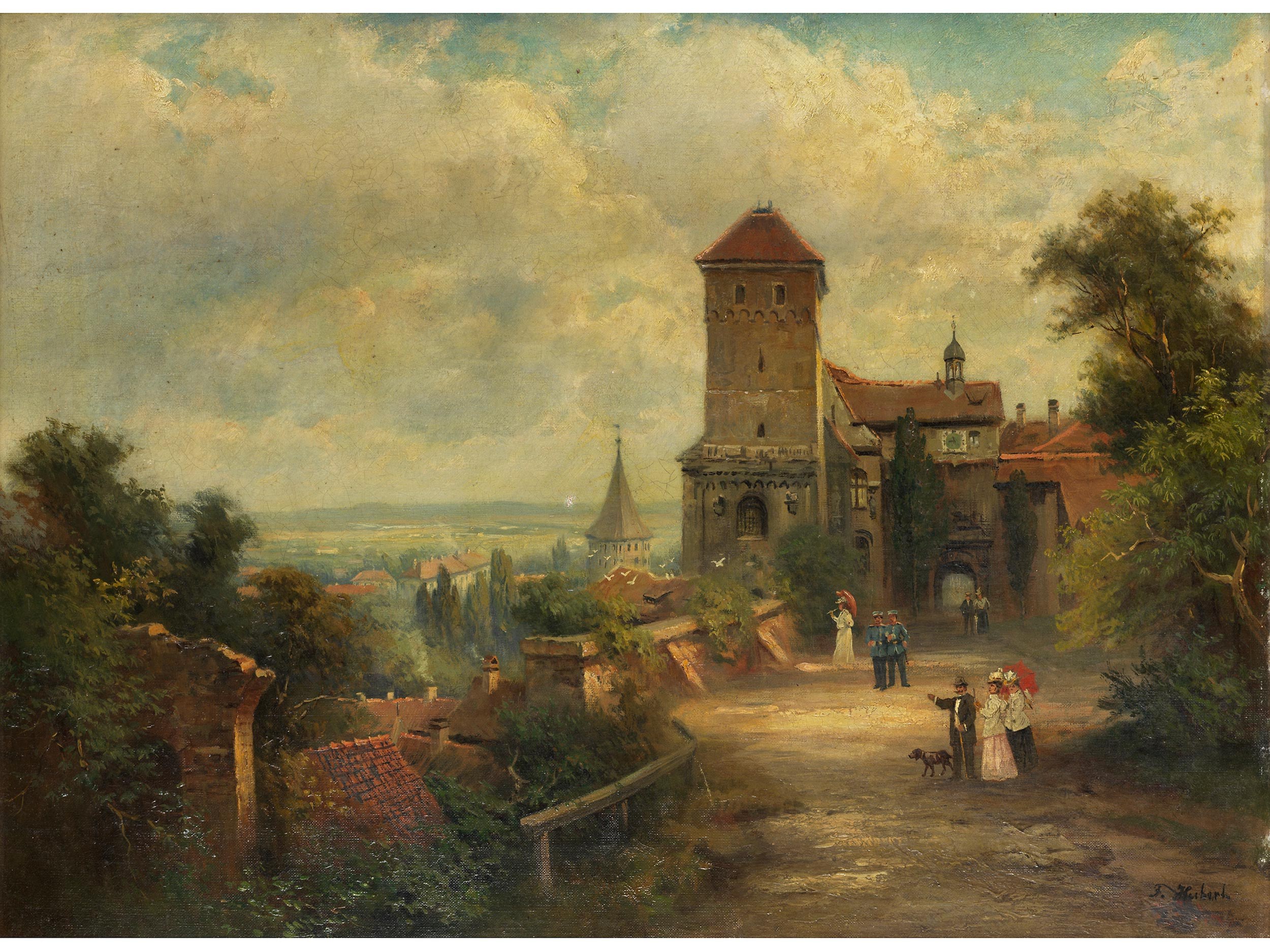 Vor den Mauern mit Turm der Stadt mehrere Spaziergänger, die Aussicht in die Ferne genießend. Vereinzelt Retuschen, min. Loch. (1410105) (18)
