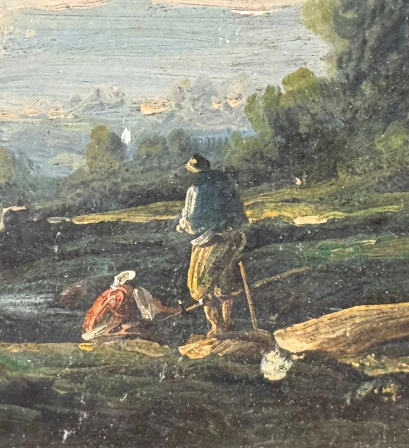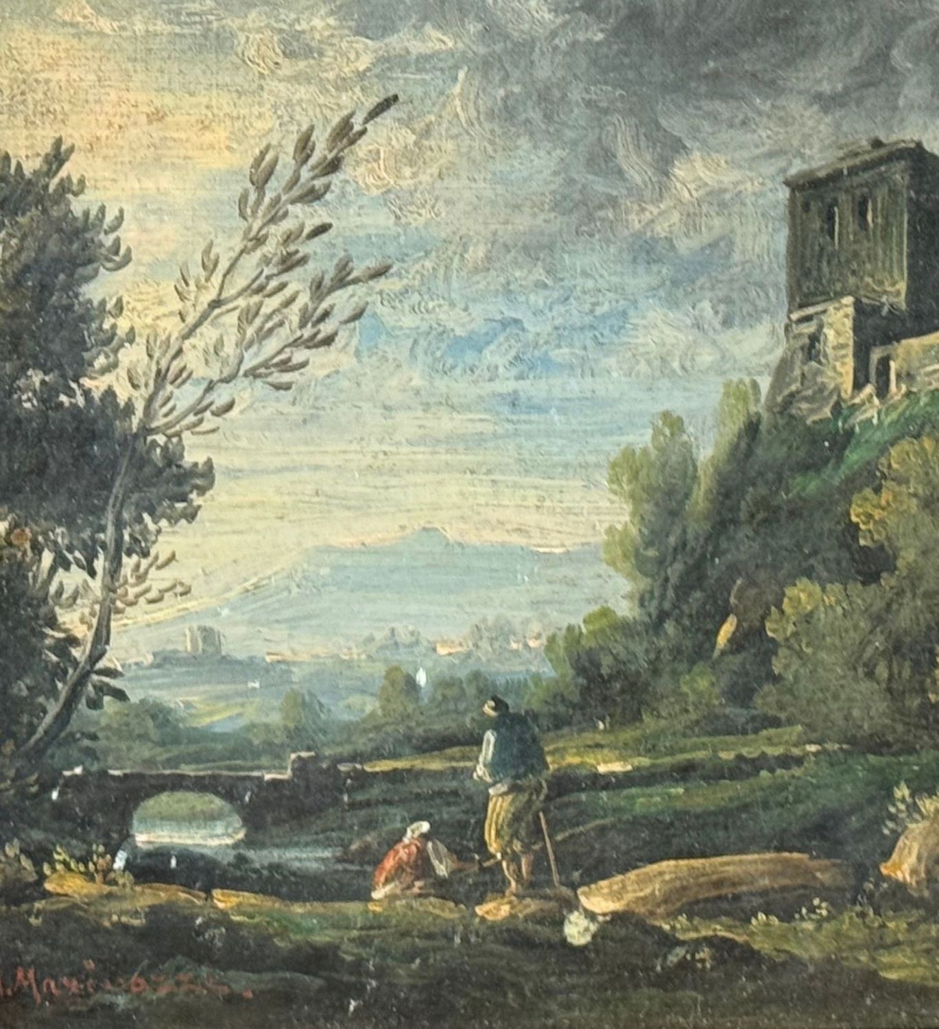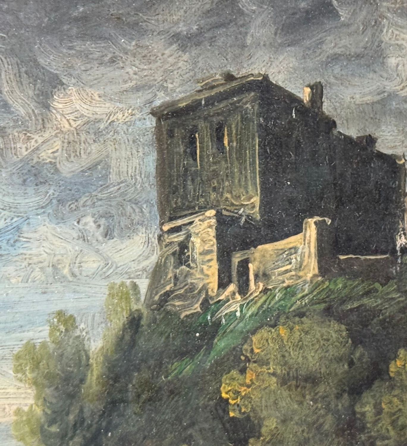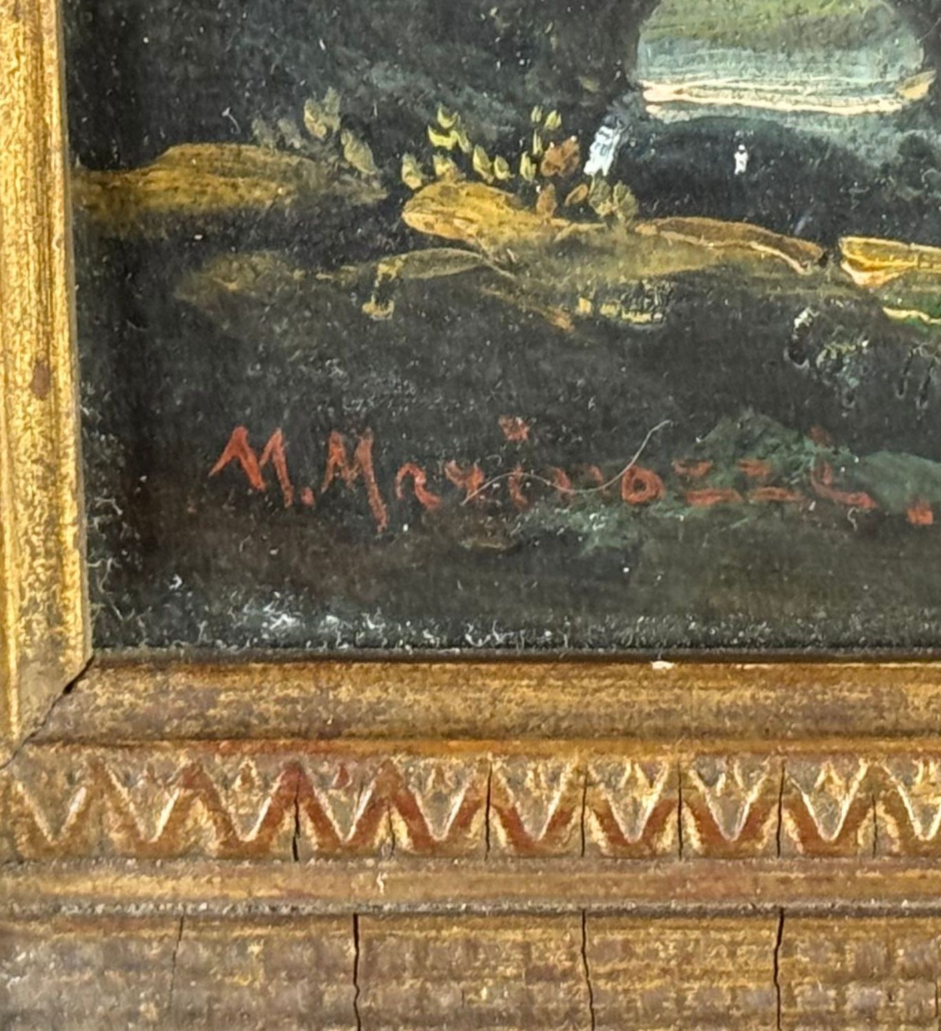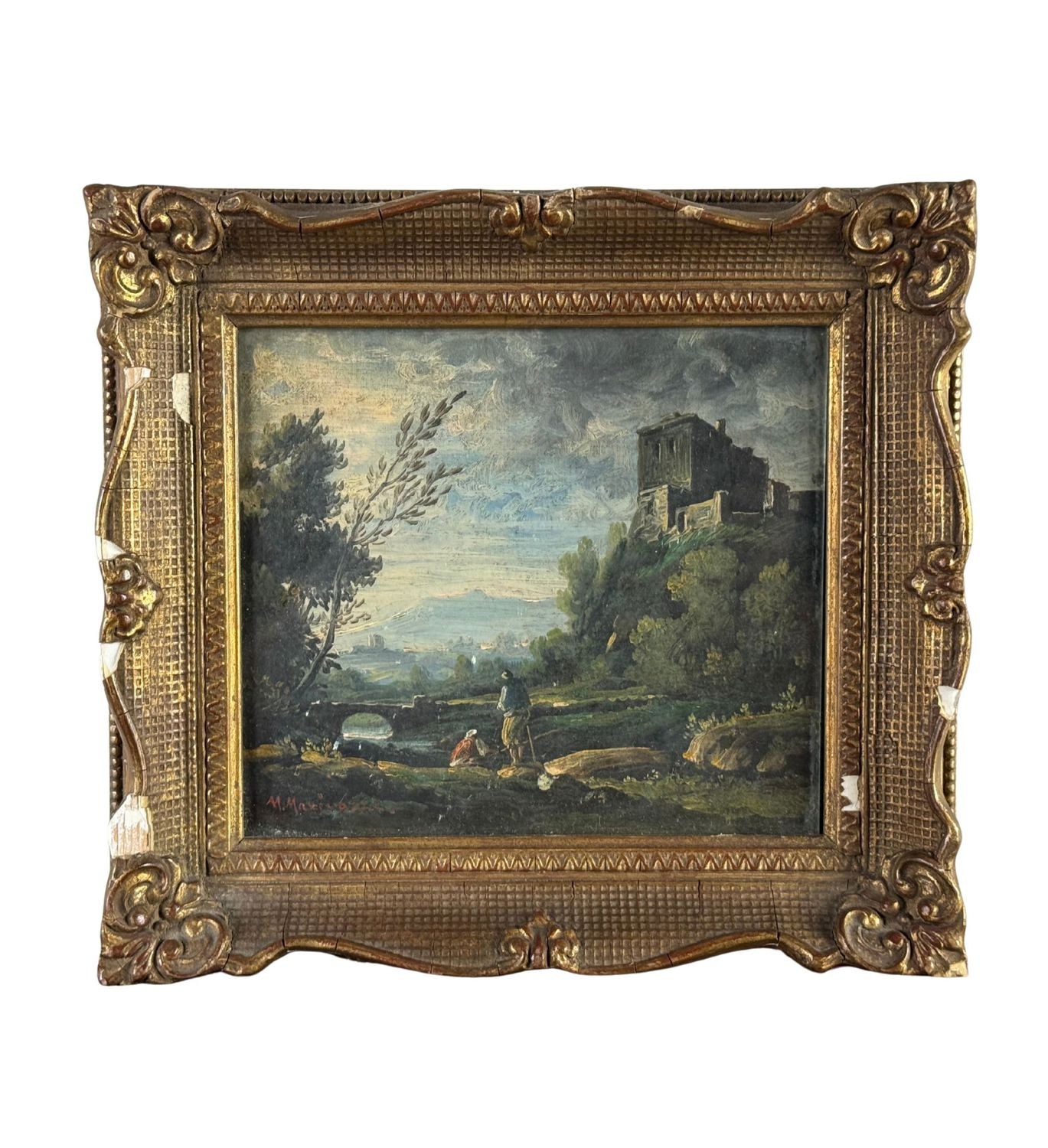 Oil painting on canvas, 20th-century period, Italian school, depicting a landscape with ruins. Dimensions including frame: 23x22 cm. Dimensions inside the frame: 16x18 cm. Signed at the bottom left Manrico Marinozzi (1903-1973). Work in good condition. Frame requires restoration.