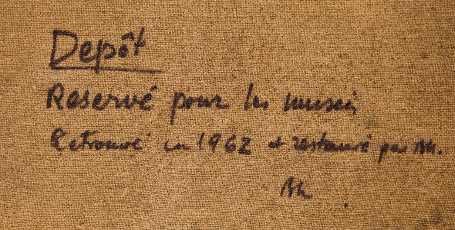 opisany na odwrociu przez Bolesława Nawrockiego: 'Depôt | Réserve pour le musée | Retrouvé en 1962 et restauré per BN. | BN', na krośnie malarskim nalepki wystawowe Galerie Gmurzynska w Kolonii