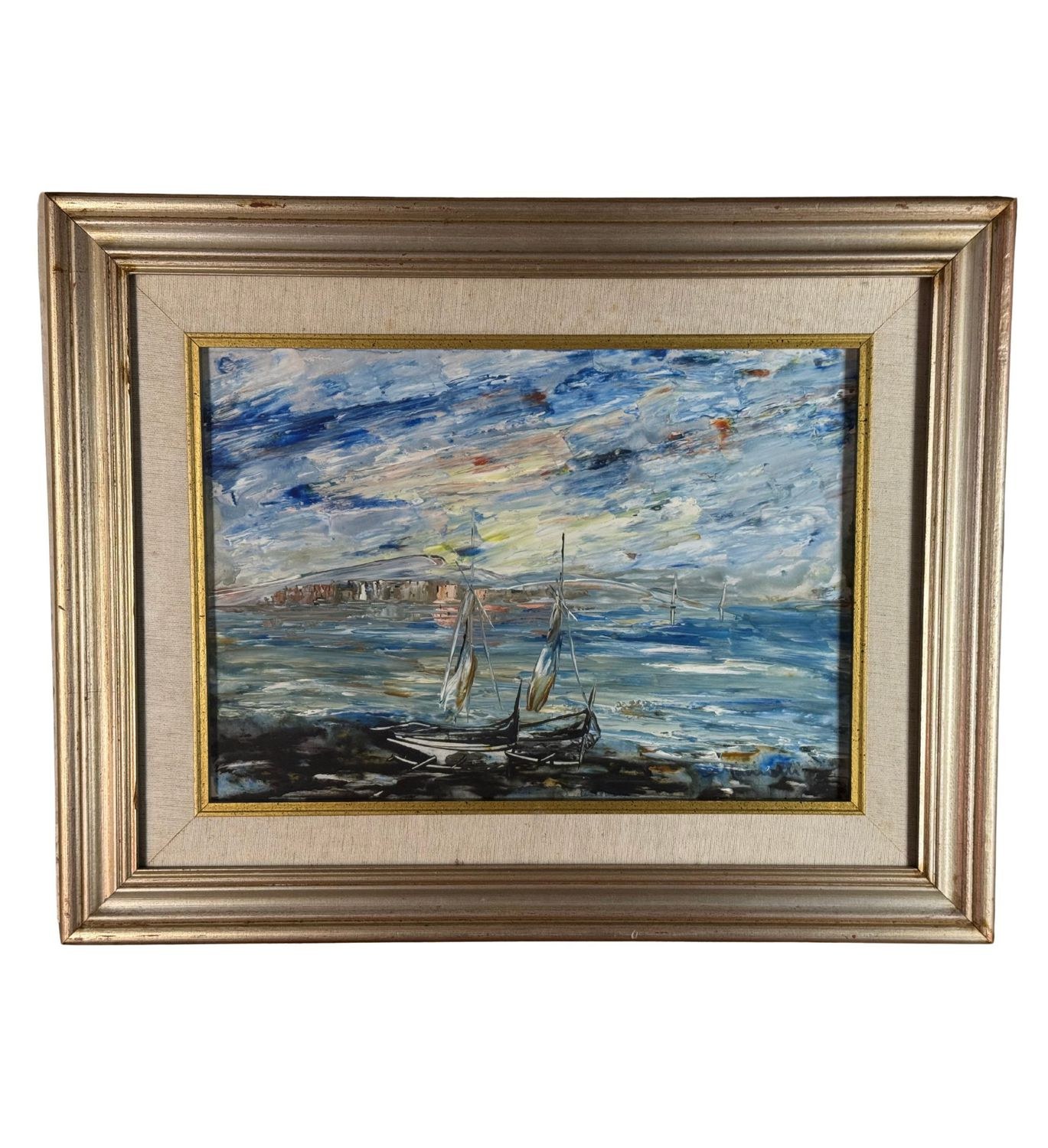 Oil painting on cardboard, 20th-century period, Italian school, depicting a seascape. Dimensions including frame: 70x55 cm. Dimensions inside the frame: 50x36 cm. Signed at the lower right Marinelli. Artwork in good condition.