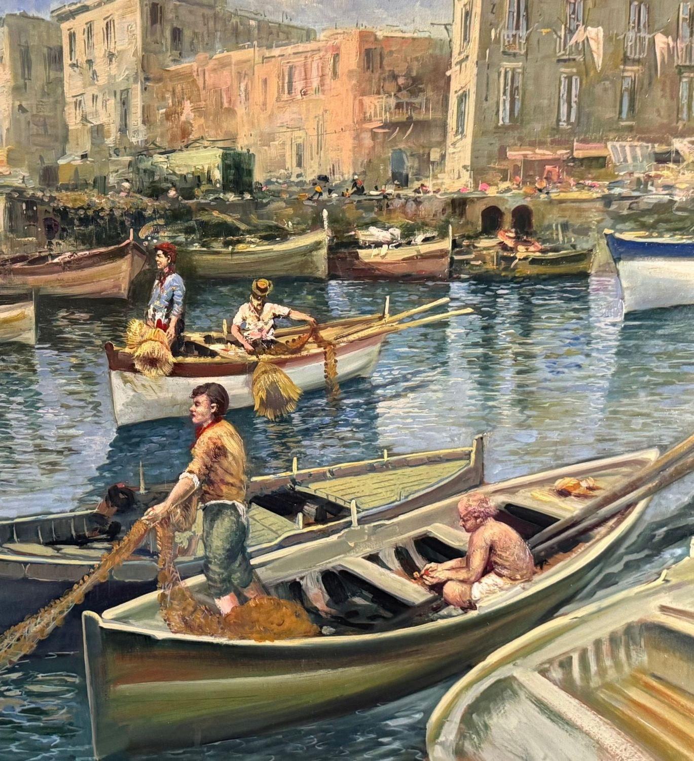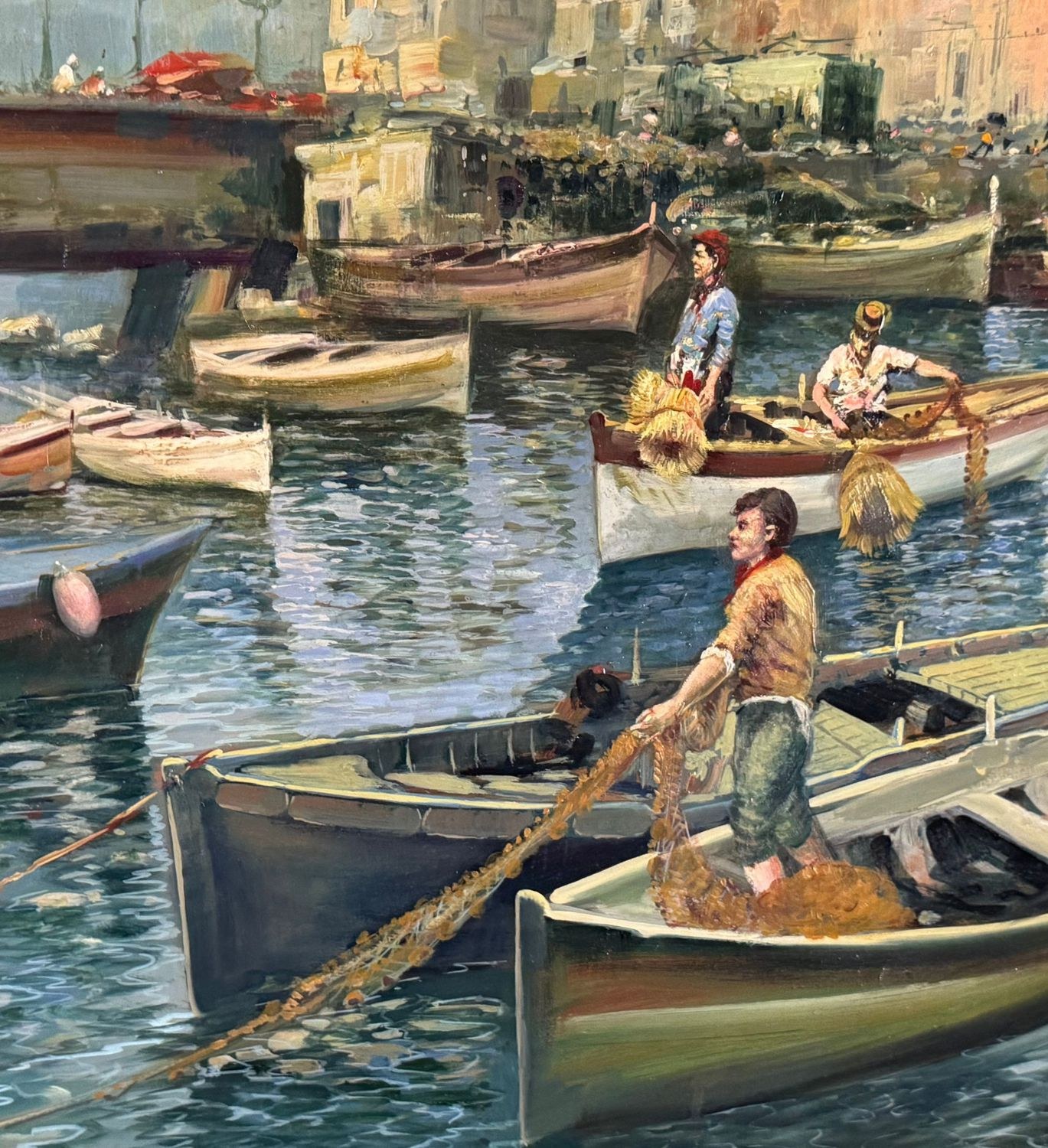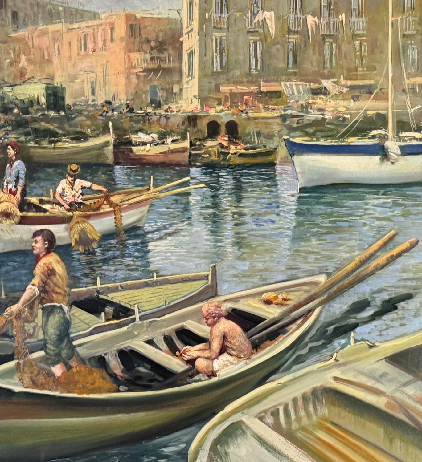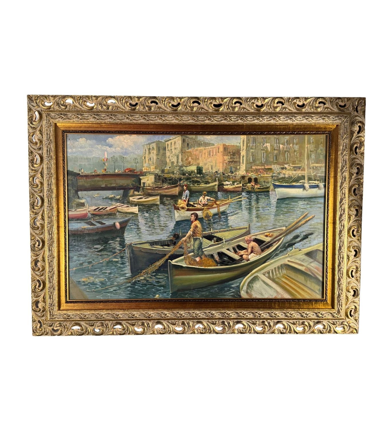 Oil on panel painting, 20th-century period, Italian school, depicting a seascape with boats. Dimensions including frame: 108x79 cm. Inner frame dimensions: 85x55 cm. Signed on the back by Marino Faliero. The artwork is in excellent condition.