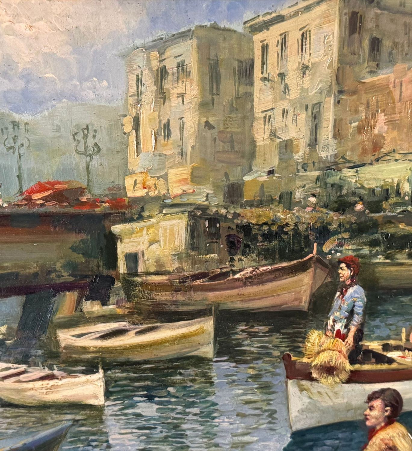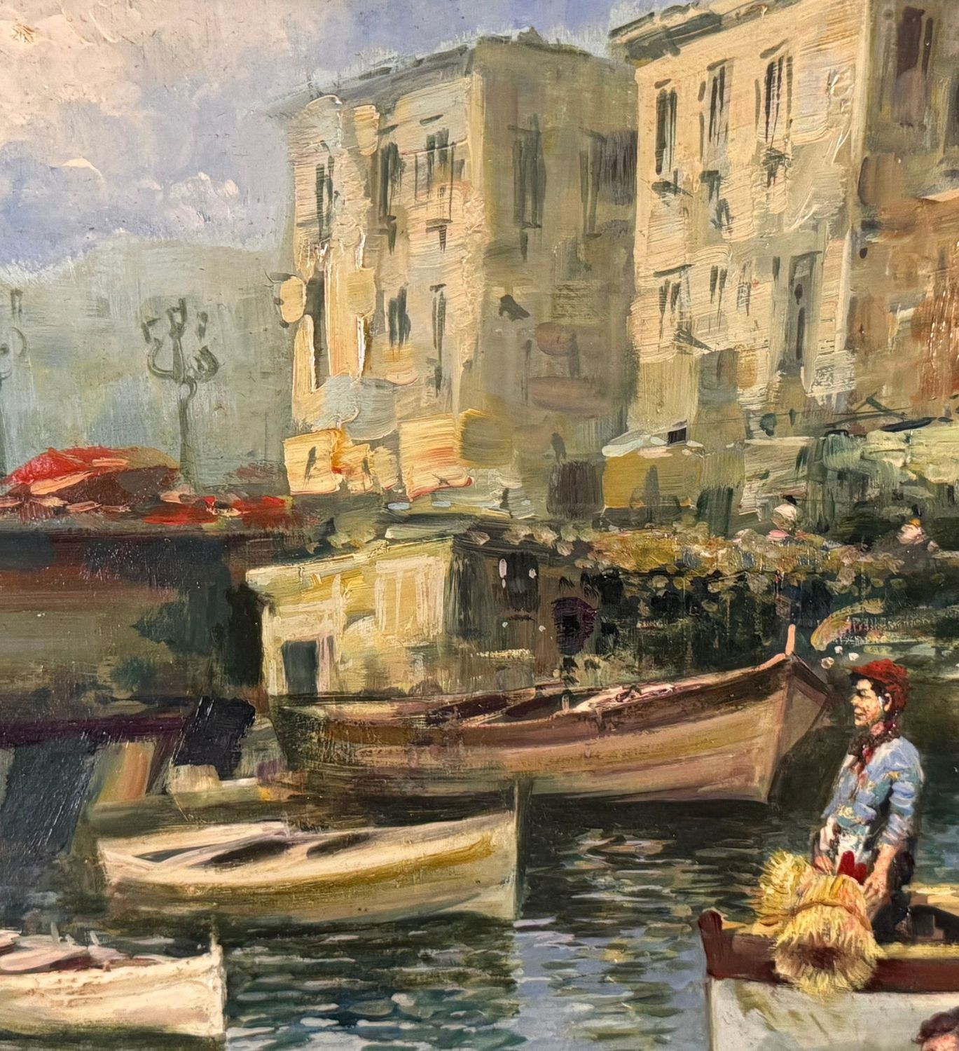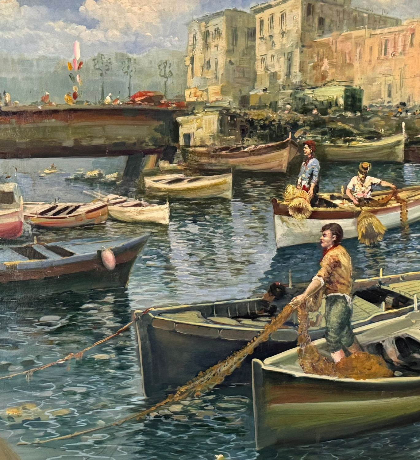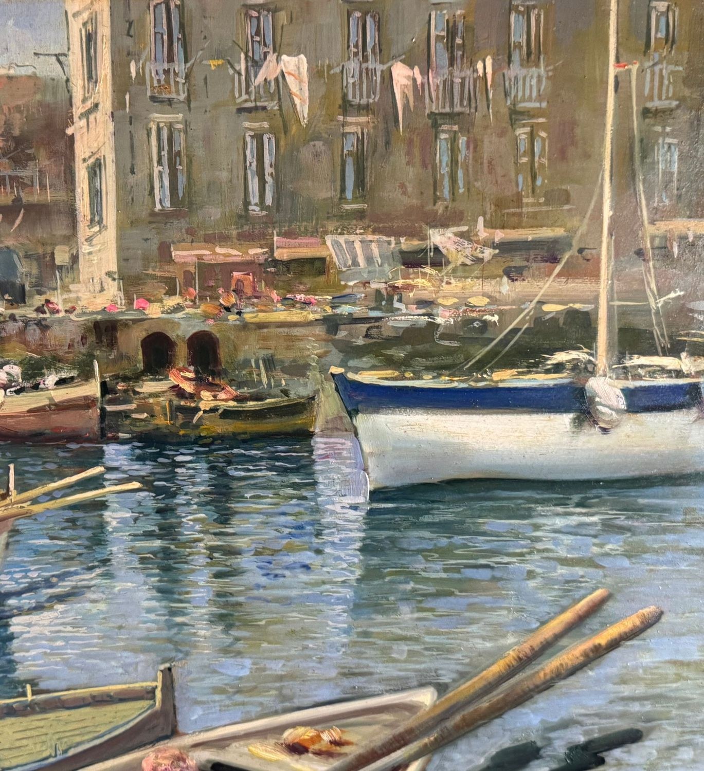Oil on panel painting, 20th-century period, Italian school, depicting a seascape with boats. Dimensions including frame: 108x79 cm. Inner frame dimensions: 85x55 cm. Signed on the back by Marino Faliero. The artwork is in excellent condition.