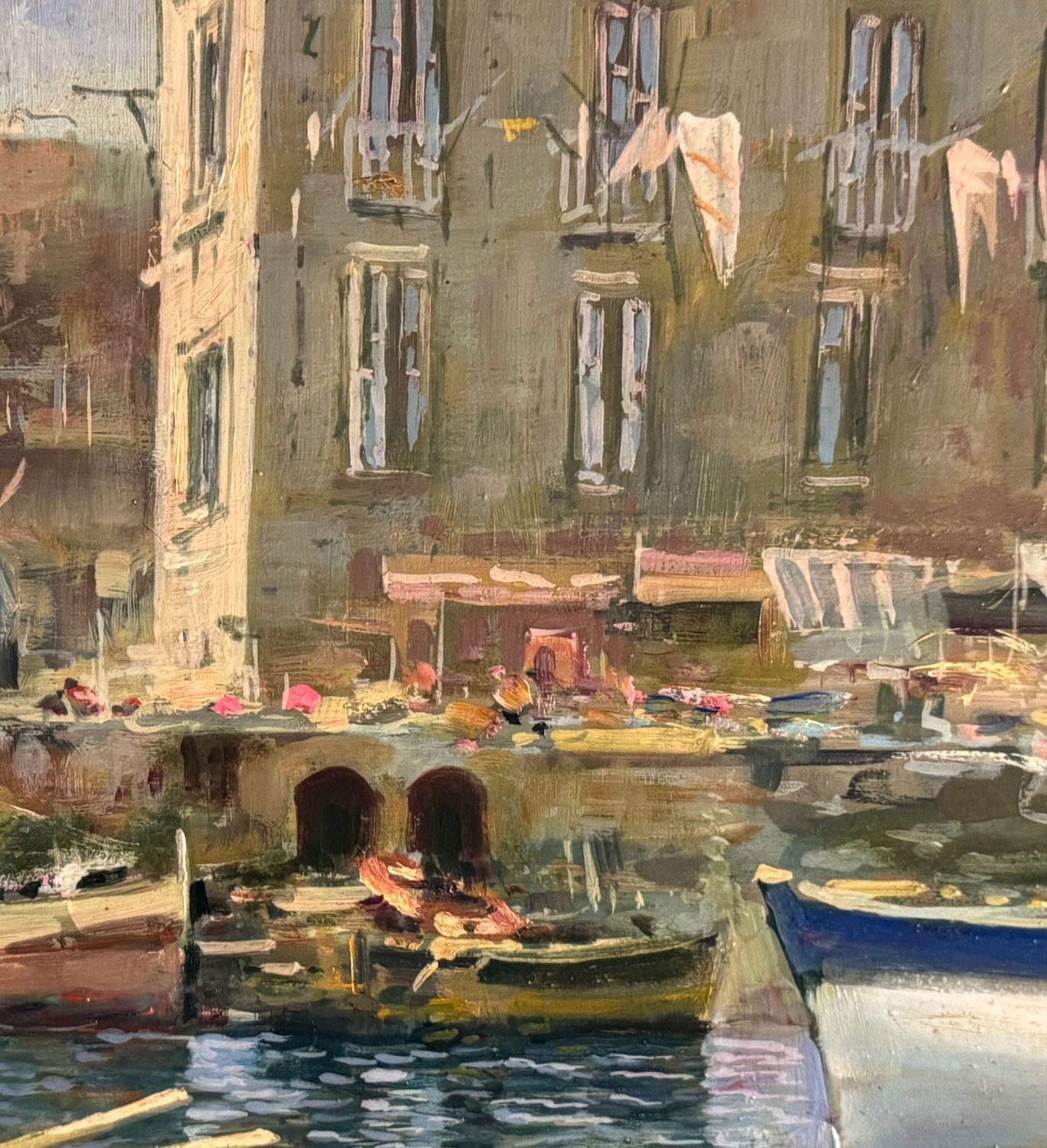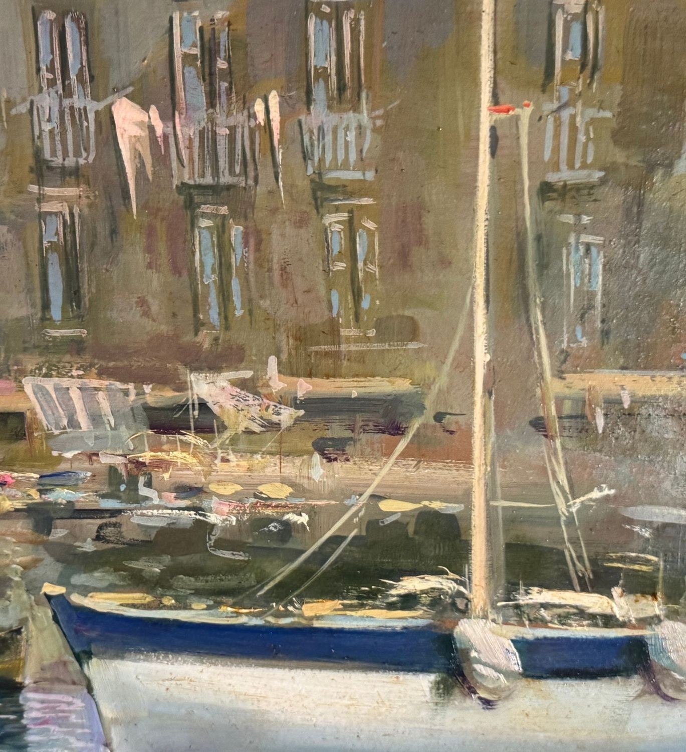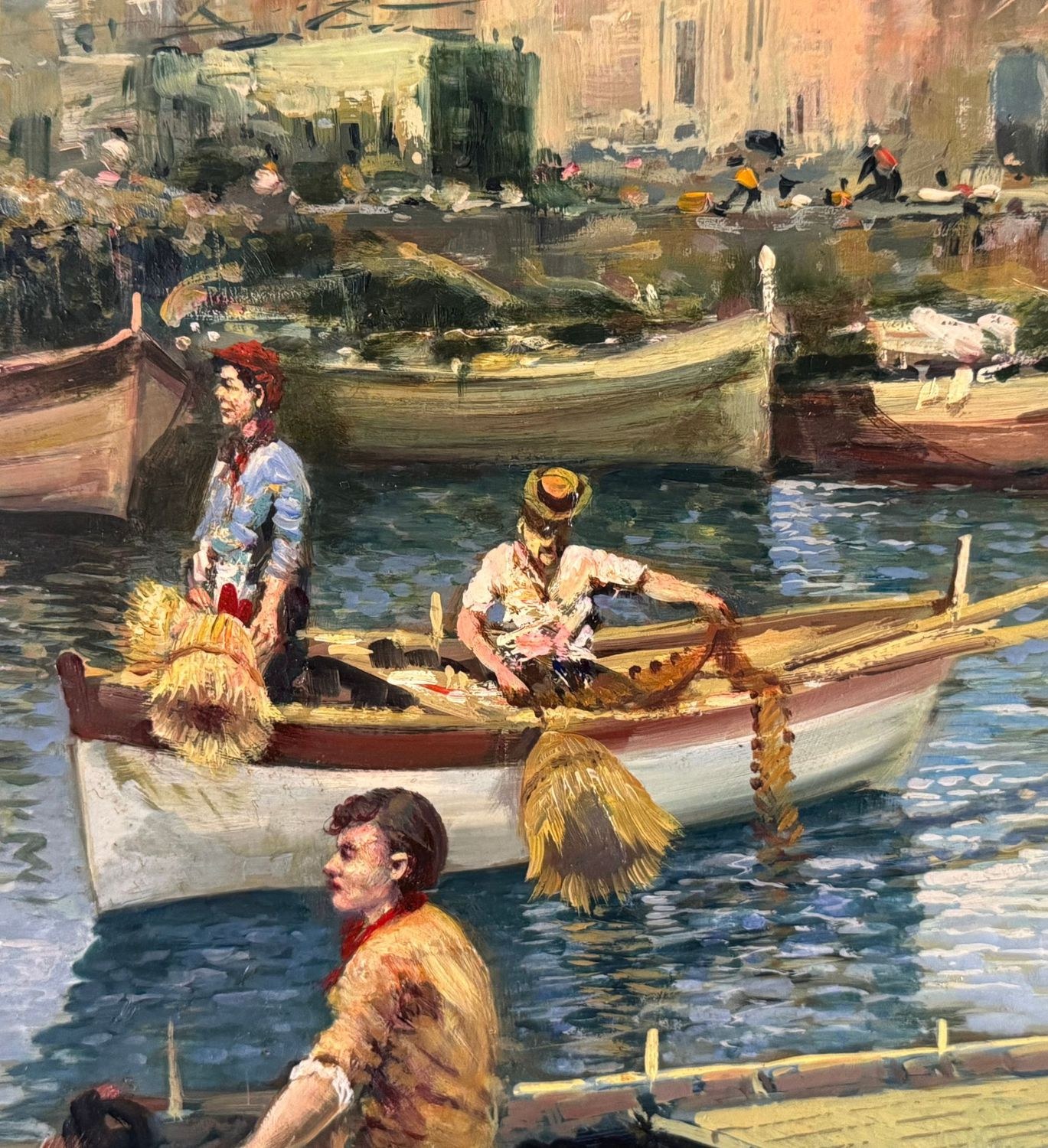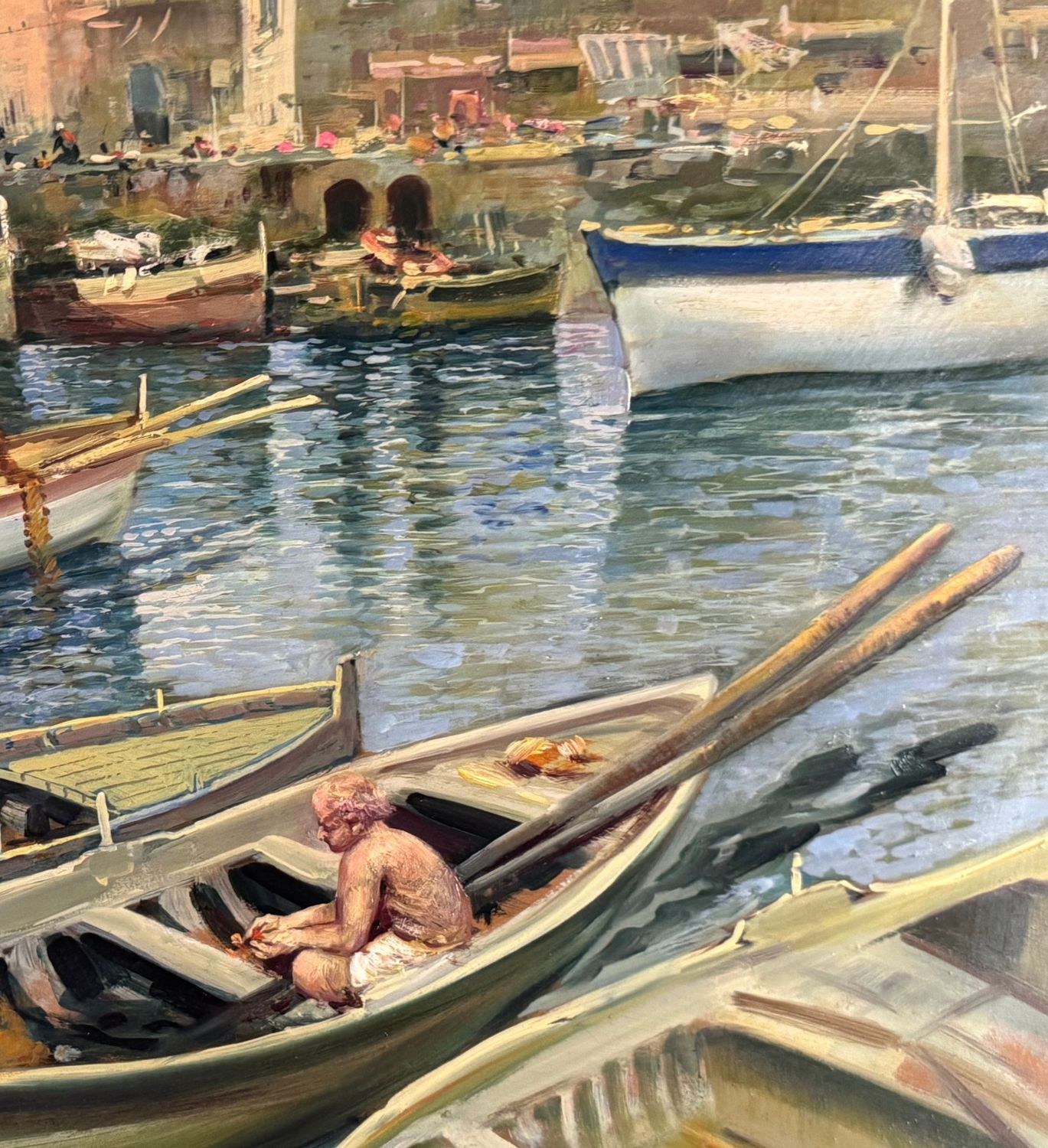 Oil on panel painting, 20th-century period, Italian school, depicting a seascape with boats. Dimensions including frame: 108x79 cm. Inner frame dimensions: 85x55 cm. Signed on the back by Marino Faliero. The artwork is in excellent condition.