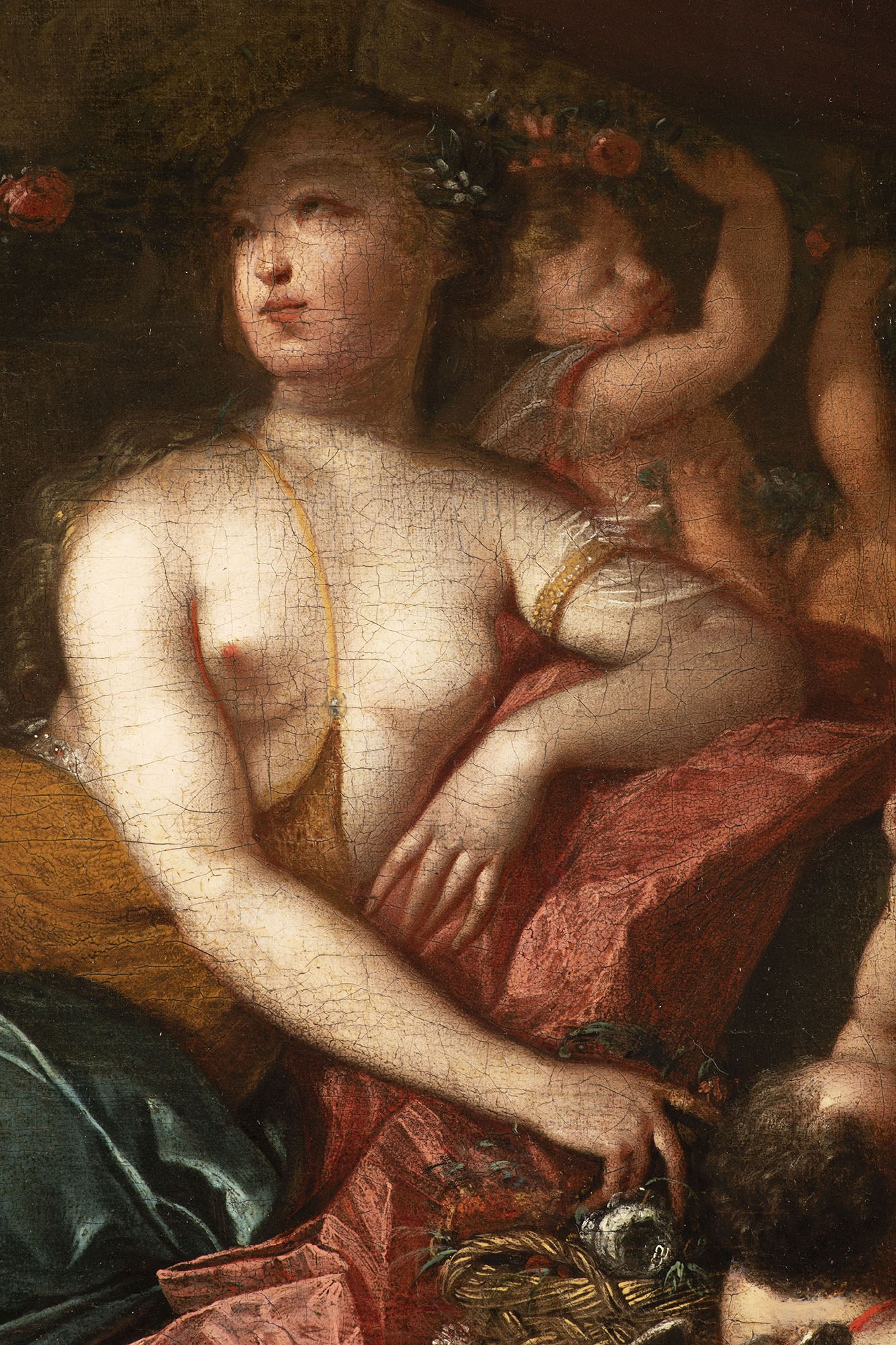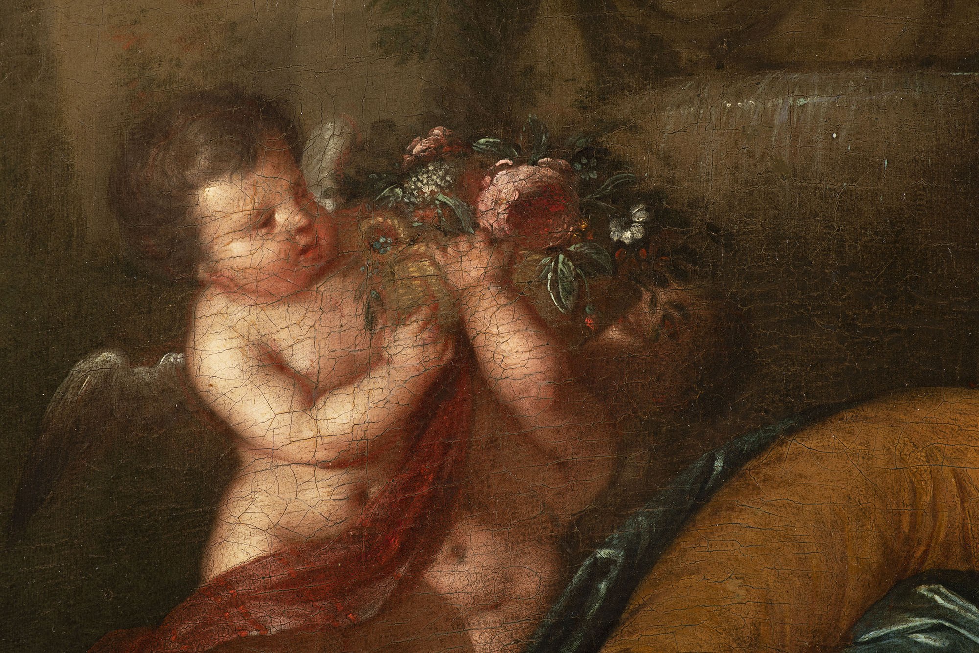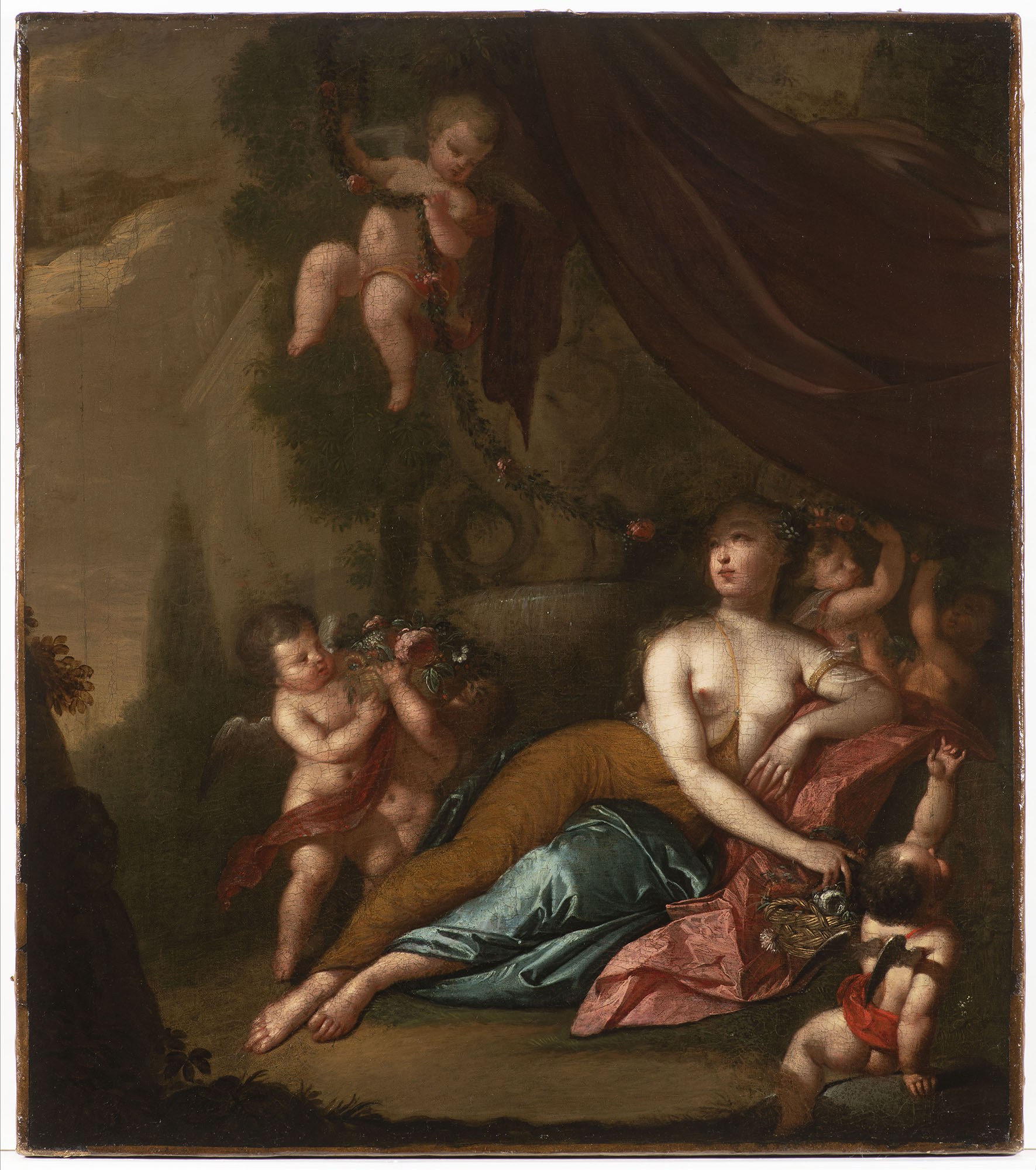 Matthäus Terwesten, the younger brother of Augustin Terwesten (1711–1781), who became the Prussian court painter in Berlin, worked in various places, especially in his hometown of The Hague and in Berlin, where his brother decorated palaces with ceiling paintings. . Venus, surrounded by putti, lies bare-breasted in a park on a red, shiny silk cloth. The purple curtain accentuates and shades the goddess. Venus, dressed in a golden robe and blue mantle, reaches into a basket of flowers and looks up at a putto holding the end of a garland of flowers. The other end is held by two putti in the shadow behind Venus. Two putti carry a large basket of flowers, and in front a putti sits on a stone and looks behind. The surroundings are a park, behind Venus you can see shells and fountain sculptures. The theme breathes the spirit of French Rococo.