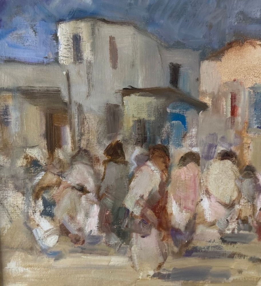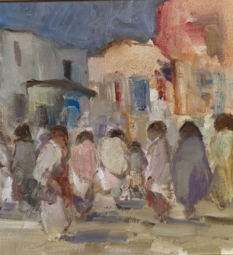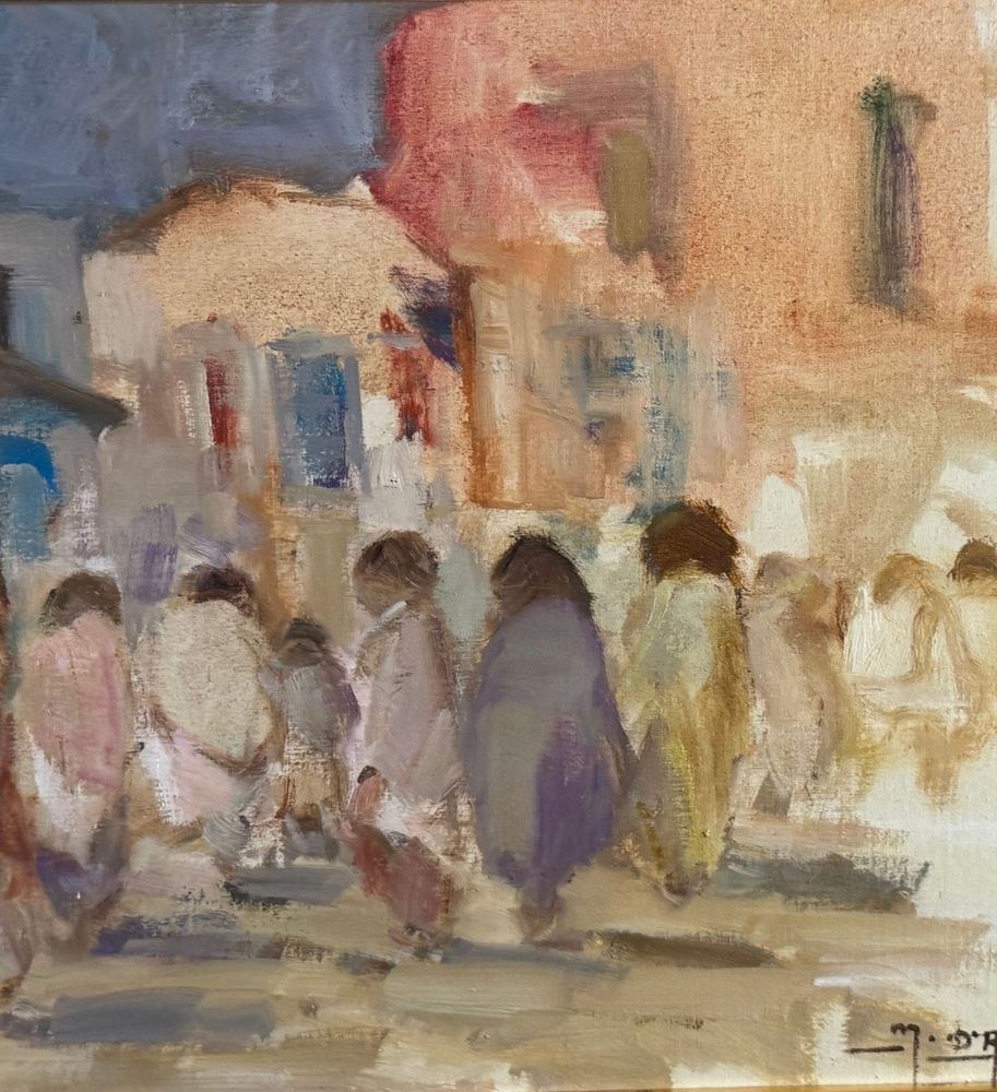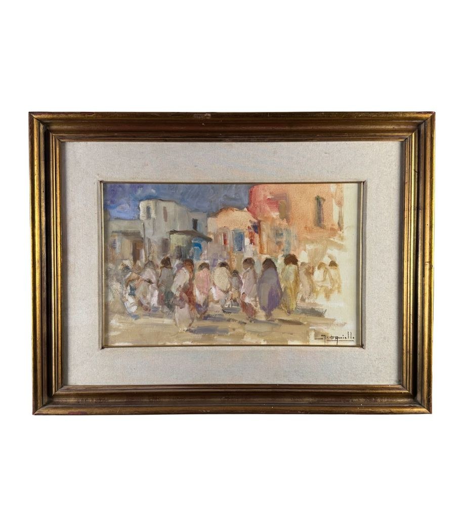 Oil painting on board, 20th century period, Italian school, depicting Figures. Dimensions including frame: 84x64 cm. Dimensions without frame: 57x37 cm. Signed in the lower right corner by Michele D'Aniello. The work is in good condition.