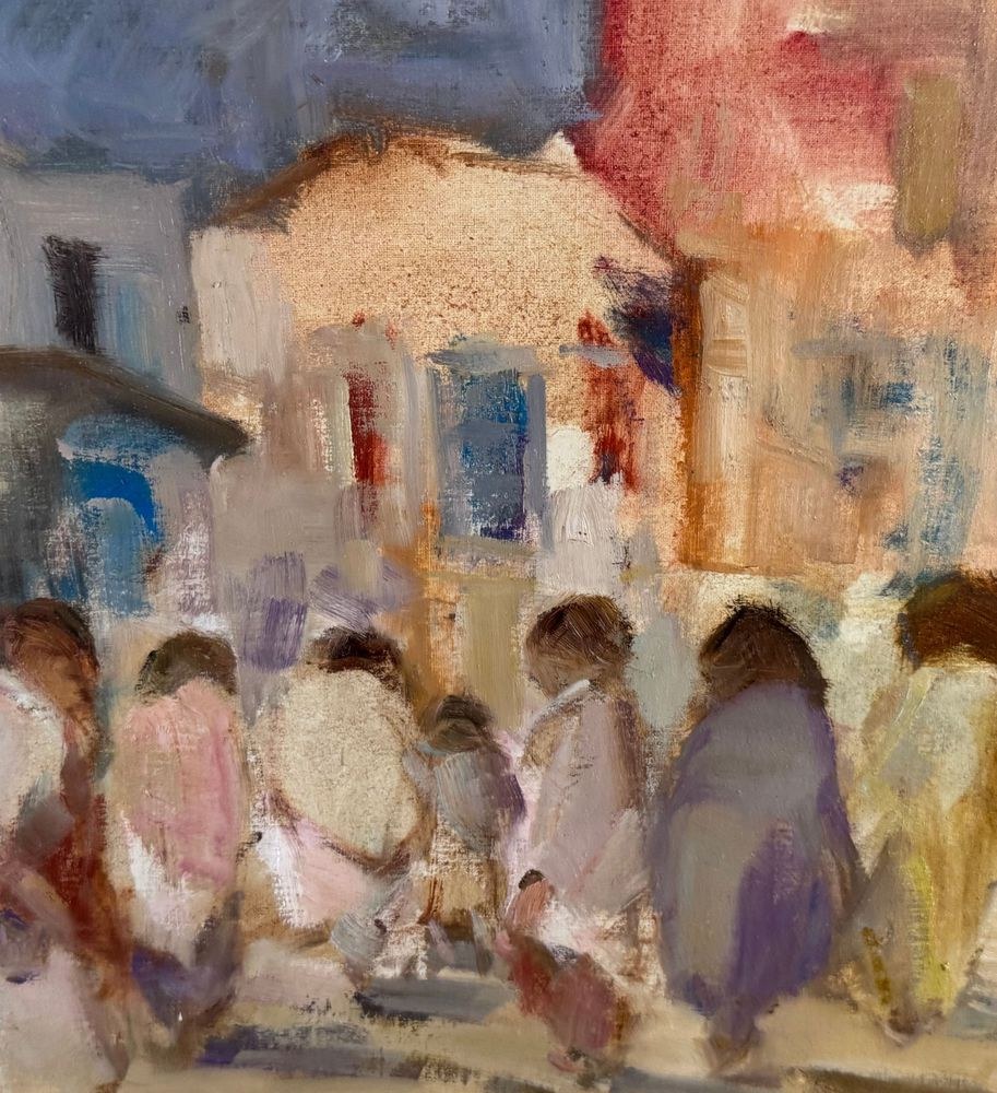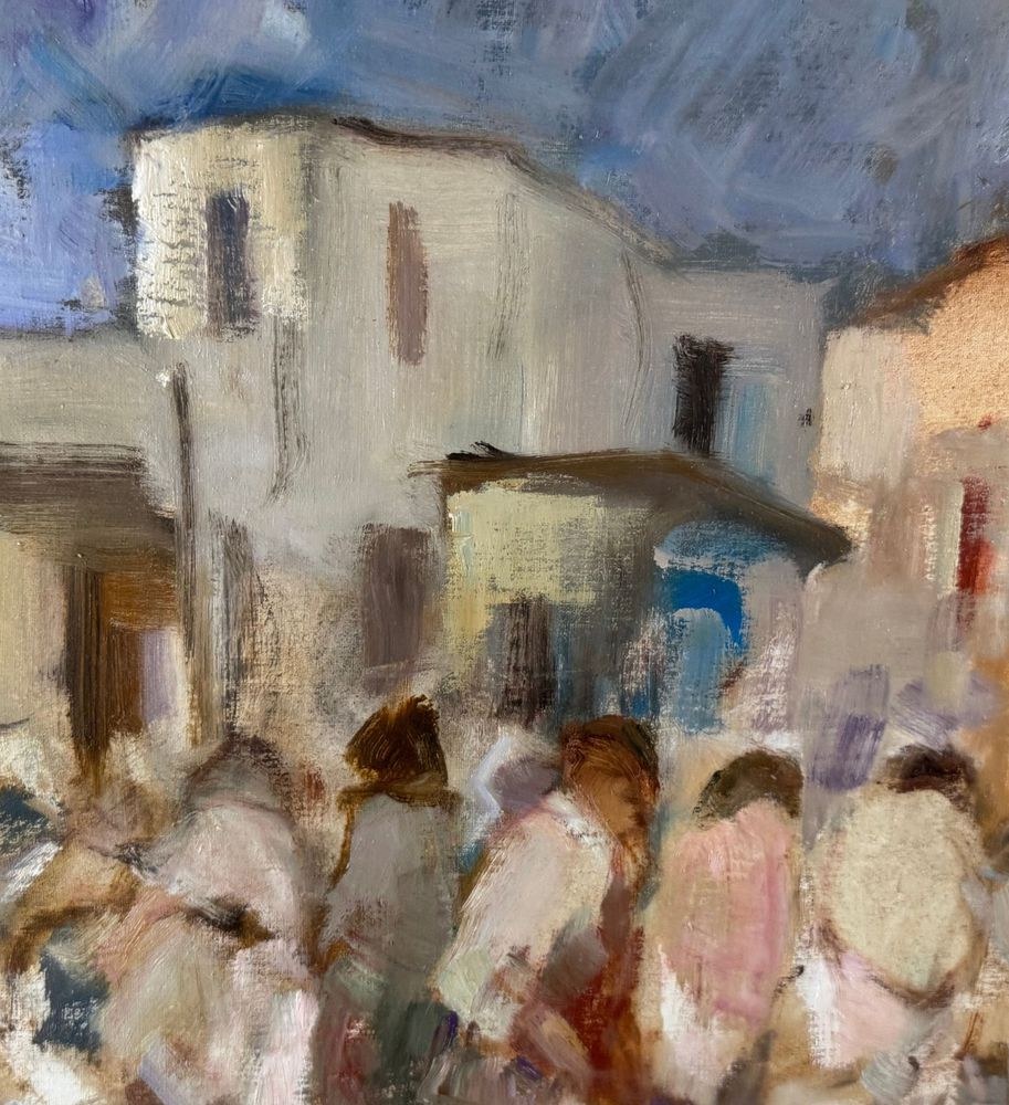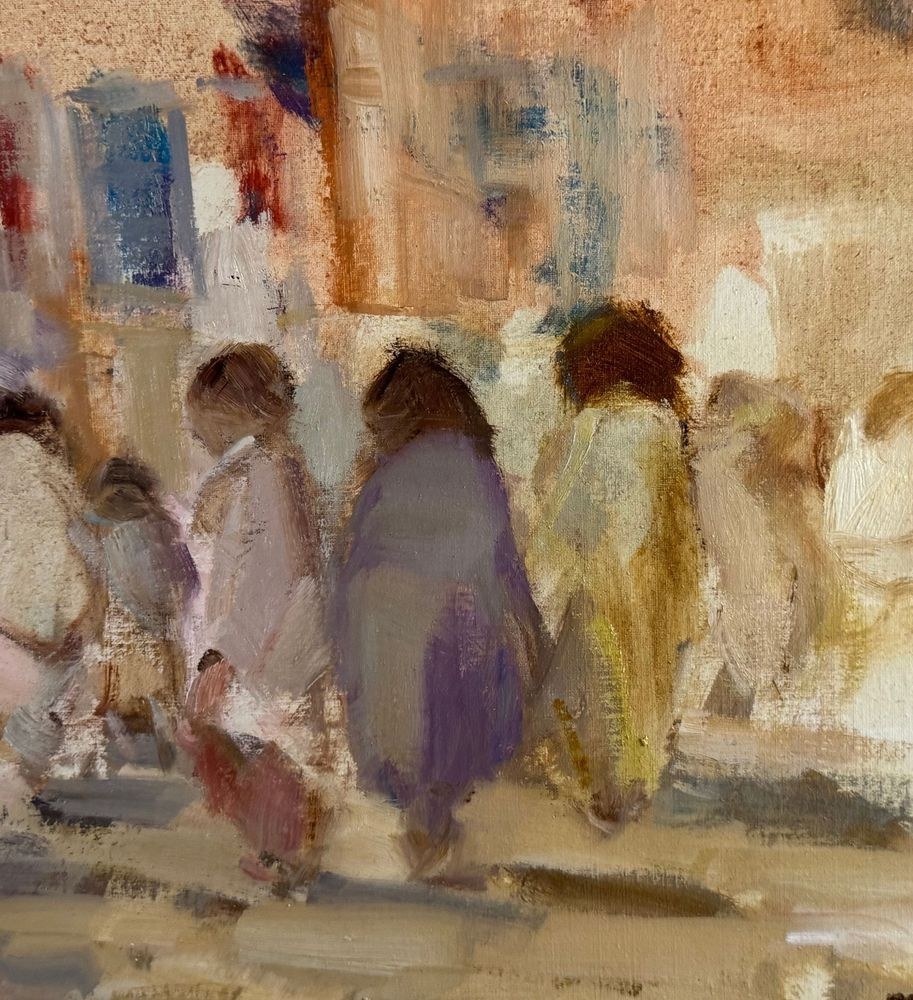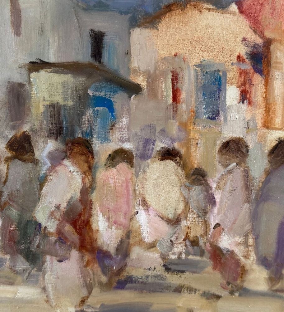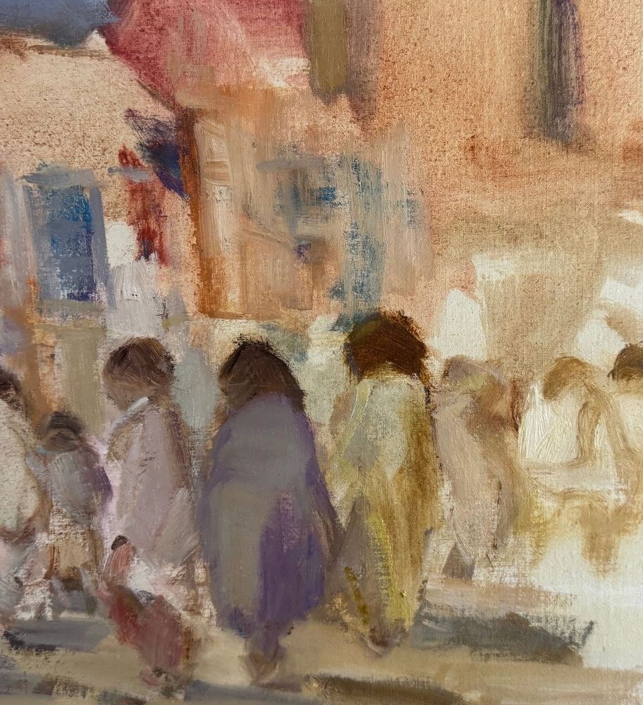 Oil painting on board, 20th century period, Italian school, depicting Figures. Dimensions including frame: 84x64 cm. Dimensions without frame: 57x37 cm. Signed in the lower right corner by Michele D'Aniello. The work is in good condition.